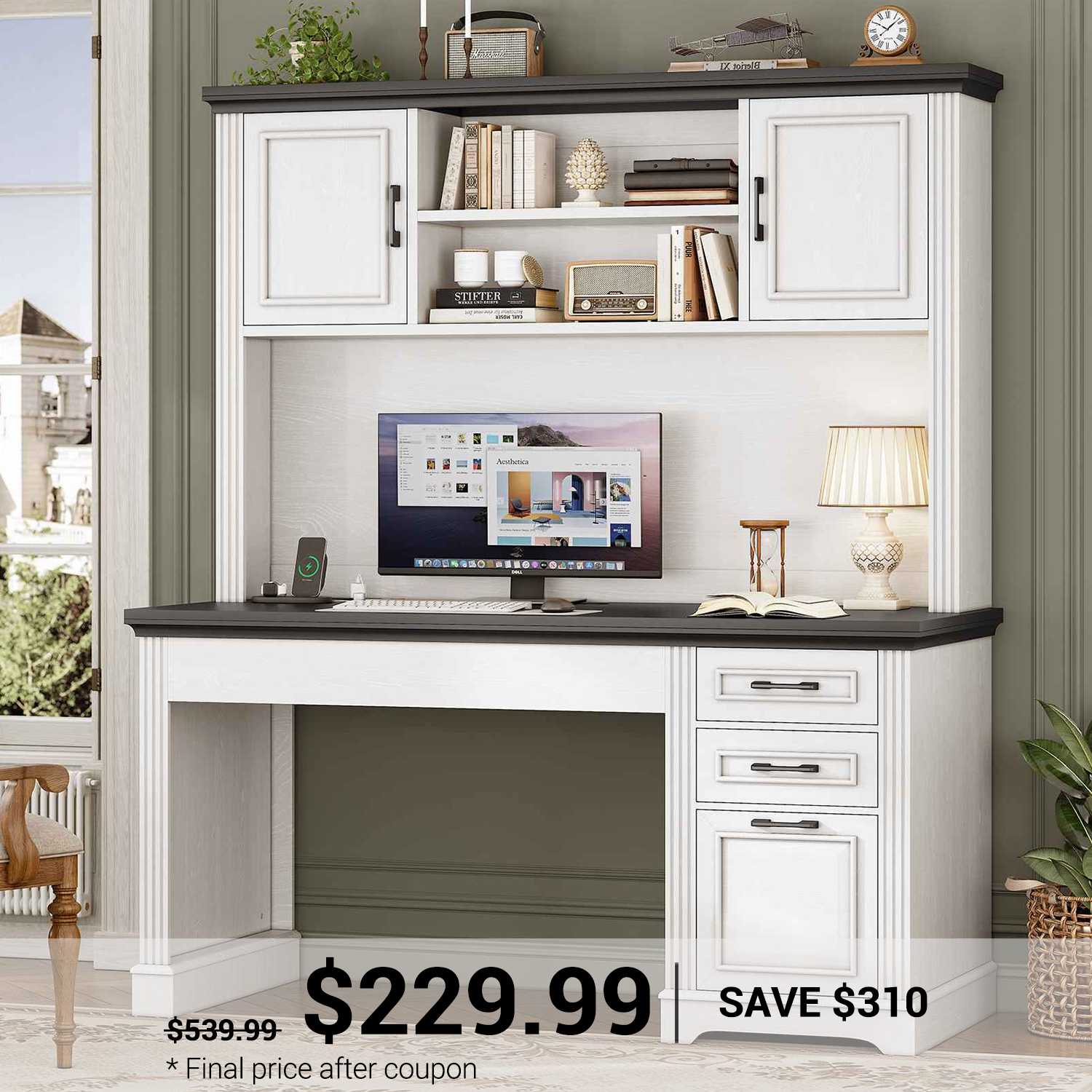 •【Spacious Design】This computer desk features a large work surface, hutch, and drawers for ample storage and organization. The desktop size is 47.2"L*21.7" W. The computer desk provides ample space for files, computers, printers. It features 3 drawers and storage cabinet which can accommodate a large number of files, books, and other office essentials. Three additional drawers feature metal runners and safety stops to keep you and your family safe.