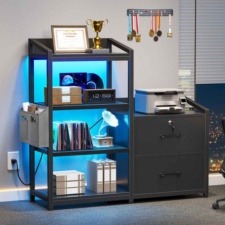 【2 Drawer File Cabinet】35.4" File Cabinet, a versatile and functional storage solution for your home or office. This filing cabinet features 2 drawers that can accommodate letter, legal, A4 size documents, keeping your workspace organized and clutter-free. 4-tier storage shelf and storage bag keep your home office supplies in tidy and well free up your workspace. 【Convertible Open Shelf】The 4-tier shelves can be place left or right according to your needs. The sleek design incorporates a convenient open shelf, perfect for displaying decorative items or storing frequently accessed files. This file cabinet can be used as a file cabinet, bookshelf, filing cabinet, display shelf or printer stand for your home office. 【Large Storage Space】The 35.4" L x 15.6"W file cabinet is perfect for your home office. 4-tier shelf tall file cabinet provides enough room to hold bookshelf, printer, photocopier, etc. And side storage bag can hold books, file for your home office. The file cabinet provide enough room for home office. 【Power Outlet】This file cabinet is equipped with 2 AC outlets, 2 USB charging ports to provide power for up to 4 devices simultaneously. Power outlet allows you to charge cell phones, tablets, notebook, etc. This file cabinet with storage can easily keep the living room tidy. 【Cool & Smart LED Light Strips 】The filing cabinet comes with RGB LED light strip, remote control via APP, Over 60000 colors and 29 flashing modes for your to choose. Led light strip with music sync function, built-in sensitivity adjustable mic, led light color will change with the rhythm of the sound and music.