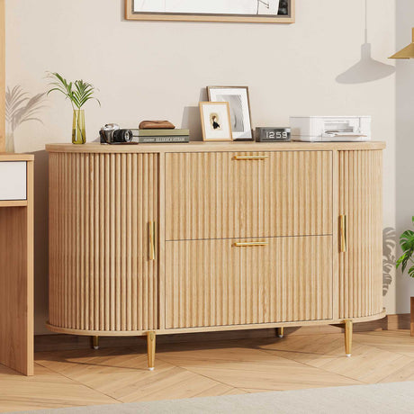 The wooden striped shape is paired with metal handles and tapered legs to create a light and luxurious style.