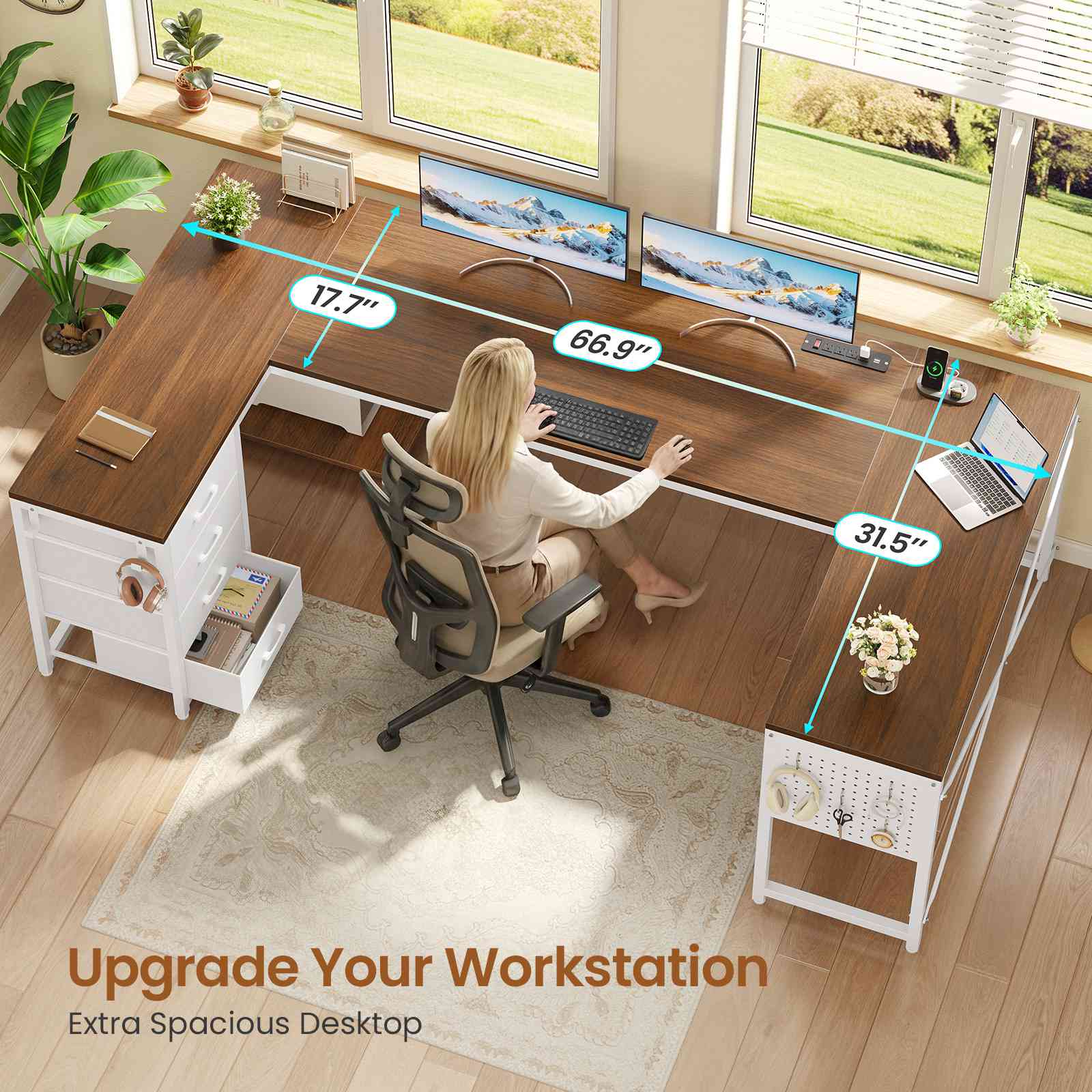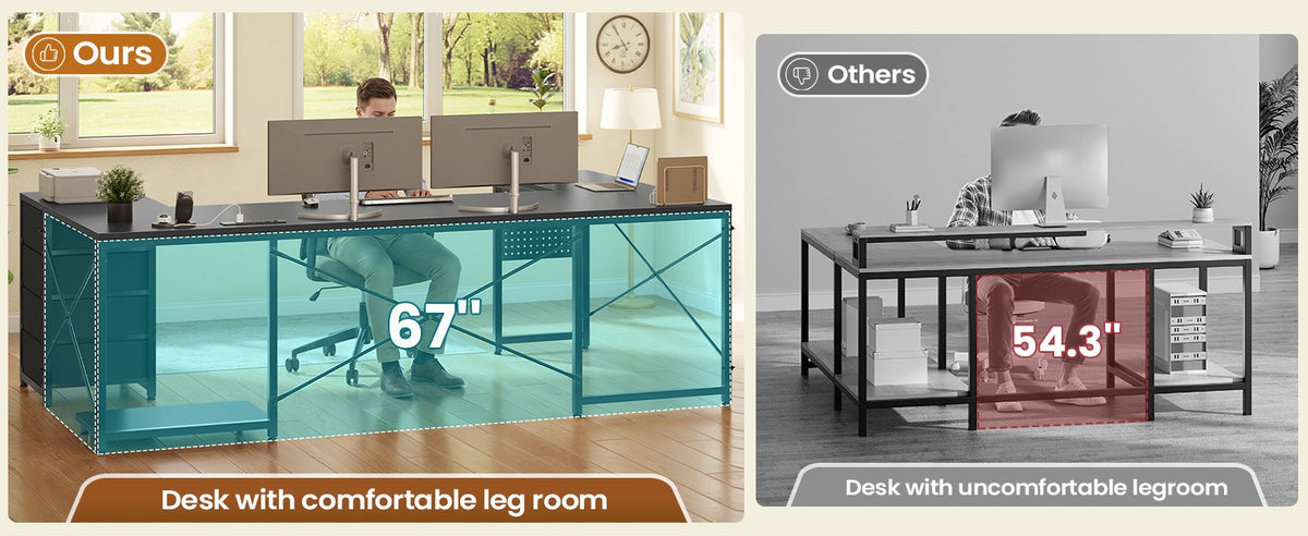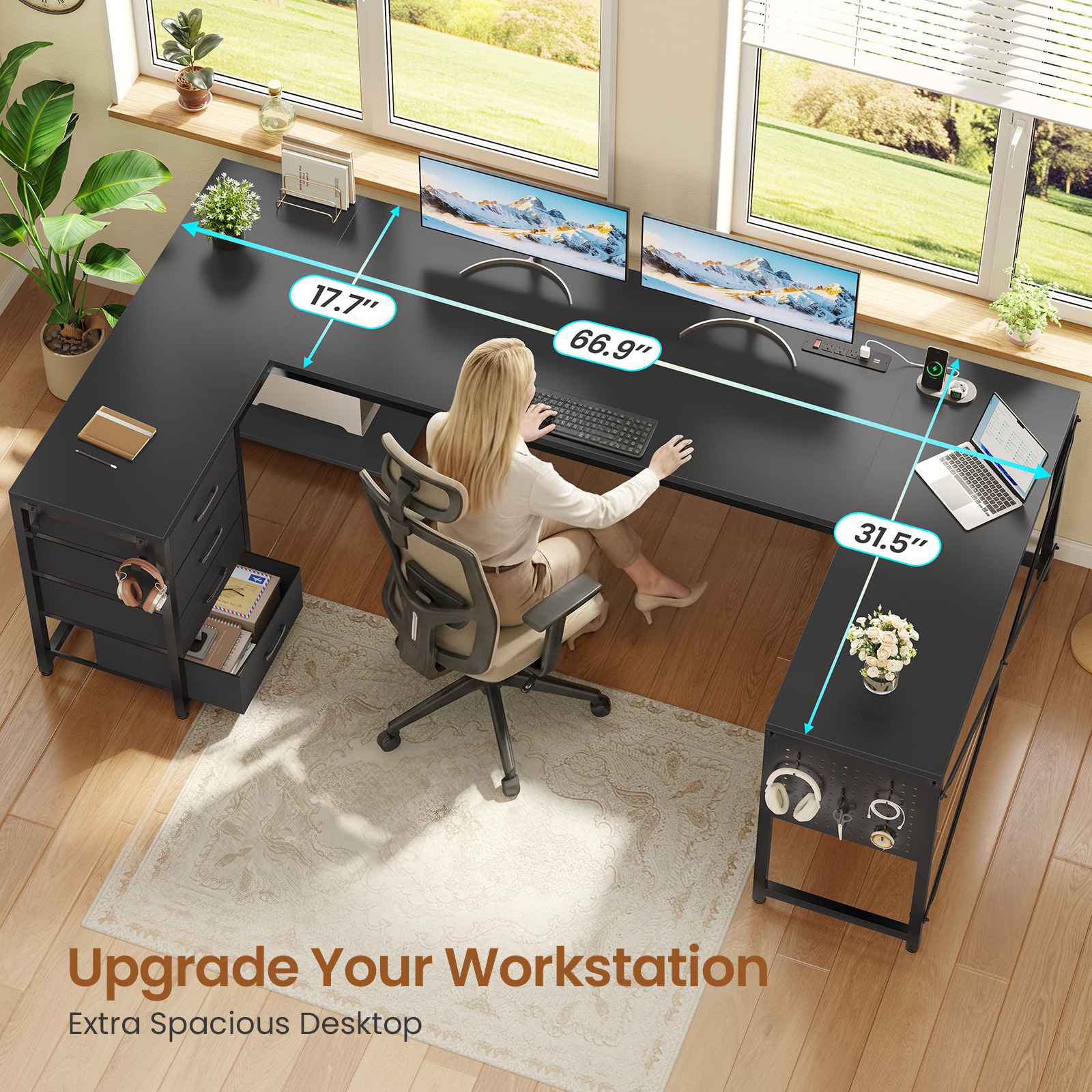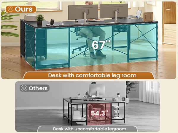 •【What You Get】 67" U shaped desk comes with 4 fabric drawers, pegboard, power outlet, CPU Stand, 2 L hooks, 4 S hooks. The u shape corner desk could hold 2-3 desktop computers and 1 notebook computer. An ideal computer desk for small rooms to create excellent home office space. Pegboard can be DIY and have more space to place your other items.