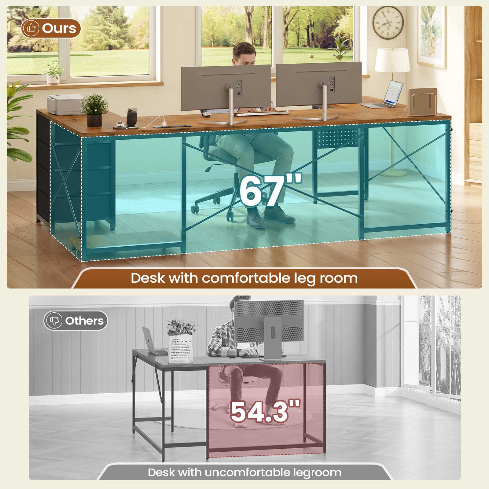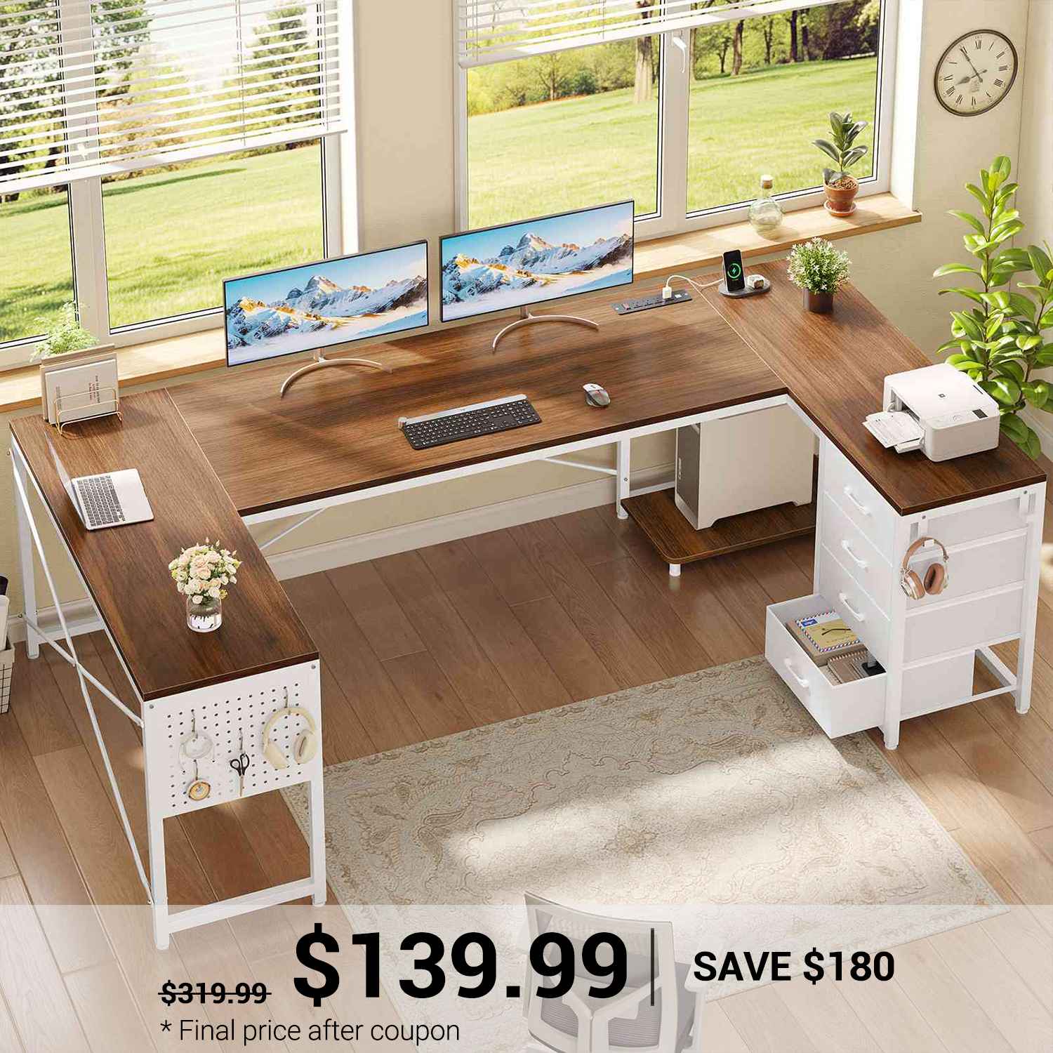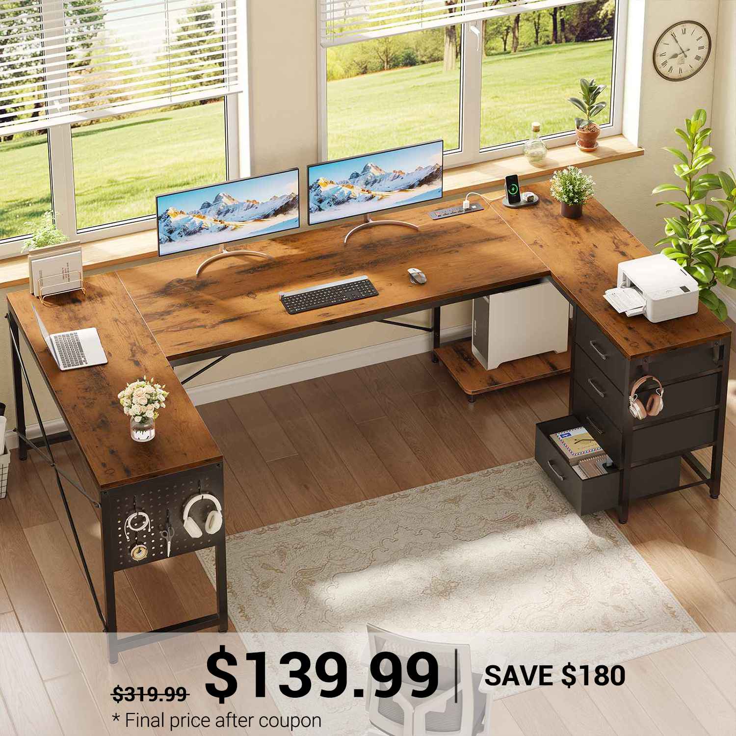 •【What You Get】 67" U shaped desk comes with 4 fabric drawers, pegboard, power outlet, CPU Stand, 2 L hooks, 4 S hooks. The u shape corner desk could hold 2-3 desktop computers and 1 notebook computer. An ideal computer desk for small rooms to create excellent home office space. Pegboard can be DIY and have more space to place your other items.