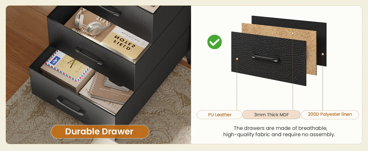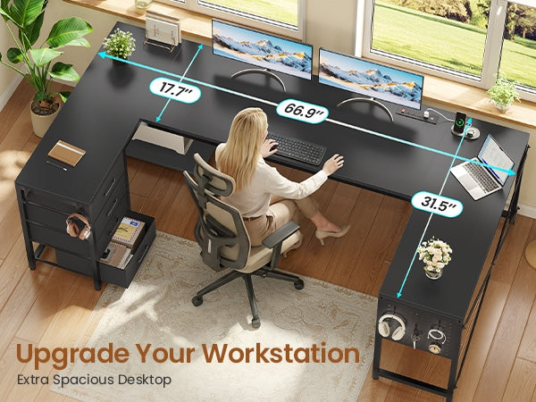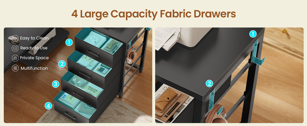 •【4 Fabric Drawers & CPU Stand】 The SEDETA L shaped computer desk provides 4-tier easy to assemble fabric drawers and CPU shelf, drawers are made of breathable high-quality fabric, lightweight and easy to install, which gives you plenty of under-desk storage space to help you store your books, work files and small office stuffs, make your work and study more efficient.