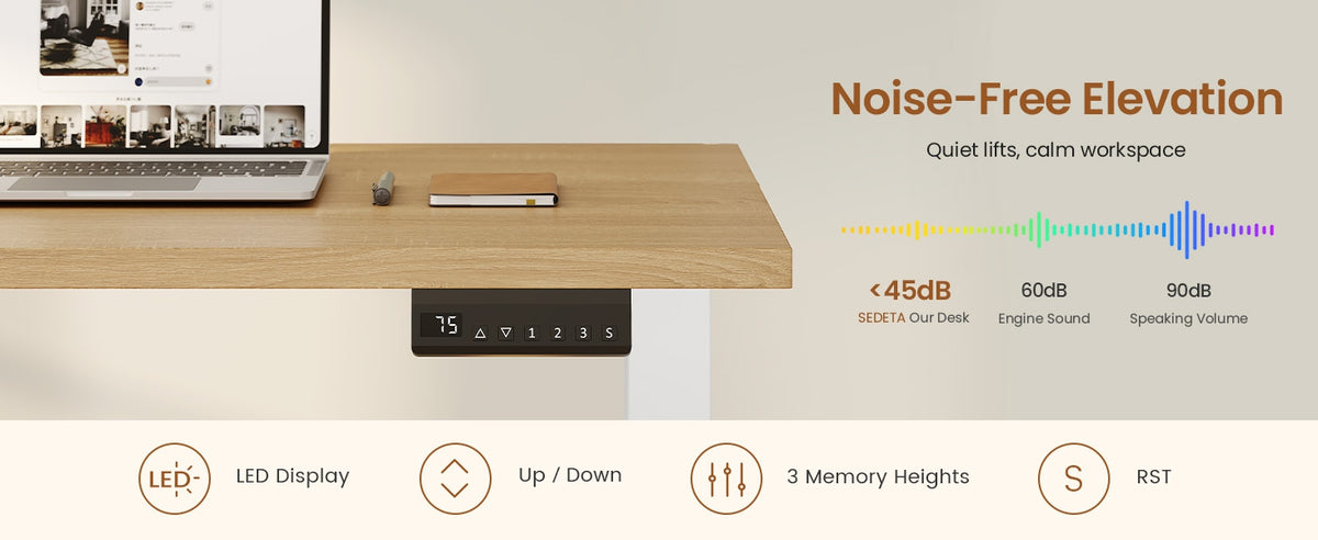 • Adjustable Height Desk: L-shaped, height 29.5"–46.8", 3 presets, LED display.