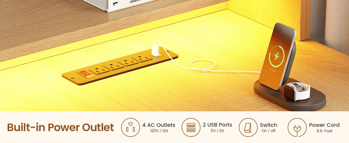 • Charging & LED Lighting: Built-in power strip (4 outlets, 2 USB), RGB LED with 60,000+ colors, 29 modes, music sync.