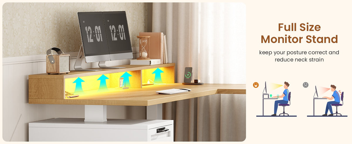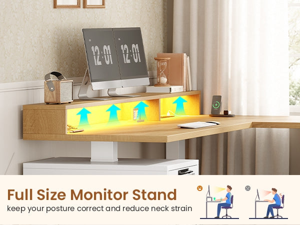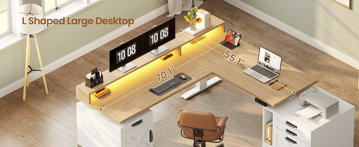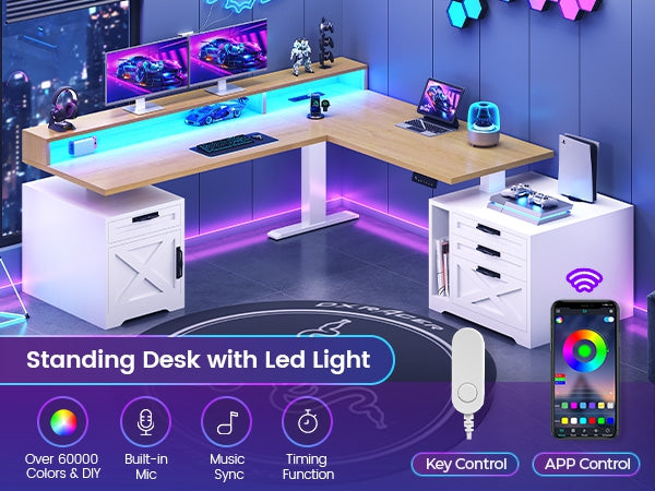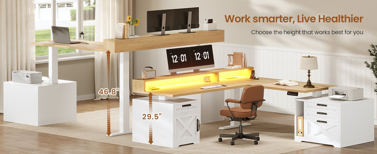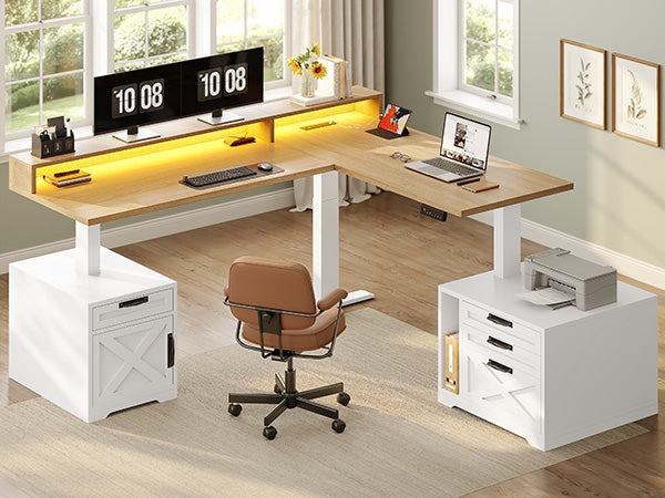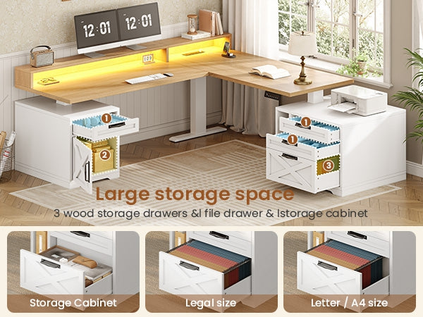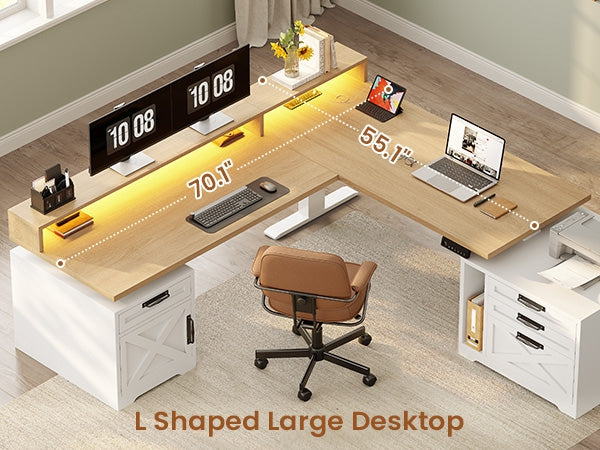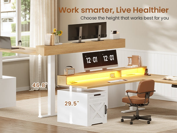 【Adjustable Height Standing Desk】Featuring a sleek LED display, this adjustable l shaped standing desk offers 3 customizable height presets and precision up-and-down controls. This standing desk with storage allows you to switch between sitting and standing at the press of a button, with an adjustable height range from 29.5" to 46.8". Say goodbye to sedentary habits and hello to improved focus, energy, and posture with this electric standing desktangled wires. 【Ample Storage Space】This standing desk with draewrs features an L-shaped design, maximizing space utilization.Coming with 1 file drawer, 3 drawers, 1 storage cabinet. File cabinet can hold letter/A4/legal files. This solid constructed l shaped standing desk could hold printers, scanners, fax machines and any other office machines, keeps printer or scanner within easy reach of your desk to free up work space. 【For Health】Designed with an ergonomic structure, the monitor shelf significantly alleviates pressure on the back and neck. Its elevated design liberates substantial desktop area, preventing a cluttered or cramped feel. Additionally, the shelf accommodates books, stationery, and other essentials. The combination of a monitor stand and an adjustable desk upgrade maximizes your comfort in the office environment. 【Charging Port & Smart Led Light】This farmhouse standing desk includes a built-in power strip with 4 outlets, 2 USB ports for charging all your gear—phones, tablets、printer or phone—plus a master switch for safe power control. Integrated smart RGB LED lighting offers 60,000+ colors and 29 dynamic modes, syncs to music via an adjustable mic, and is controllable via remote or app for immersive gameplay or vibrant home office energy. 【Built to Last with Exceptional Stability】The industrial-grade steel frame and T-shaped design of the stand up home office desk support up to 200 lbs. Desktop made of P2 particle board, sturdy durable and anti-scratched. And powered by a robust yet quiet motor (operating at less than 45 DB). If your item arrives damaged, scratched or missing part, please feel free to contact us, we will send you free replacement or offer a partial refund.