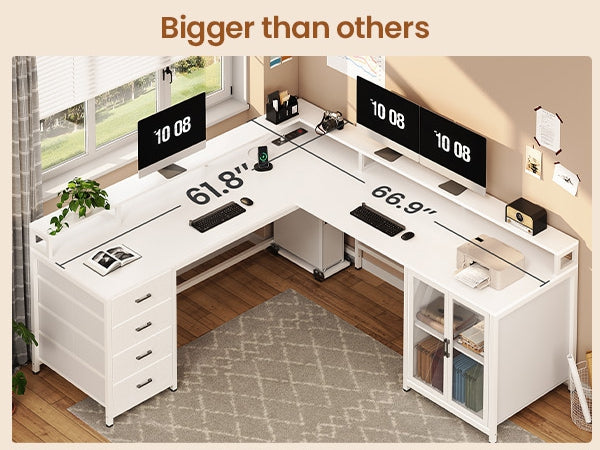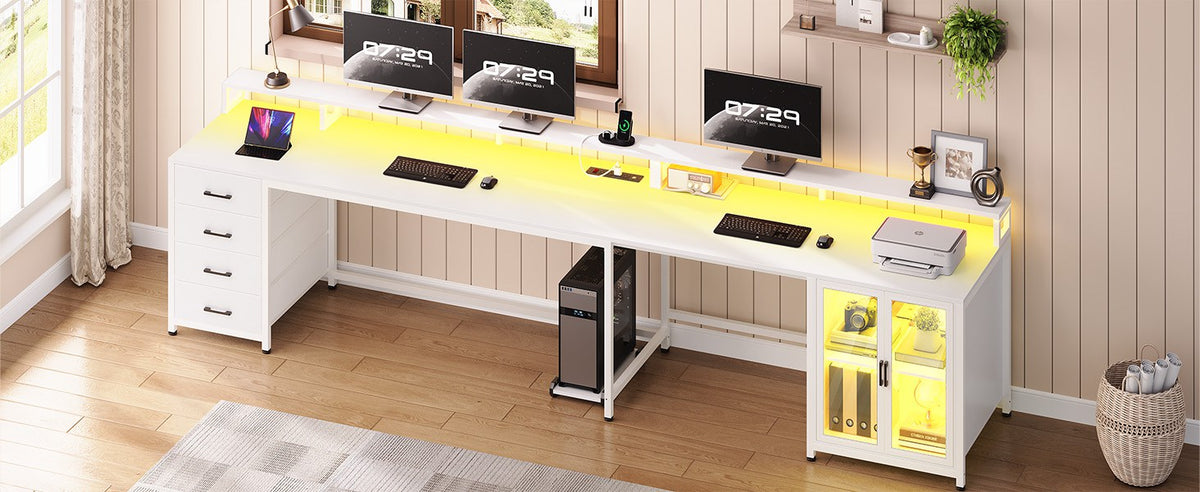 •【Spacious Desktop & Reversible Design】The L-shaped computer desk can be installed as a Two Person Desk as needed. The 109 inch long size allows two people to work side by side without affecting the space. The large desktop provides enough space for 3 monitors, laptops, and printers. 4 drawers and display cabinets can be placed on the left or right side according to your needs, perfectly adapting to your room.
