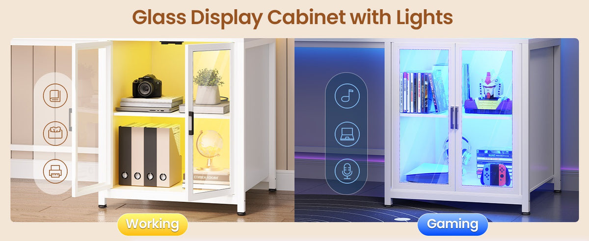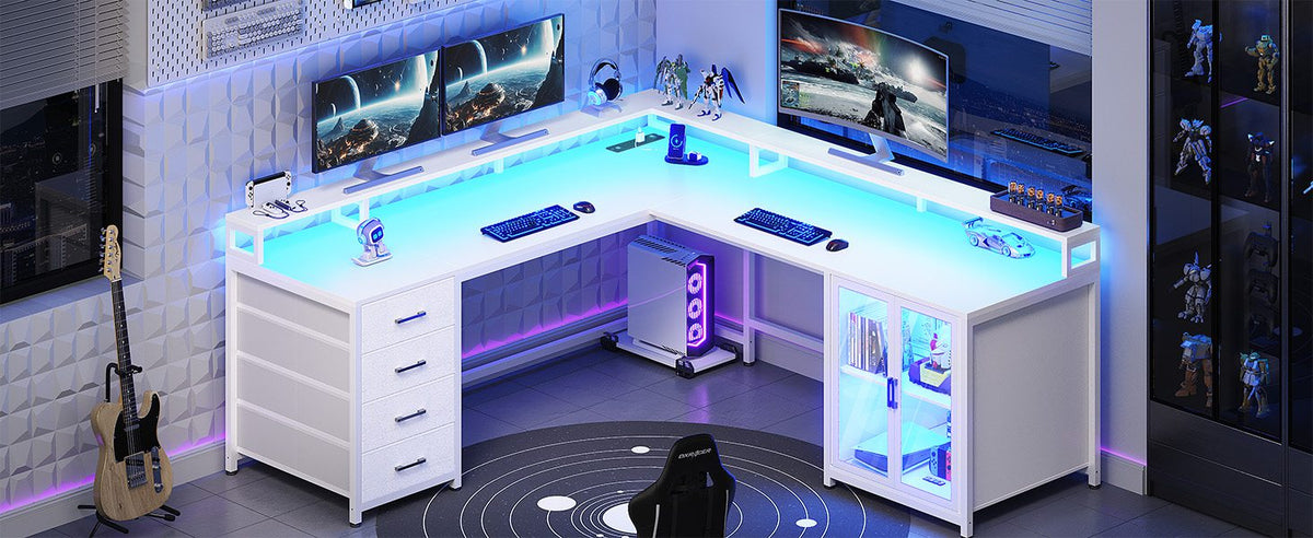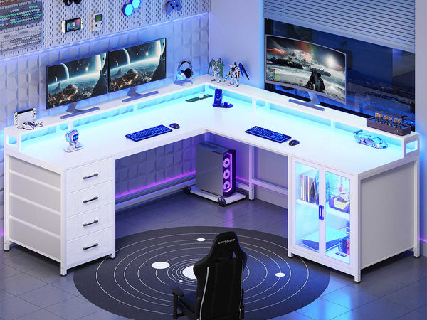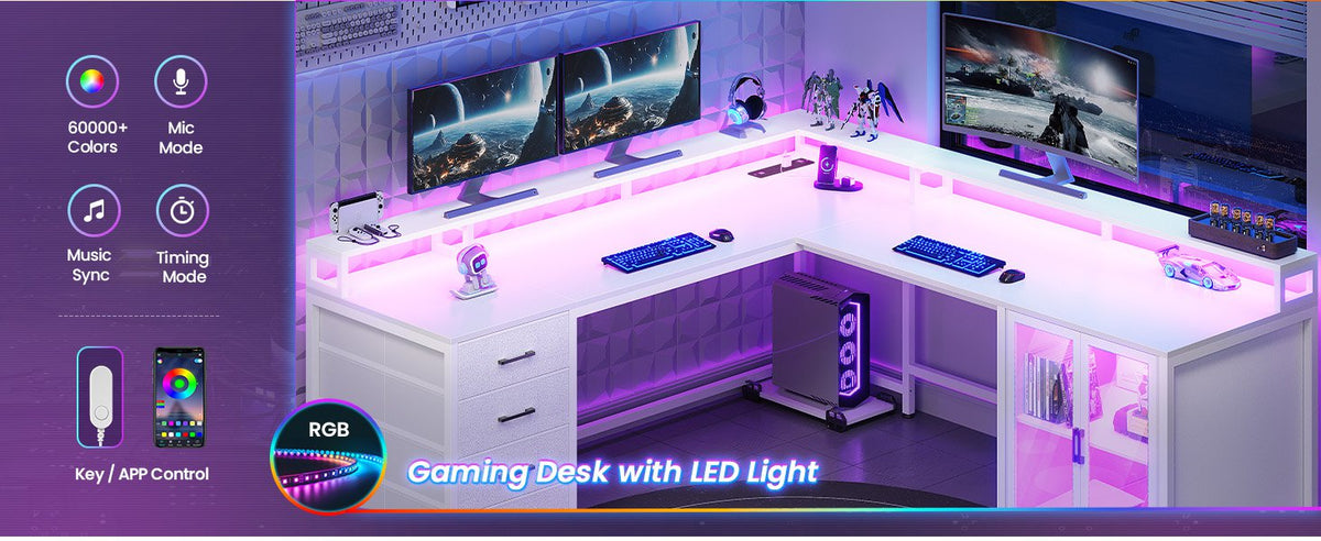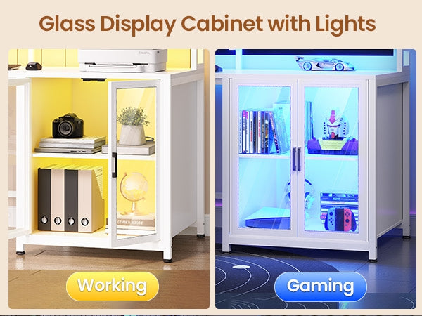 •【Display Cabinet & Led Light】This L-shaped gaming desk features a large display cabinet with LED lighting, offering ample space to showcase your decorations, photo albums, collectibles, and more. The cabinet doors protect items from dust while allowing you to clearly admire your displays. The Sedeta home office desk comes with RGB LED light strip, remote control via APP, Over 60000 colors and 29 flashing modes for your to choose.
