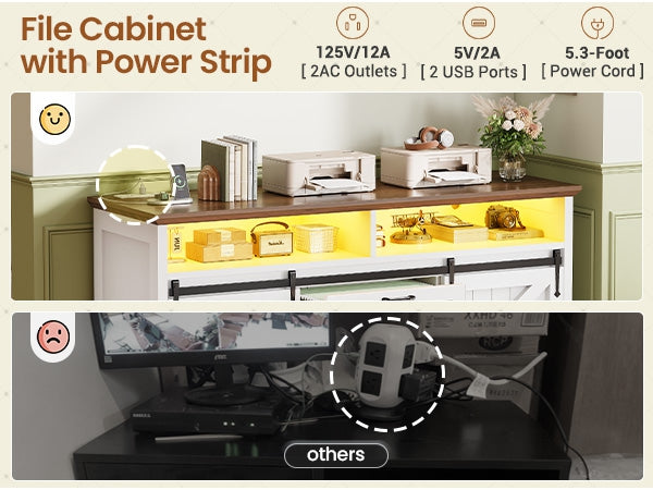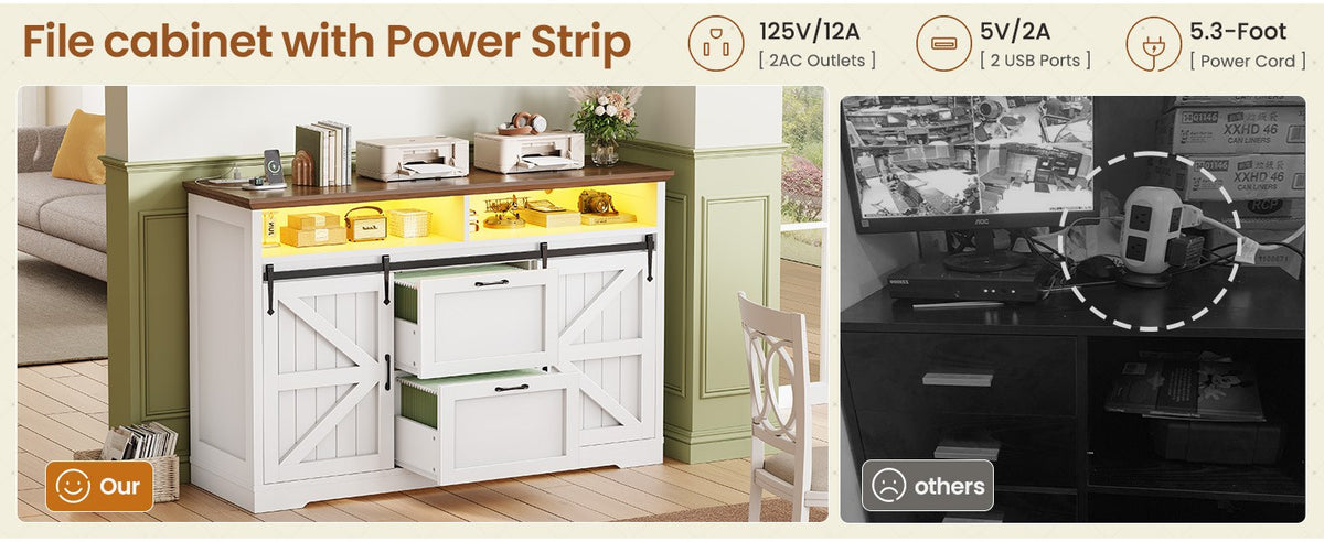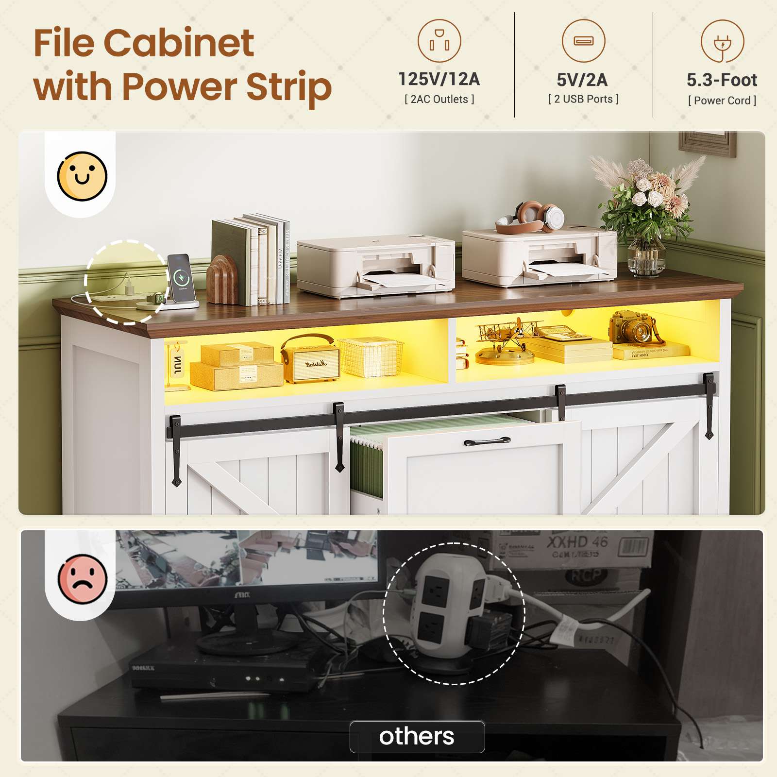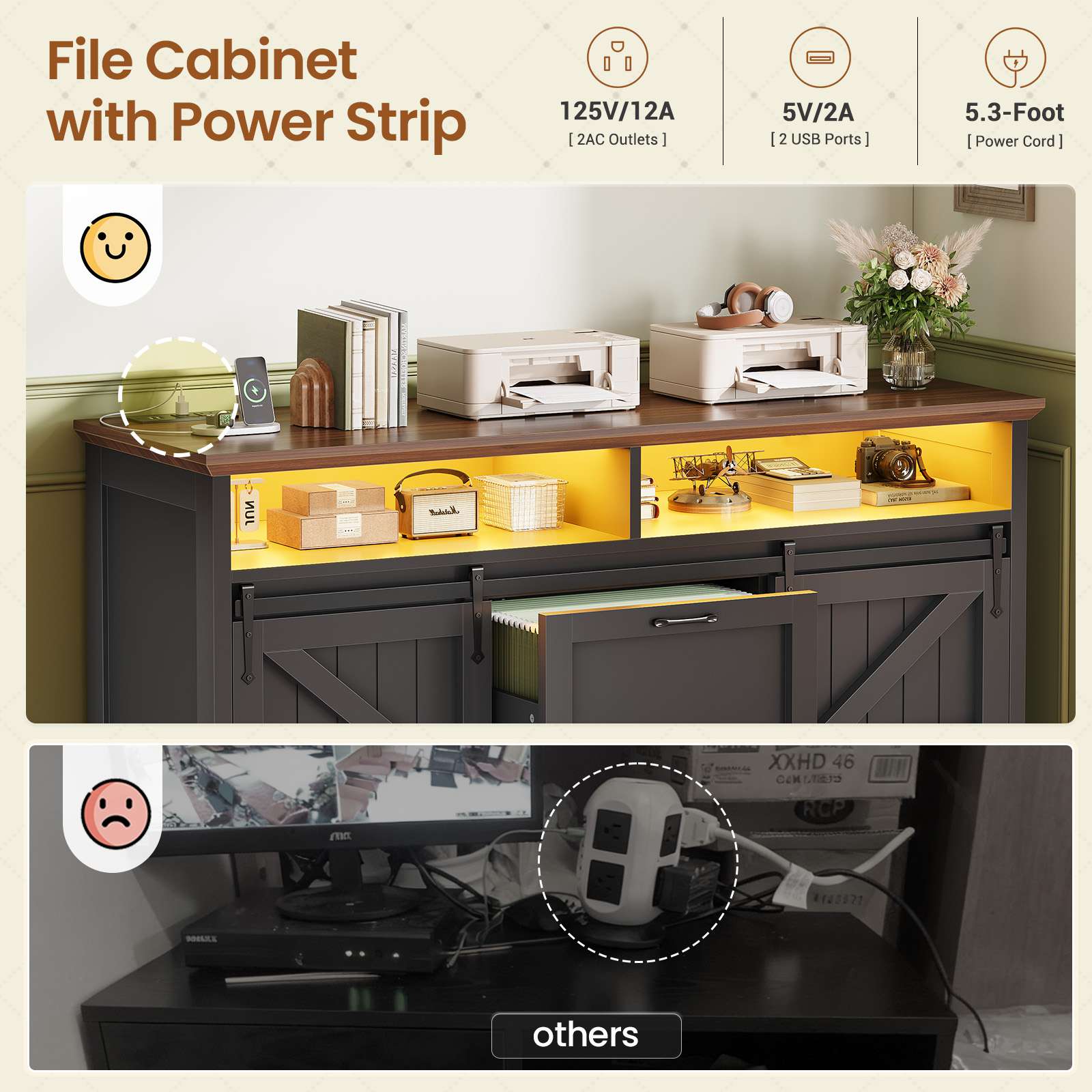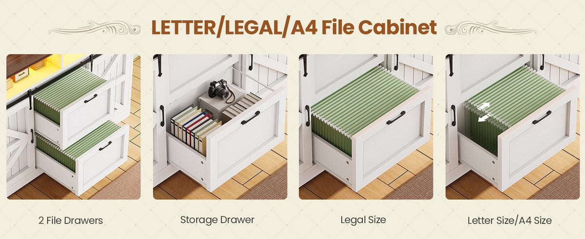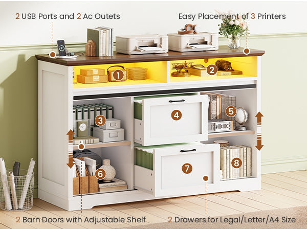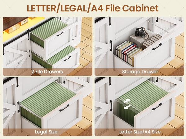 •【What Can You Get?】 The file cabinet has 2 file drawers for Legal, Letter, A4 sizes standard file, power strip for charging 4 devices at the same time, spacious desktop(47.2"L) large enough for printers and scanners, 4 storage shelves, a pair of sliding barn door for protecte documents and LED light. Filing cabinet that can be combined with any computer desk to form an L-shaped office area.