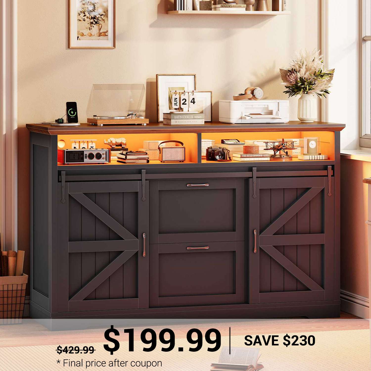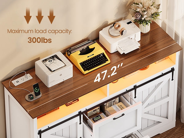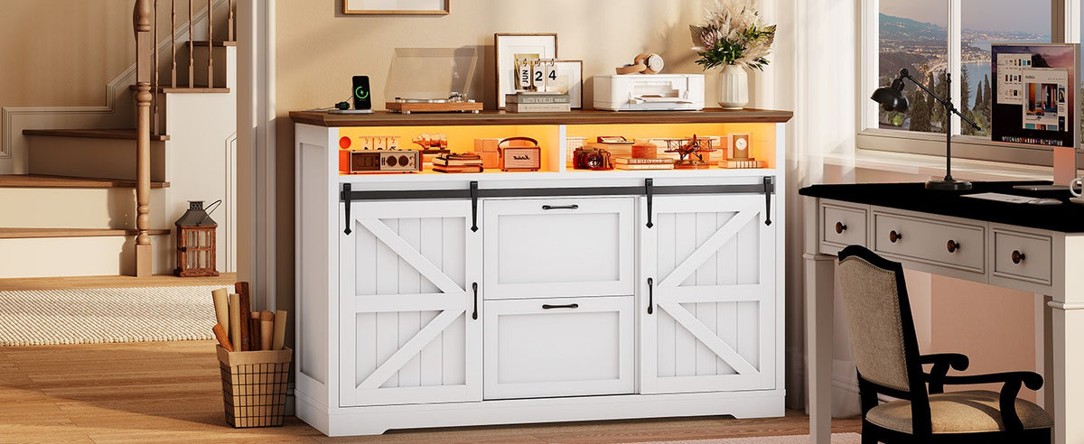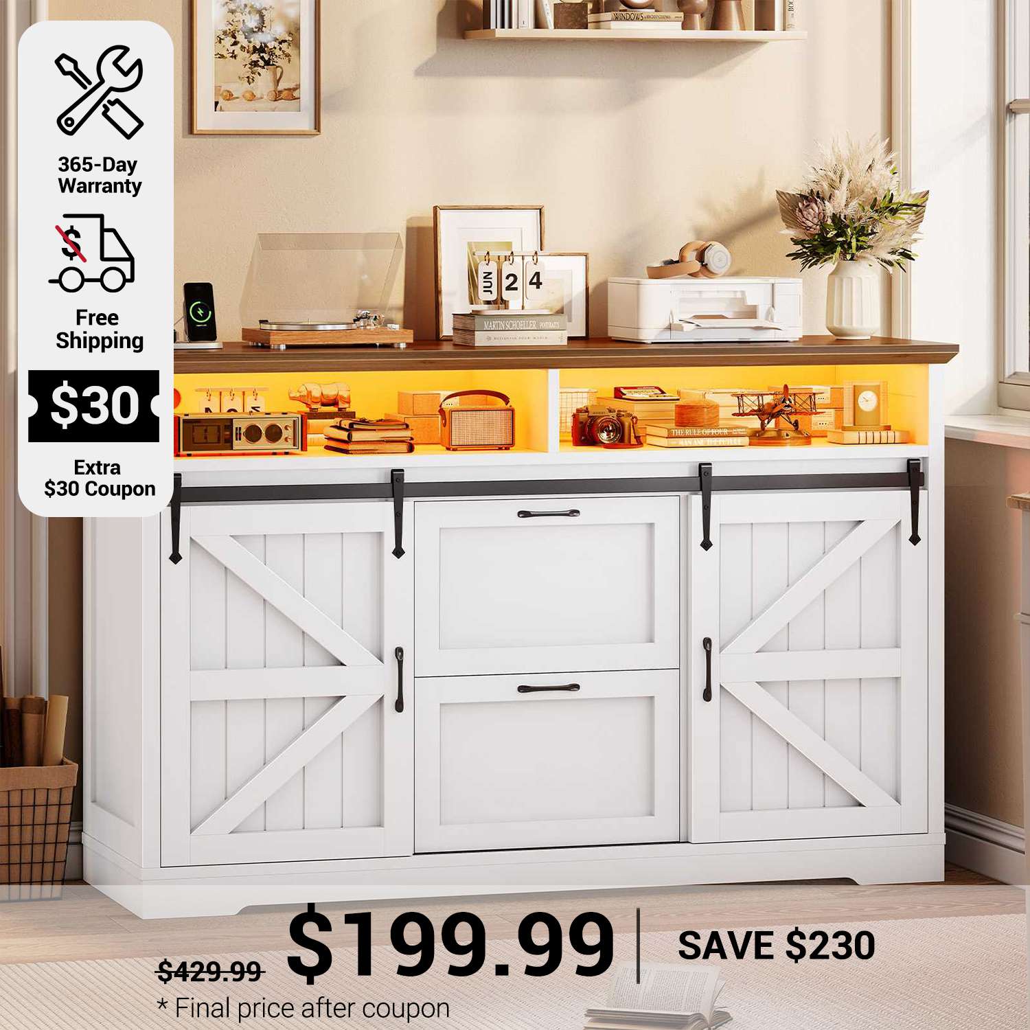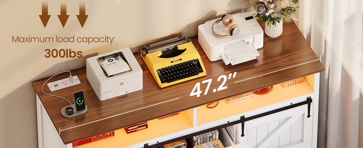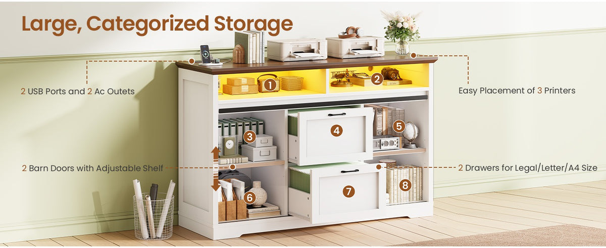 •【What Can You Get?】 The file cabinet has 2 file drawers for Legal, Letter, A4 sizes standard file, power strip for charging 4 devices at the same time, spacious desktop(47.2"L) large enough for printers and scanners, 4 storage shelves, a pair of sliding barn door for protecte documents and LED light. Filing cabinet that can be combined with any computer desk to form an L-shaped office area.