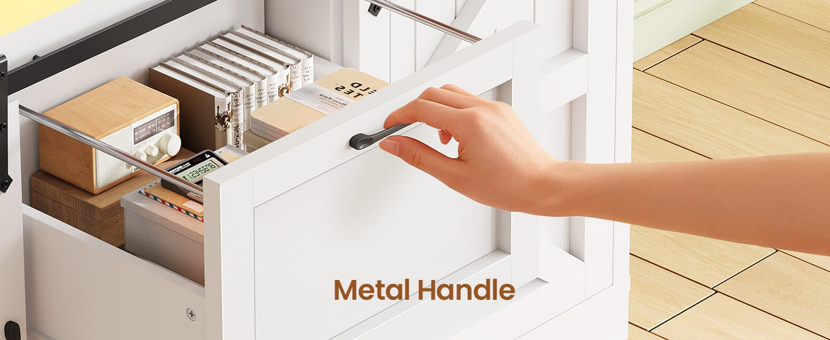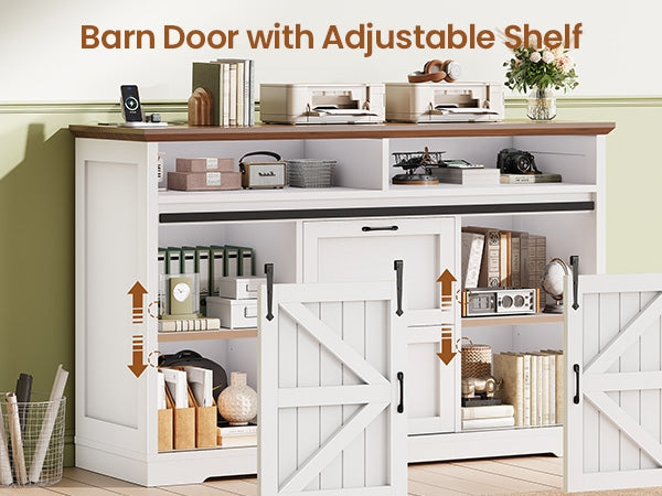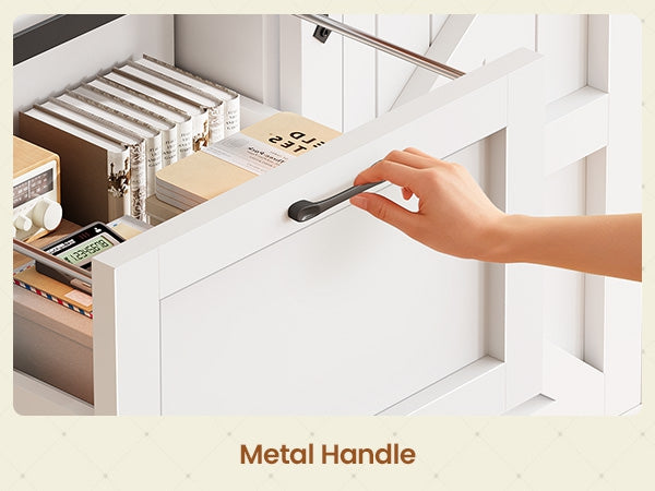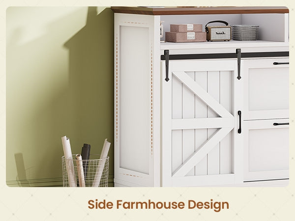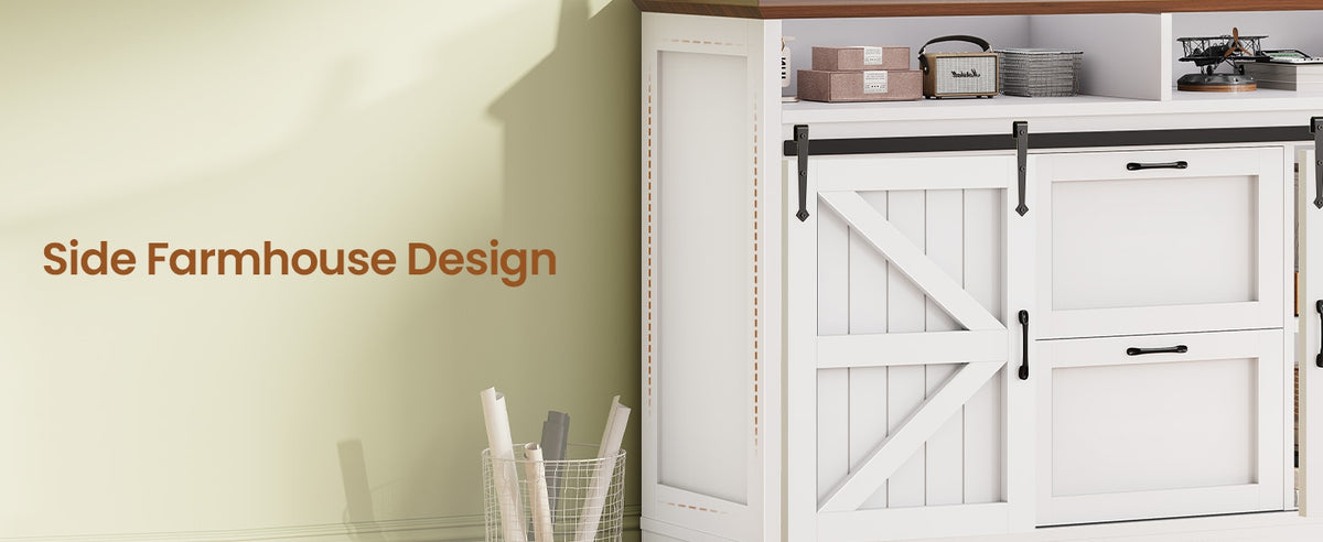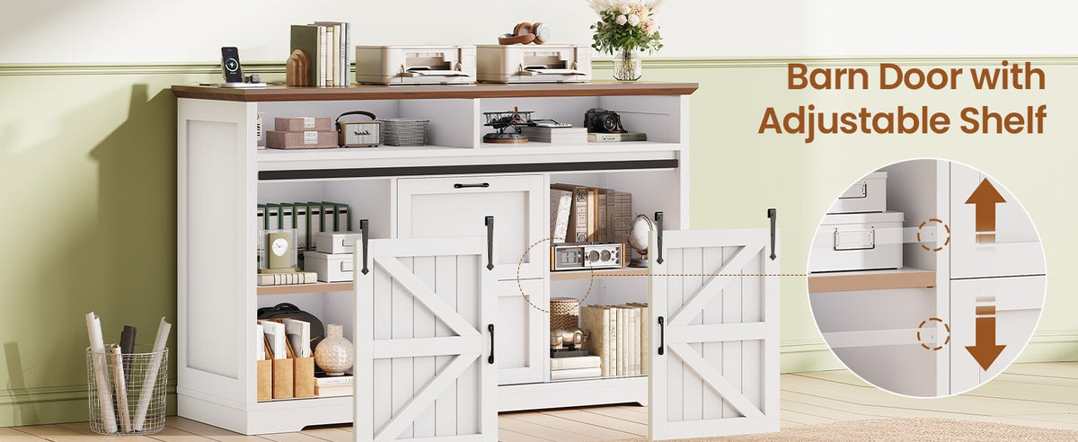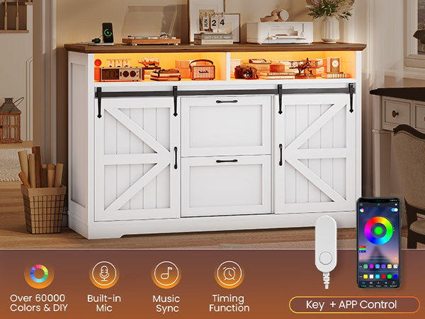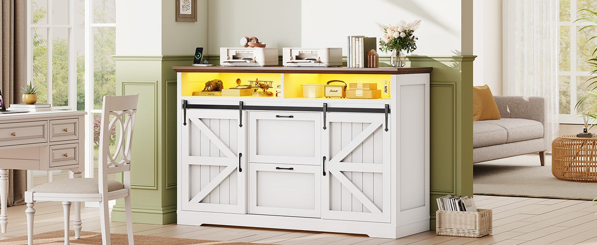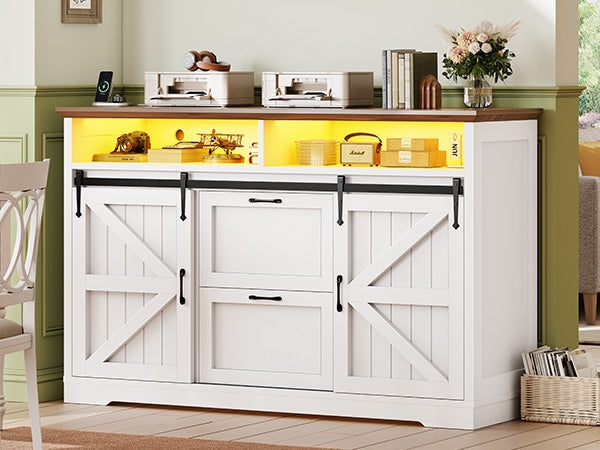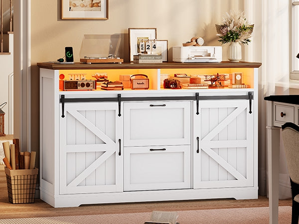 •【What Can You Get?】 The file cabinet has 2 file drawers for Legal, Letter, A4 sizes standard file, power strip for charging 4 devices at the same time, spacious desktop(47.2"L) large enough for printers and scanners, 4 storage shelves, a pair of sliding barn door for protecte documents and LED light. Filing cabinet that can be combined with any computer desk to form an L-shaped office area.