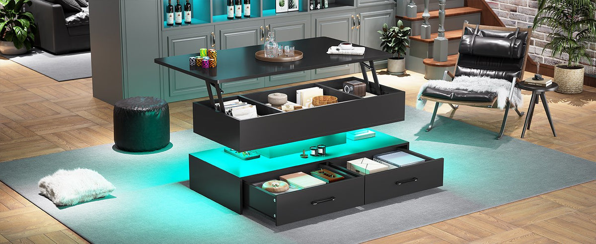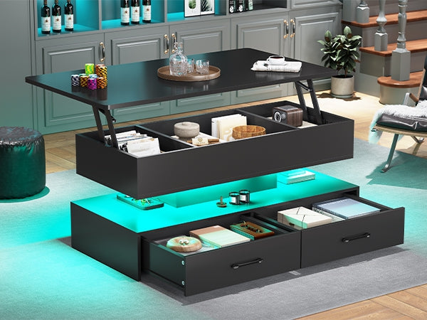1 hidden compartments allow you to easily organize hidden sundries for a clutter-free living room. 1 big open shelf underneath the coffee table keeps your often-used items handy and tidy. 2 drawers are provided for convenient storage.
