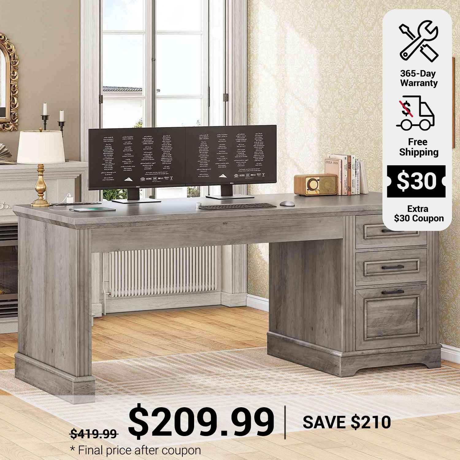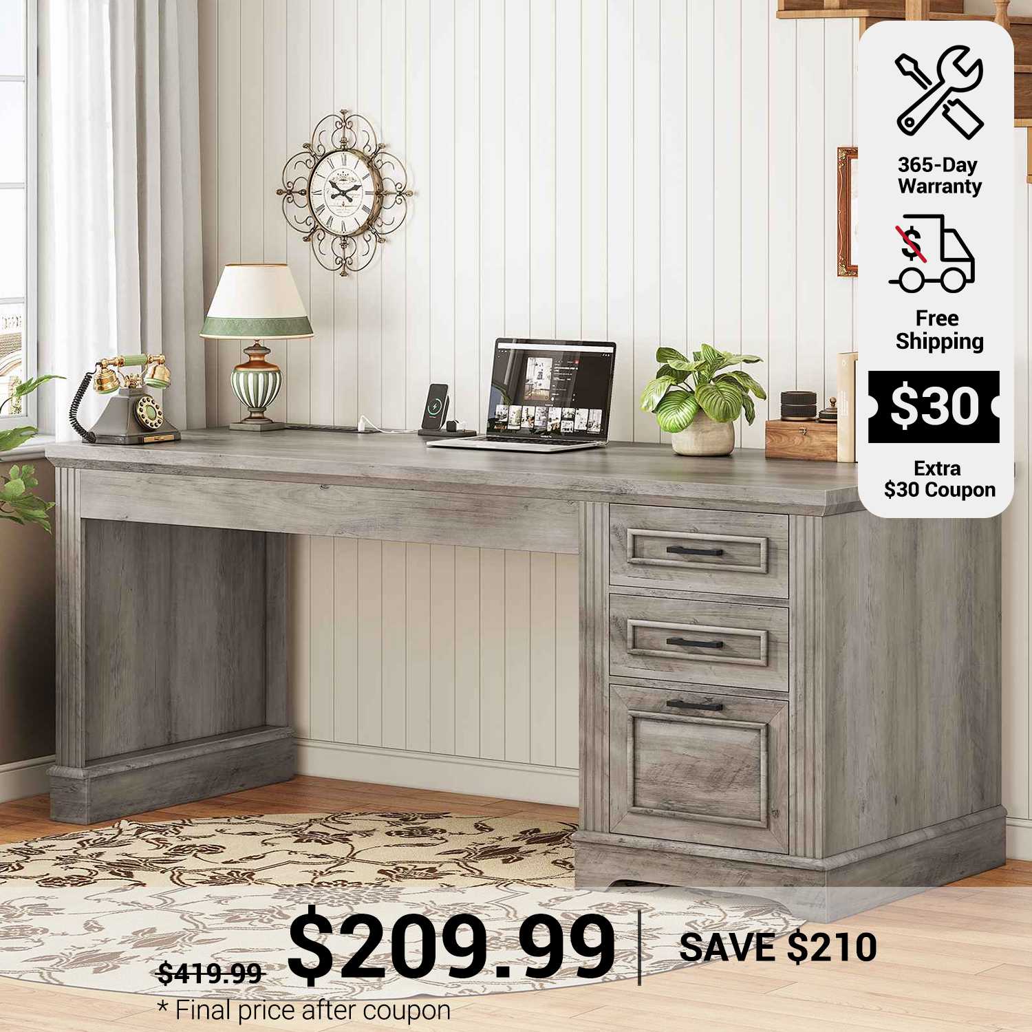 •【Spacious space】This Executive office desk has a spacious desktop. The desktop size is 55"L*21.7"W. The computer table provides ample space for files, computers, printers. It features 3 drawers&storage cabinet which can accommodate a large number of files, books, and other office essentials. Three additional drawers feature metal runners and safety stops to keep you and your family safe