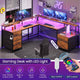 •【User Friendly】The L shaped computer desk includes a built-in power strip with 4 outlets & 2 USB Ports provides convenience for charging your gaming gear, tablet、printer or phone.Don't worry about not having enough power sockets. Also includes an on-off switch, thanks to the on-off switch, one-button power off to ensure safe electricity use, which strengthens security.