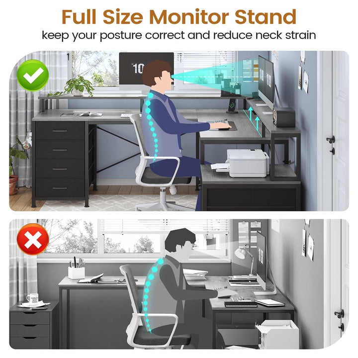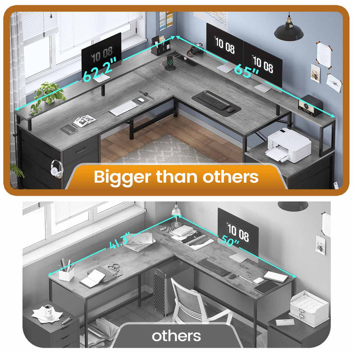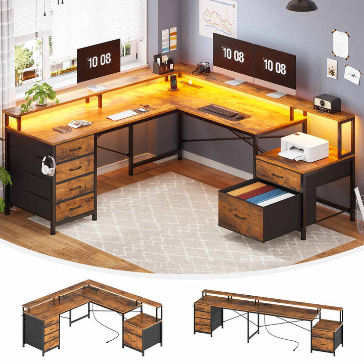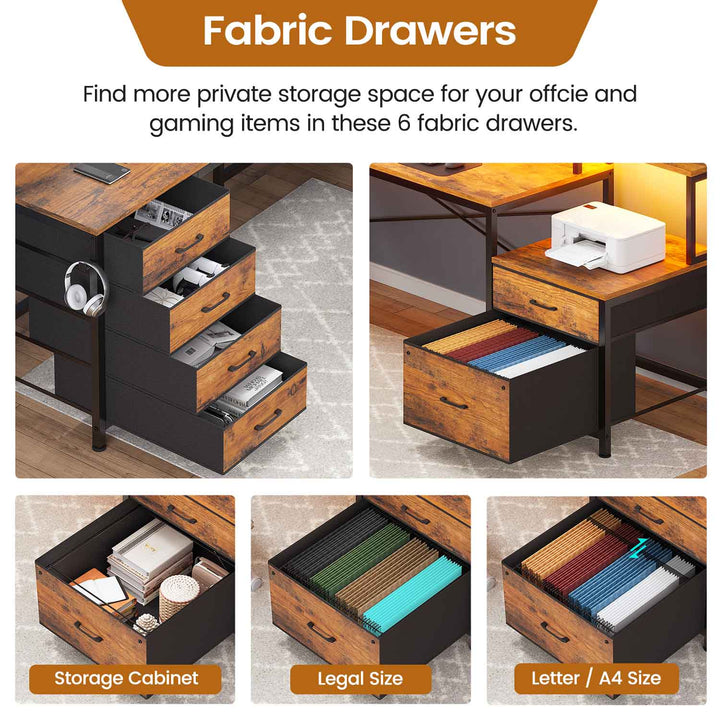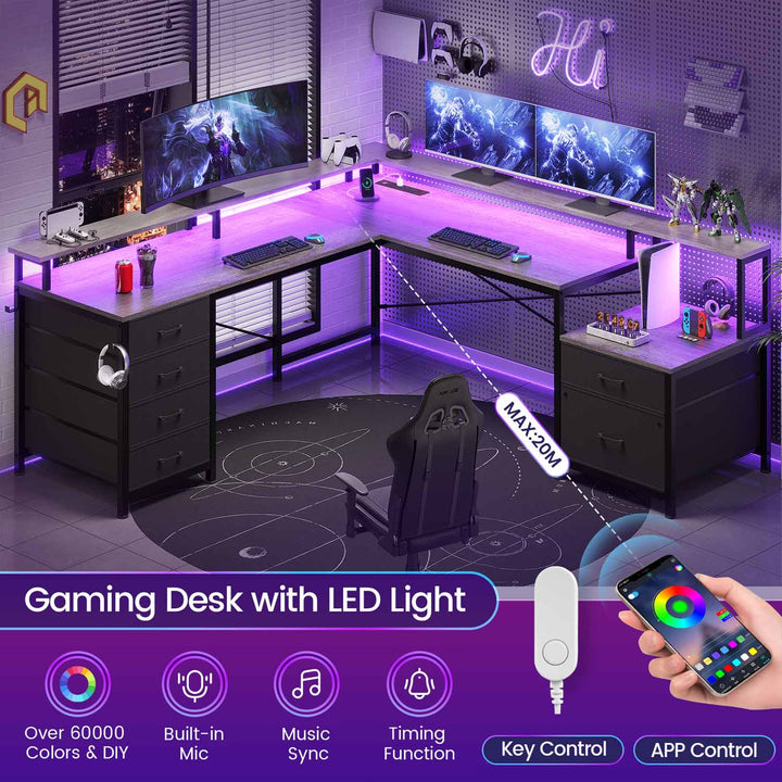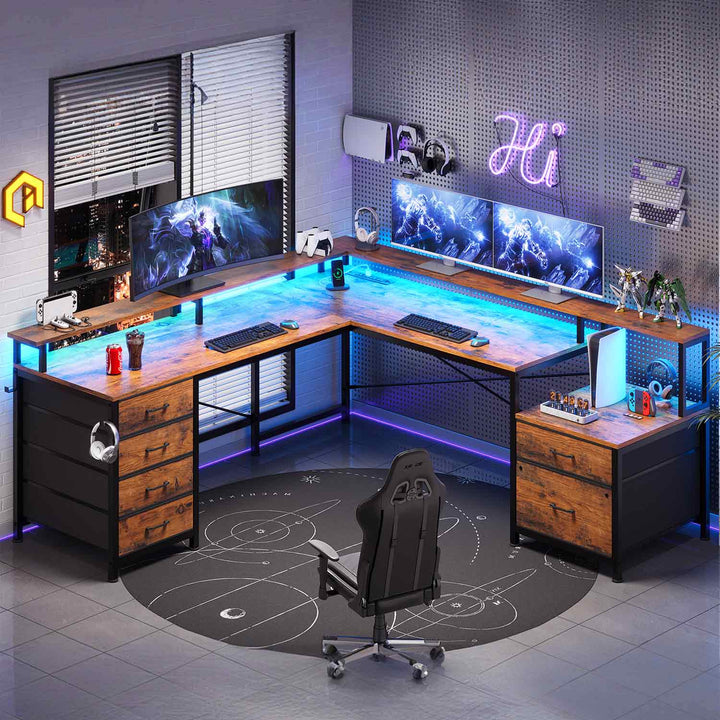 【Ideal Space】This computer desk has a spacious desktop. The desktop size is 65"L*19"W and 62.2"L*19"W or 108 inch two person desk. The printer rack can be used for printers of any size commonly seen on the market. The L shaped computer desk could hold three desktop computers and one notebook computer. This computer desk can also be freely deformed into a long square or L-shaped desk according to your use needs. 【6 Large Fabric Drawers】Coming with a fabric file drawer, fabric drawers, printer cabinet with powerful storage space. File cabinet can hold letter/A4/legal files. This solid constructed computer desk could hold printers, scanners, fax machines and any other office machines, keeps printer or scanner within easy reach of your desk to free up work space. 【User Friendly】The L shaped computer desk includes a built-in power strip with 4 outlets & 2 USB Ports provides convenience for charging your gaming gear, tablet、printer or phone.Don't worry about not having enough power sockets. Also includes an on-off switch, thanks to the on-off switch, one-button power off to ensure safe electricity use, which strengthens security. 【For Health】The monitor shelf conforms to the ergonomic structure, which effectively reduces the pressure on the back and neck, so that you don't need to worry too much about health problems when you were working. At the same time, a headset hook is provided on the side, so that the headset is at your hand, and you don't need to worry about finding headphones for offline meetings or playing games. 【Cool & Smart Led Light Strips 】The Sedeta home office desk comes with RGB LED light strip, remote control via APP, Over 60000 colors and 29 flashing modes for your to choose. Led light strip with music sync function, built-in sensitivity adjustable mic, led light color will change with the rhythm of the sound and music. And with timer function, just enjoy it in a smart way, create gaming and working atmosphere. 【Strong Table Board & Sturdy Frame】Computer desk made of P2 particle board, sturdy durable and anti-scratched. A stable, thick metal frame and secure the stability and healthy home office environment. Adjustable leg pads can keep the desk stable on uneven floor, protect the floor from scratches. If your item arrives damaged, scratched or missing part, please feel free to contact us, we will send you free replacement or offer a partial refund.