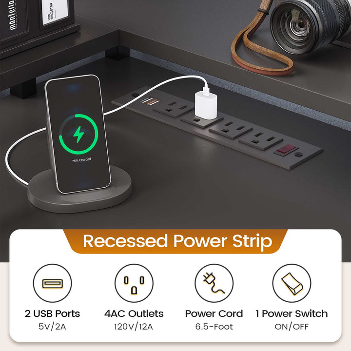 • Power Features: 4 outlets, 2 USB ports, safety switch.