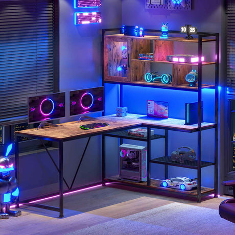 SEDETA | 58 Inch L Shaped Corner Gaming Desk with LED Light and Storage Shelves for Home Office