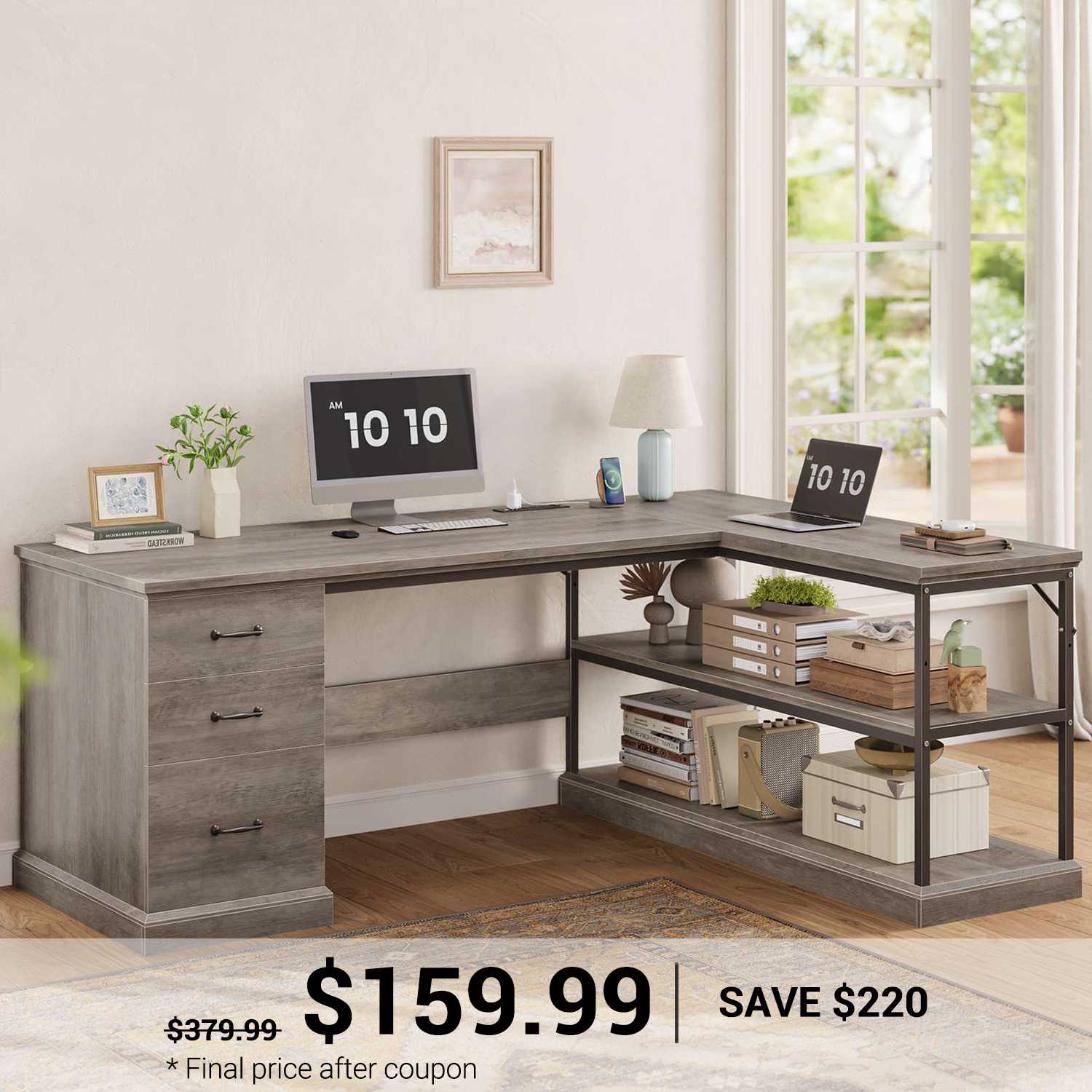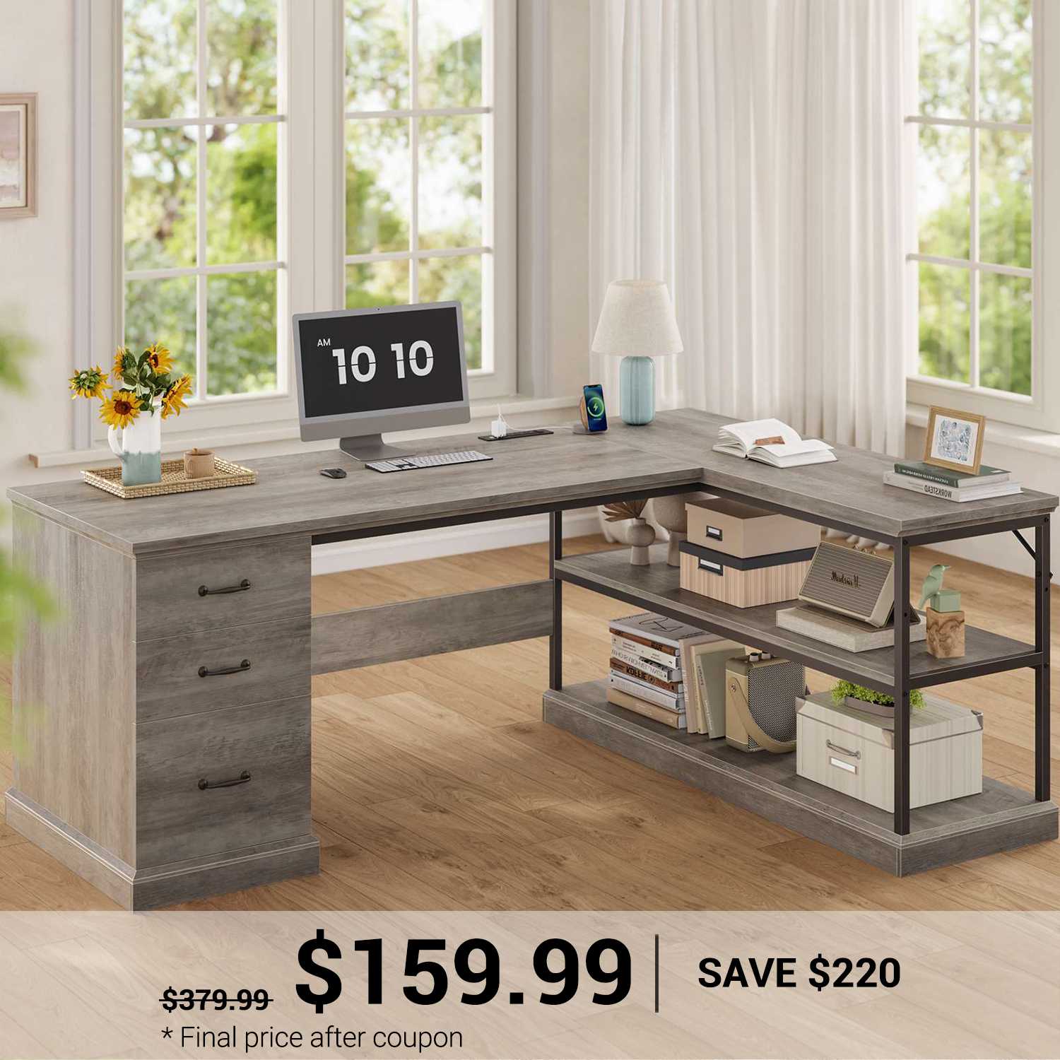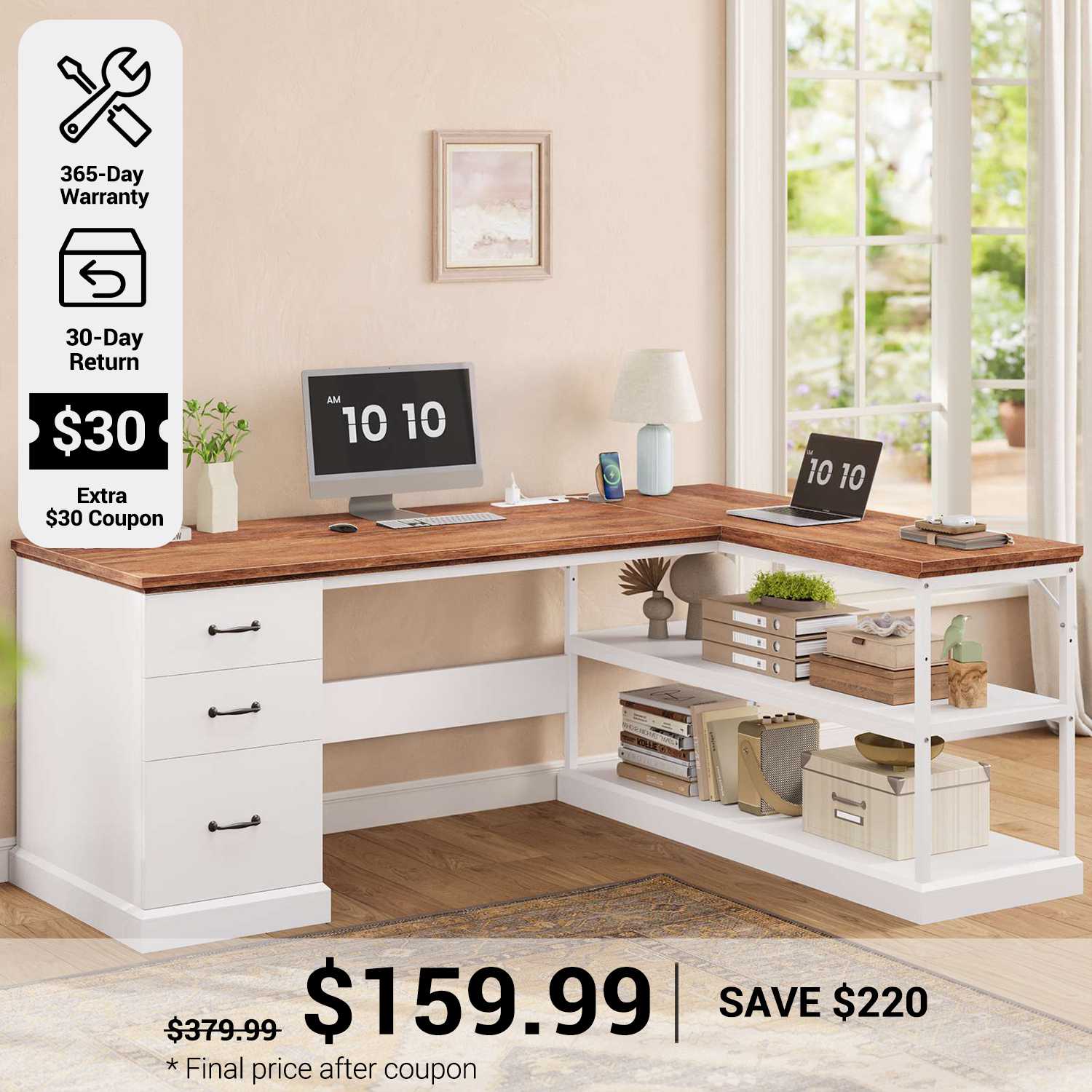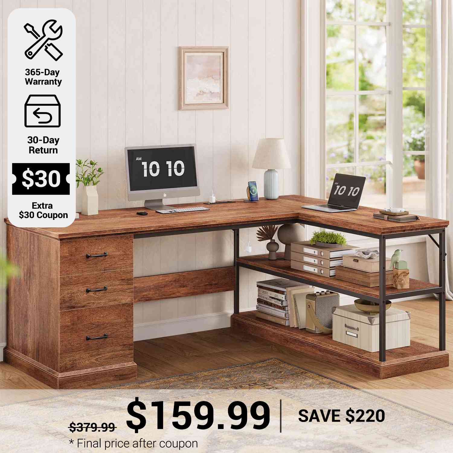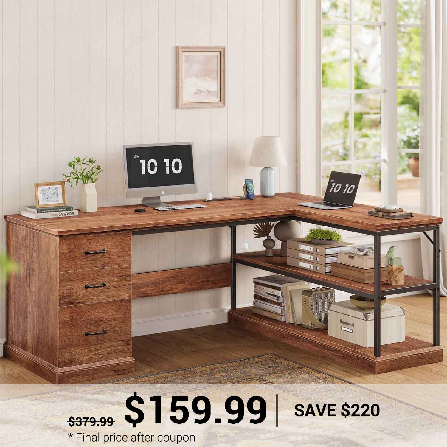 • Farmhouse Design: Rustic L-shaped desk with angled-cut edges adds charm and executive style.