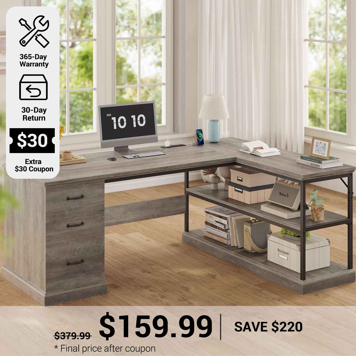 This desk has everything I was looking for — storage drawers, adjustable shelves, and built-in power outlets. The outlets are super convenient for charging my laptop and phone, and the switch makes it easy to turn them off when not in use. It’s both functional and elegant. I’m thrilled with this purchase!