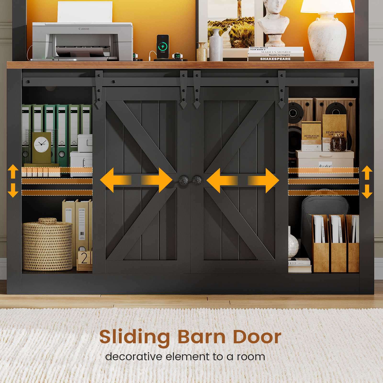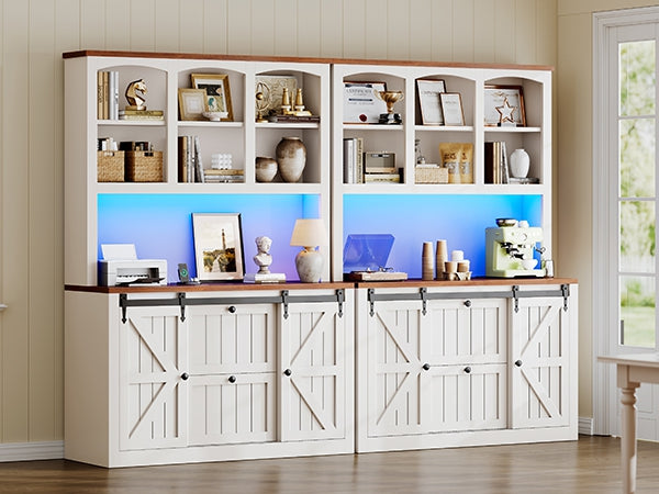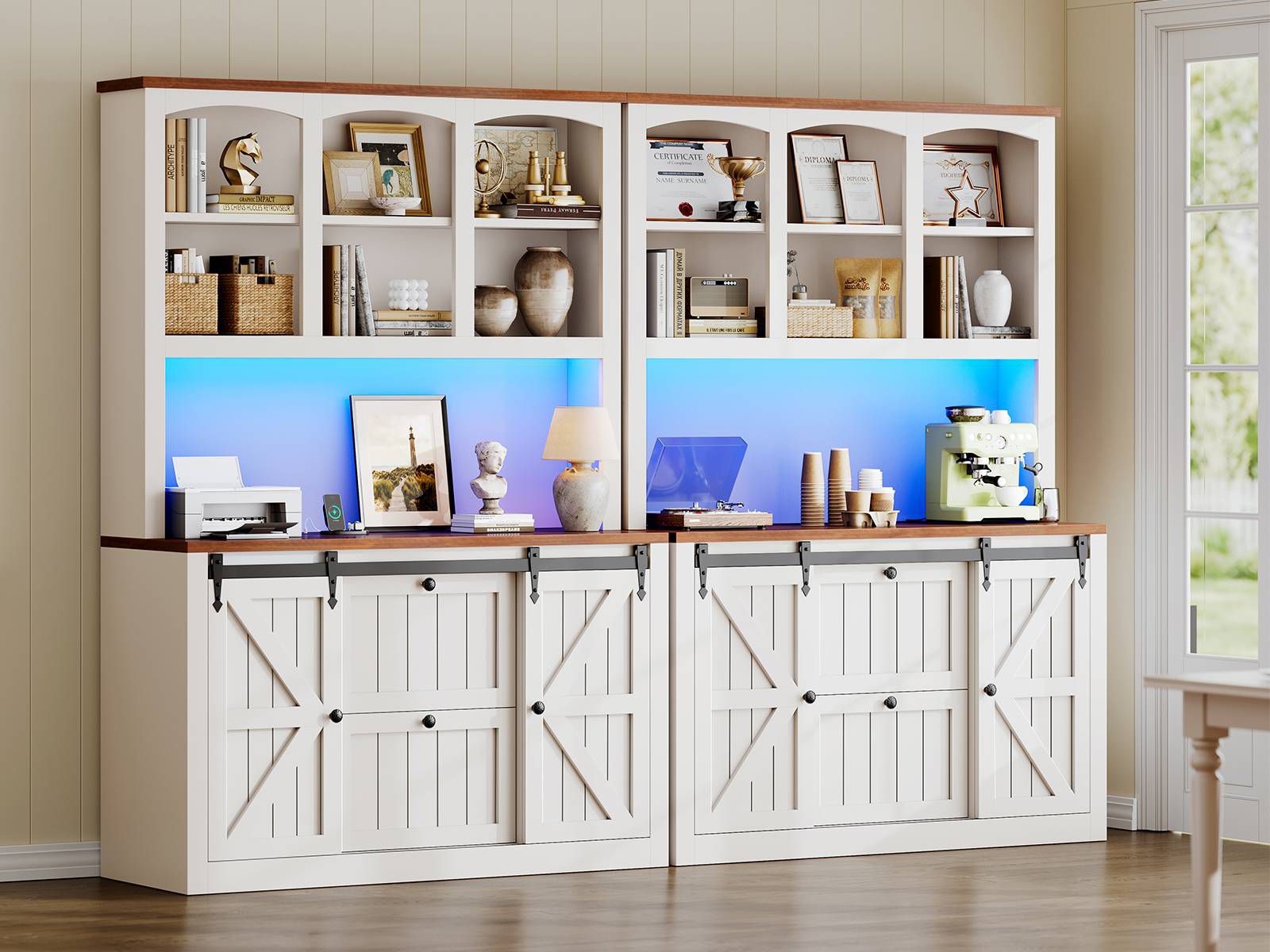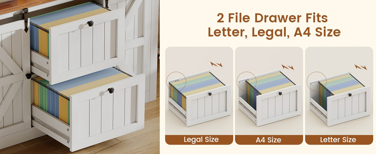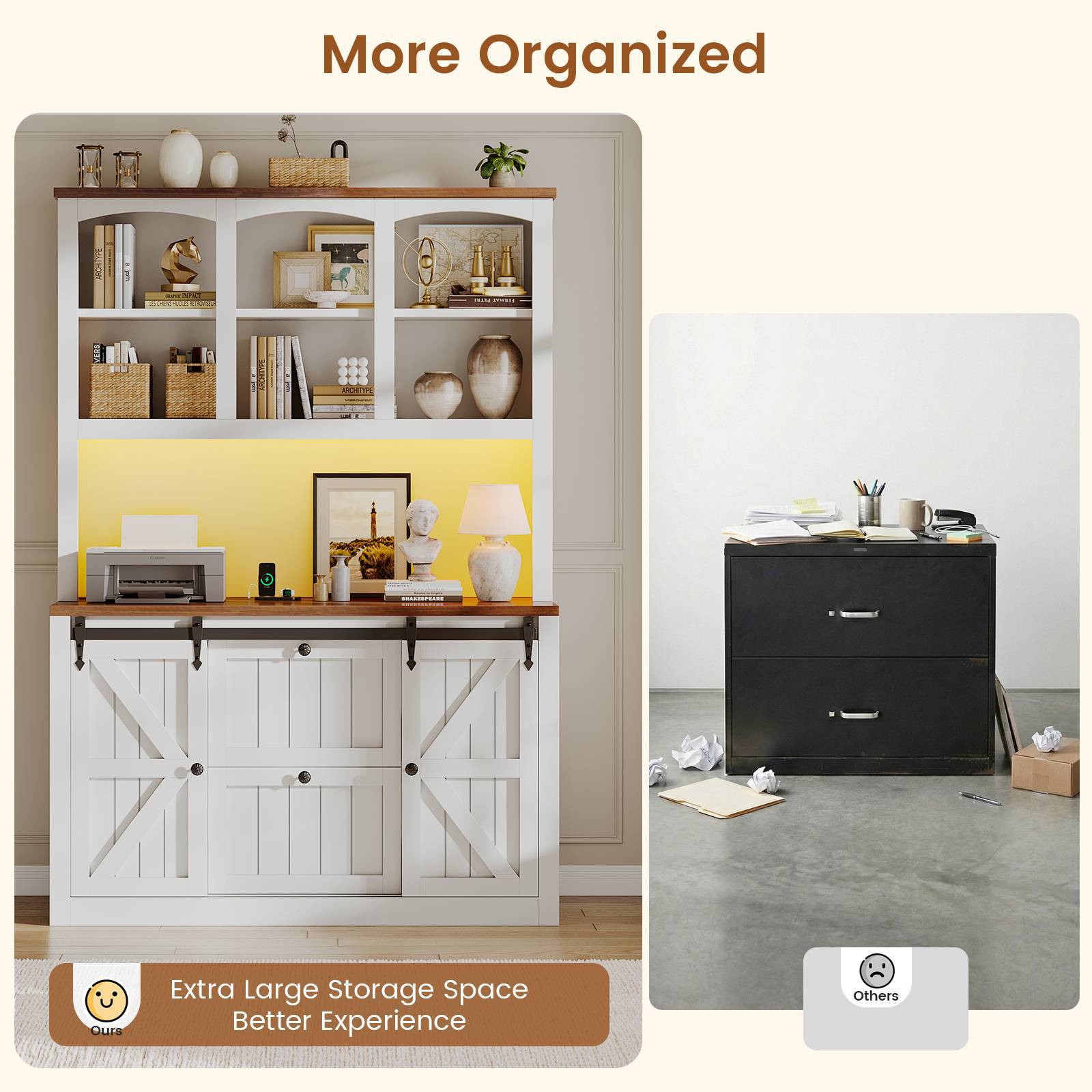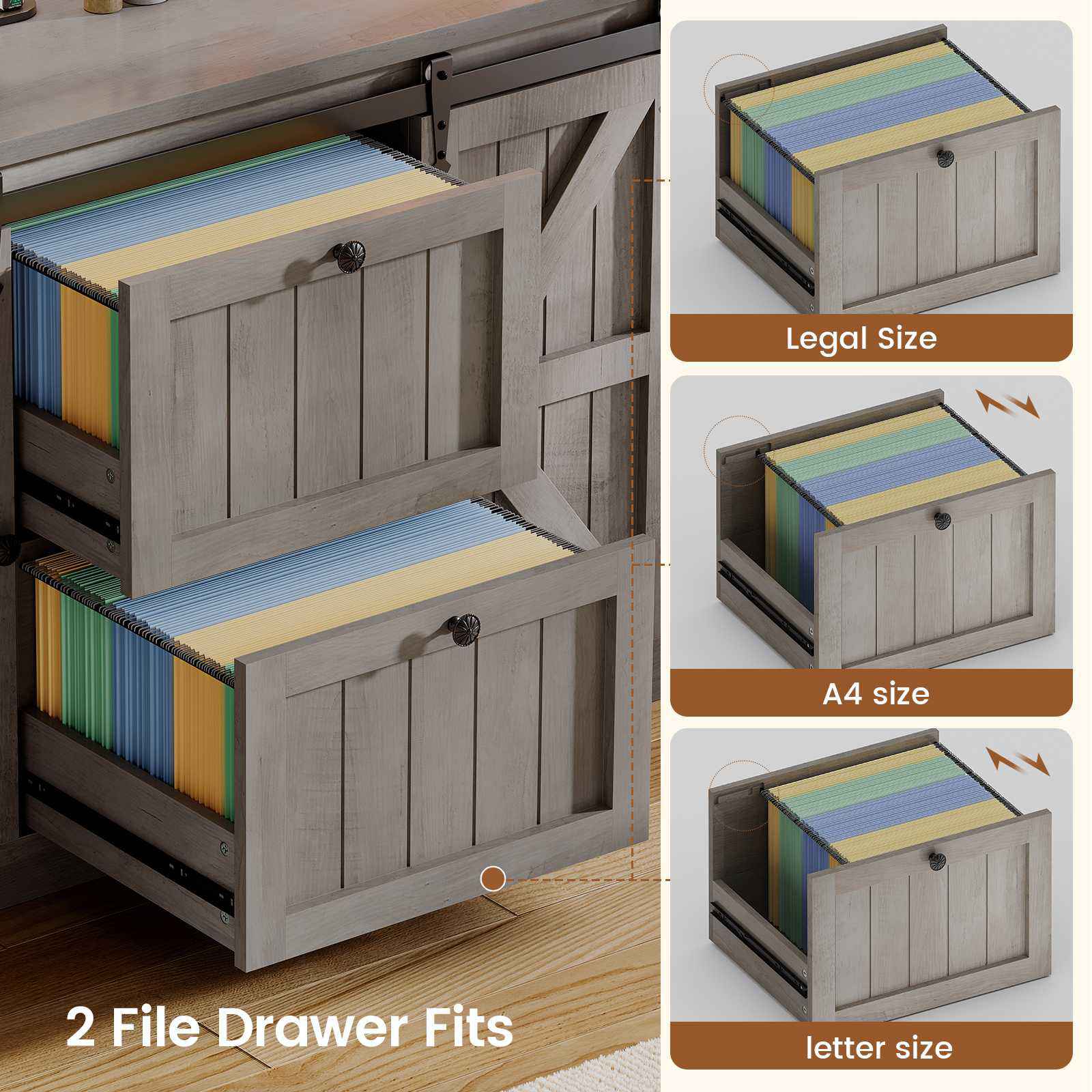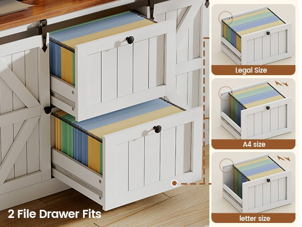 【Ample Storage for Your Home Office】41" W x 14.9" D x 68.9" H filing cabinet is the perfect storage solution. The farmhouse file cabinet keeps your office organized with two drawers for important documents and open shelves for displaying books or other home office items. There's plenty of space for all your essentials—printer,files, supplies, and equipment. 【2 Drawer File Cabinet】The lateral file cabinet with 2 drawer file keeps hanging letter, legal, A4 size hanging file folders or other home office items. There is 3 adjustable space of drawer and you can choose file hanging bar to hold legal size, letter size or A4 size. This file cabinets 2 drawer is perfect for home office, workplace to keep your files at close. 【Barn Door Cabinet & LED Light】 This file cabinet features a sliding barn door design that effectively keeps dust out while adding a stylish decorative touch to your home. The RGB LED strip adapts to your different needs by remote control via APP. Choose warm tones for focused work, or switch to vibrant colors to create an immersive gaming atmosphere. 【File Cabinet with Charging Station】The filing cabinets for home office is equipped with 2 outlet and 1 USB port and 1 type c to power up to 4 devices at the same time. Power outlet allows you to charge cell phones, tablets, notebooks, etc. This 41 inch long desktop offers a spacious workstation for your home office. 【Farmhouse Style】Elevate your home office with this stylish and farmhouse filing cabinet. Create a one-of-a-kind work environment when you add the sophisticated charm and design of this executive desk from the collection. Drawers and 2 door cabinet storage provide convenient organization for a clutter-free workspace. 【Easy to Assemble】Clearly-labeled parts and illustrated instructions make this filing cabinet a breeze to assemble. It’s perfect to double as a printer stand in your home office or your study. An anti-tip kit is included, so you can secure the file cabinet to the wall for added safety. If your file cabinet arrives damaged, scratched or missing part, please feel free to contact us, we will send you free replacement or offer a partial refund.