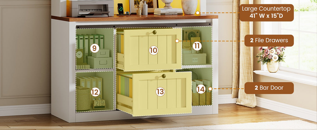 •【File Cabinet with Charging Station】The filing cabinets for home office is equipped with 2 outlet and 1 USB port and 1 type c to power up to 4 devices at the same time. Power outlet allows you to charge cell phones, tablets, notebooks, etc. This 41 inch long desktop offers a spacious workstation for your home office.