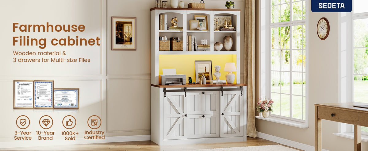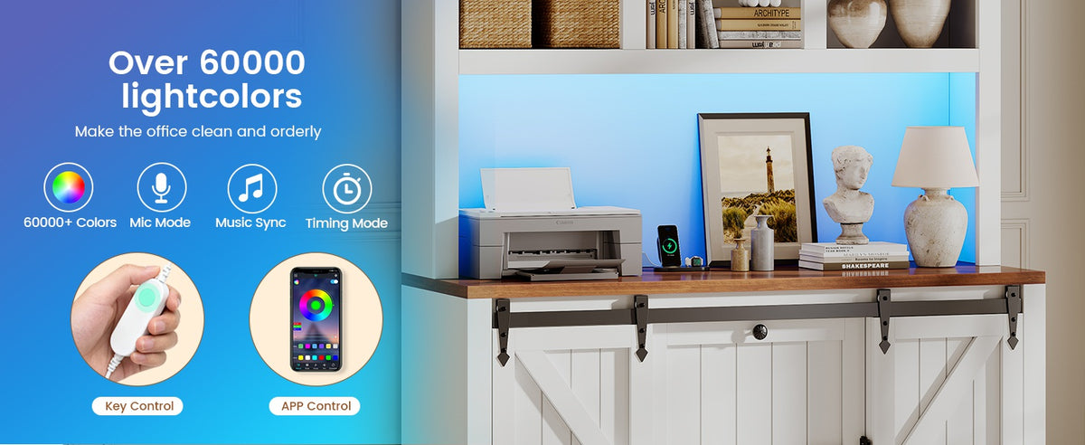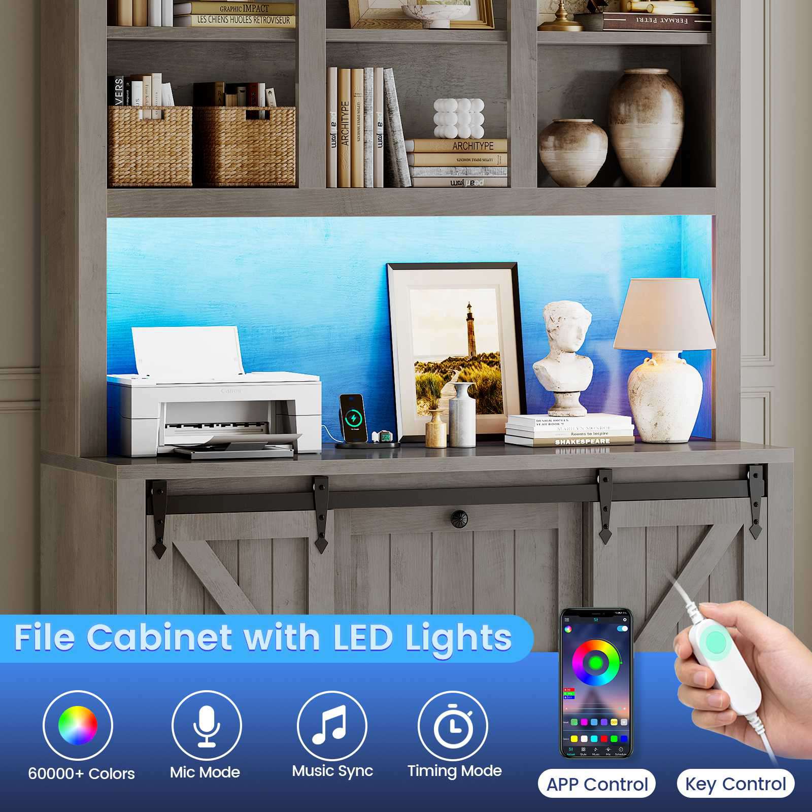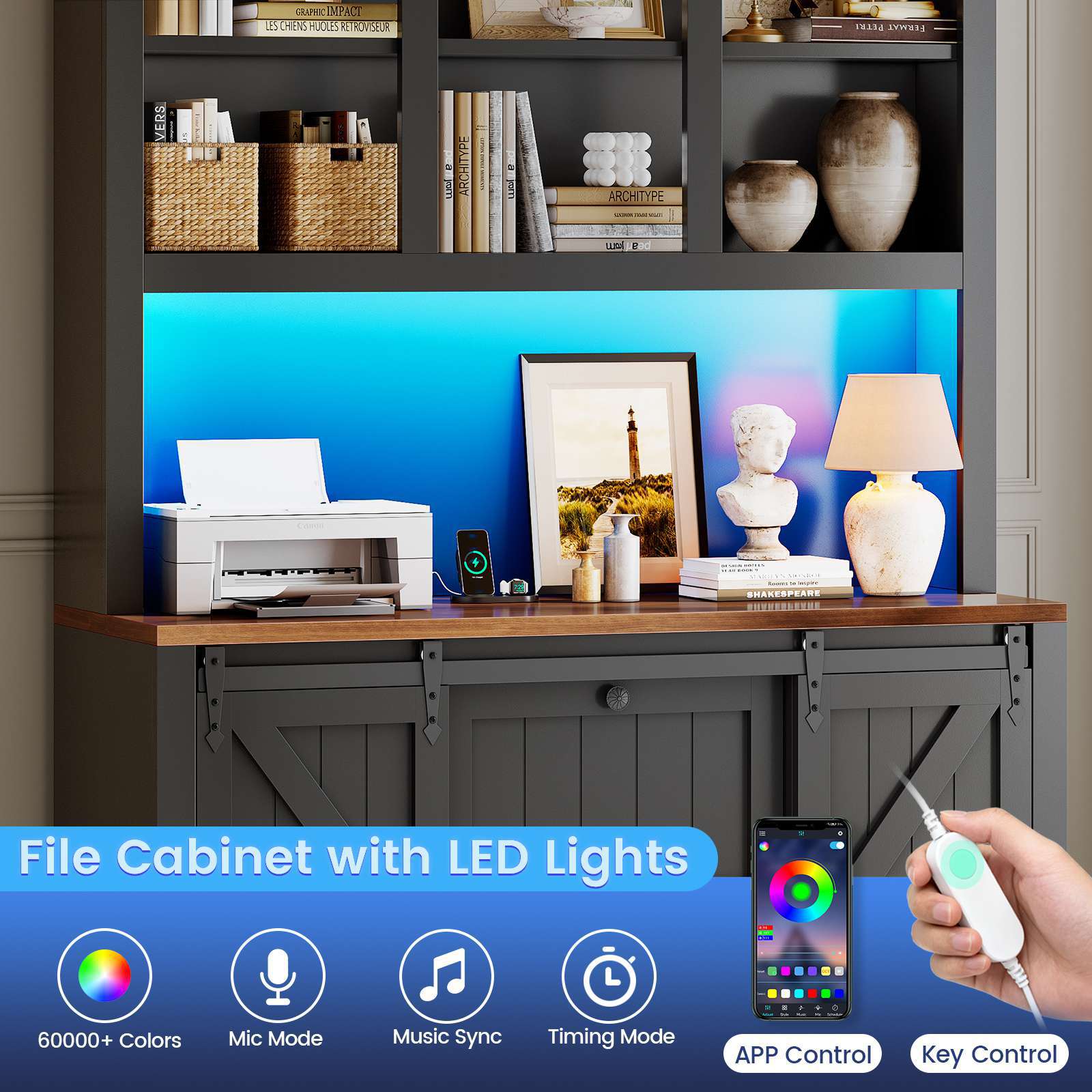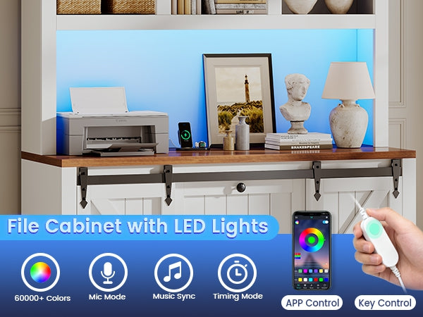 •【Barn Door Cabinet & LED Light】 This file cabinet features a sliding barn door design that effectively keeps dust out while adding a stylish decorative touch to your home. The RGB LED strip adapts to your different needs by remote control via APP. Choose warm tones for focused work, or switch to vibrant colors to create an immersive gaming atmosphere.