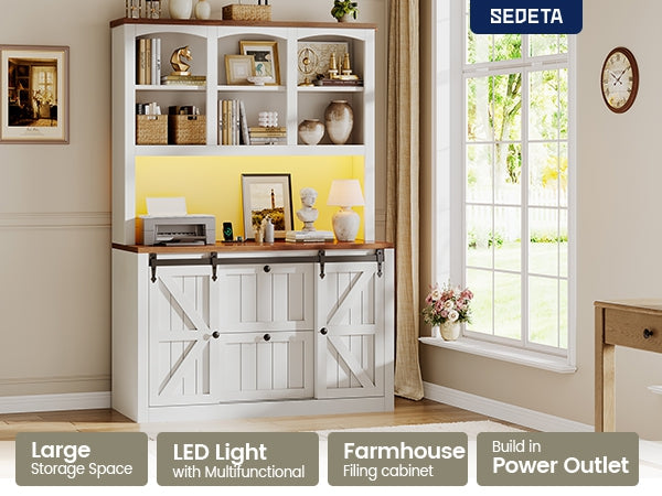 SEDETA 41 Inch 2 Drawer Farmhouse File Cabinet with Printer Stand Power Strip Storage Shelf Bar Door LED Lights fits Legal Letter A4 Size Files for Home Office