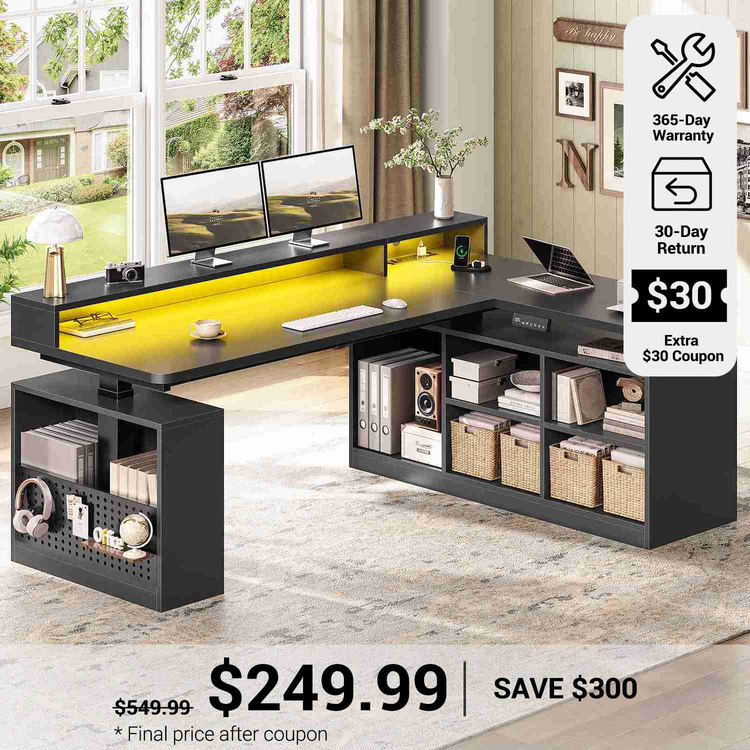 •【Led Light Strips and Power Outlet 】The l shaped gaming desk comes with RGB LED light strip, remote control via APP, Over 60000 colors and 29 flashing modes for your to choose. And the power outlet with four power sockets and two USB ports is convenient charging of your devices.