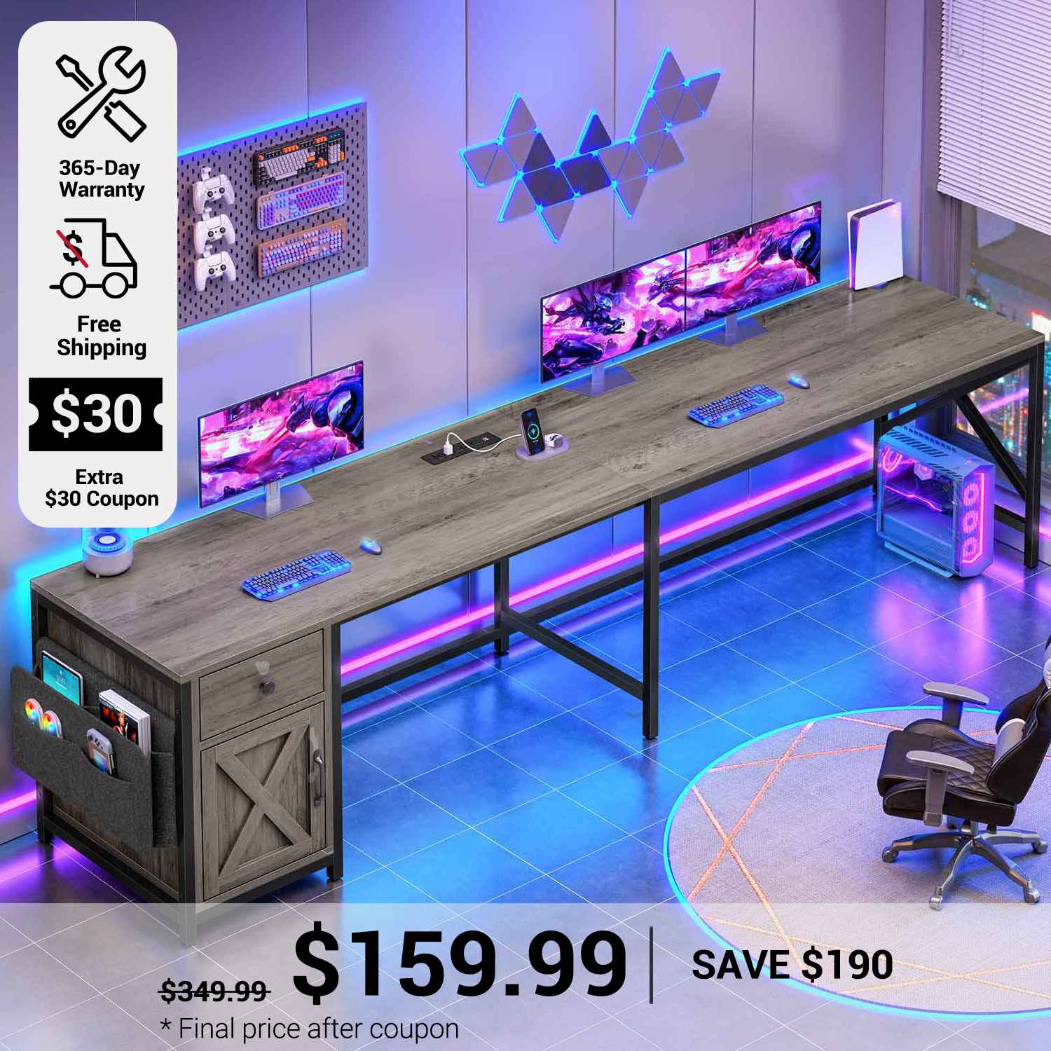 •【Convertible Design】The computer desk has 2 kinds of assembly ways, you can change the l-shaped into a long desk as you need. The 86.6 inch - length size allows 2 person to work side by side without compromising on space. The office desk is perfect for your friends, workmate and you to study, play games and work together. Desk with storage equipped with 2 AC outlets and 2 PowerIQ-enabled USB charging ports to provide power for up to 4 devices simultaneously.