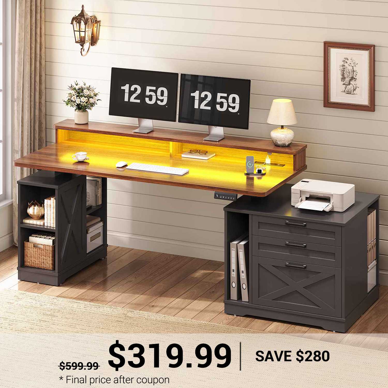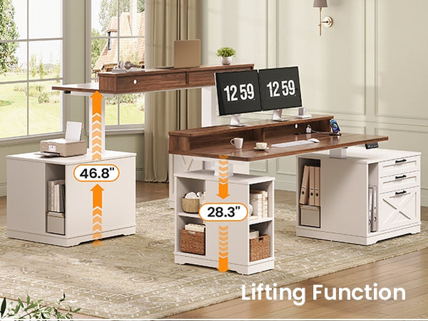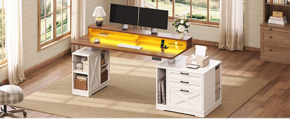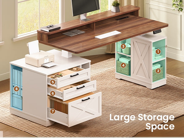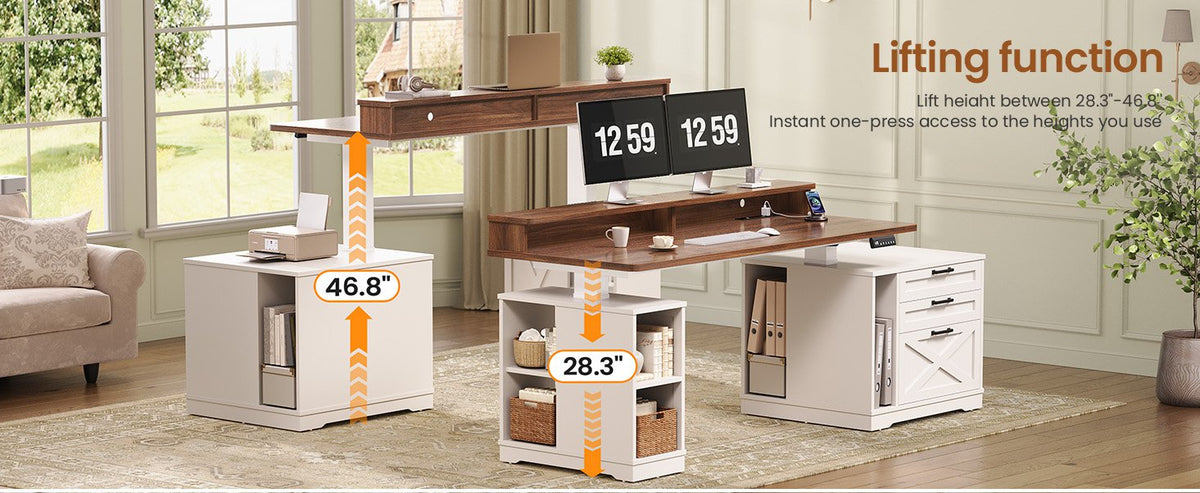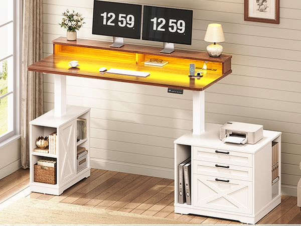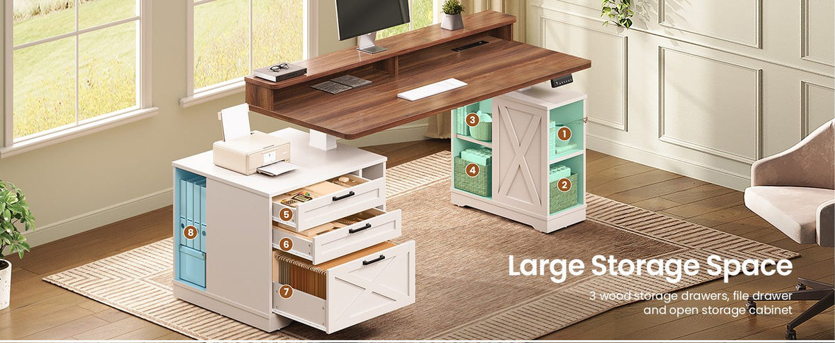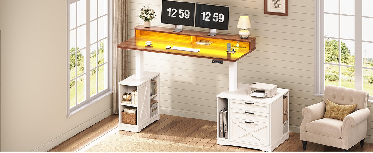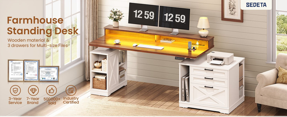【Introducing the SEDETA Standing Desk with Drawers: Your Ergonomic Health Guardian】 Meet your new solution to back pain and sedentary fatigue—the standing desk adjustable height! This electric standing desk glides silently (under 30dB) from 28.3" to 46.8", featuring an LED display with 3 memory presets. Whether you're writing a novel in your home study or pulling an all-nighter on a project, easily switch between sitting and standing to boost circulation, focus, and long-term wellness without disturbing others. It’s the healthy core of your productive farmhouse home office. 【Ample Storage Powerhouse: A Standing Desk with Storage to Declutter Your Life】 Tame the paper monster and office clutter! This versatile standing desk with storage provides serious organization: three wooden drawers, including an oversized file drawer for Letter/A4/Legal folders, plus open shelves. The dedicated file cabinet on the side neatly houses your printer or scanner, freeing up your entire desktop. Perfect for crafters, remote workers, or busy parents managing household paperwork, it solves the chaos problem by giving every supply, document, and device a designated home. 【Spacious & Sturdy Farmhouse Desktop: Your Expansive Command Center】 Spread out and breathe easy! This robust adjustable standing desk features a generous 55" x 23.6" solid wood desktop, paired with an ergonomic monitor stand. It provides ample room for dual monitors, a laptop, and your favorite desk accessories while promoting a healthy viewing posture. From graphic designers needing screen real estate to students with multiple textbooks, this standing desk corner workstation supports your most demanding tasks without feeling cramped. 【Fully Loaded Adjustable Desktop: Power & Ambiance Built-In】 Stay charged and inspired! This intelligent standing desk with drawers integrates a 4-outlet + 2-USB power strip with a master switch to eliminate cord clutter and keep devices ready. The warm LED light strip adds a cozy, inviting glow to your farmhouse office desk, perfect for late-night work sessions or creating a calming ambiance. It solves the twin annoyances of tangled wires and a sterile workspace, turning your corner into a functional and inviting haven. 【Your Flexible Farmhouse Solution: A Standing Desk Corner for Any Space】 Adapt your workspace to life’s changes! This clever adjustable desktop standing desk offers two reversible setups—simply configure the shelving and file cabinet unit on the left or right to fit your room layout. Ideal for a cozy bedroom nook, a shared living room office, or a rustic studio, it provides the ultimate flexibility. No more “fixed furniture frustration”—this desk grows and changes with your needs, making it the last standing desk you’ll ever need to buy. 【Built to Last with Exceptional Stability】The industrial-grade steel frame and T-shaped design of the stand up desk support up to 200 lbs. Desktop made of P2 particle board, sturdy durable and anti-scratched. And powered by a robust yet quiet motor (operating at less than 30 DB). If your item arrives damaged, scratched or missing part, please feel free to contact us, we will send you free replacement or offer a partial refund.