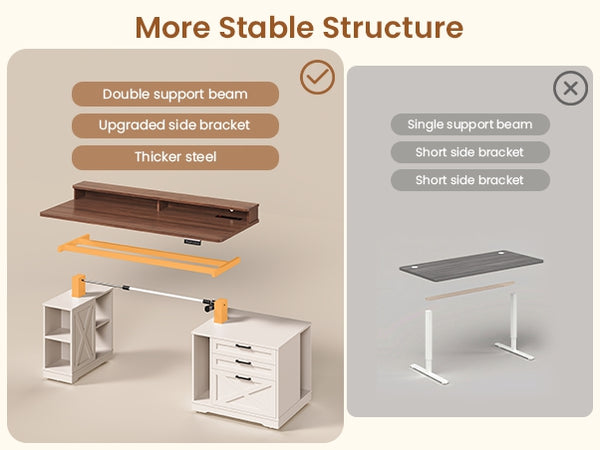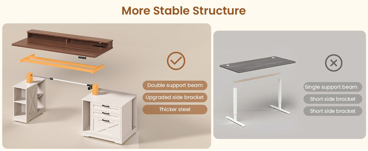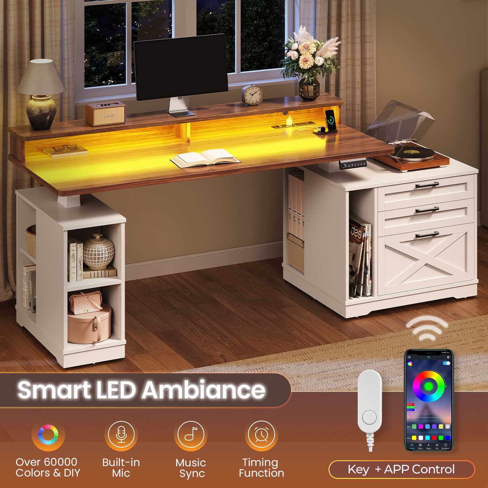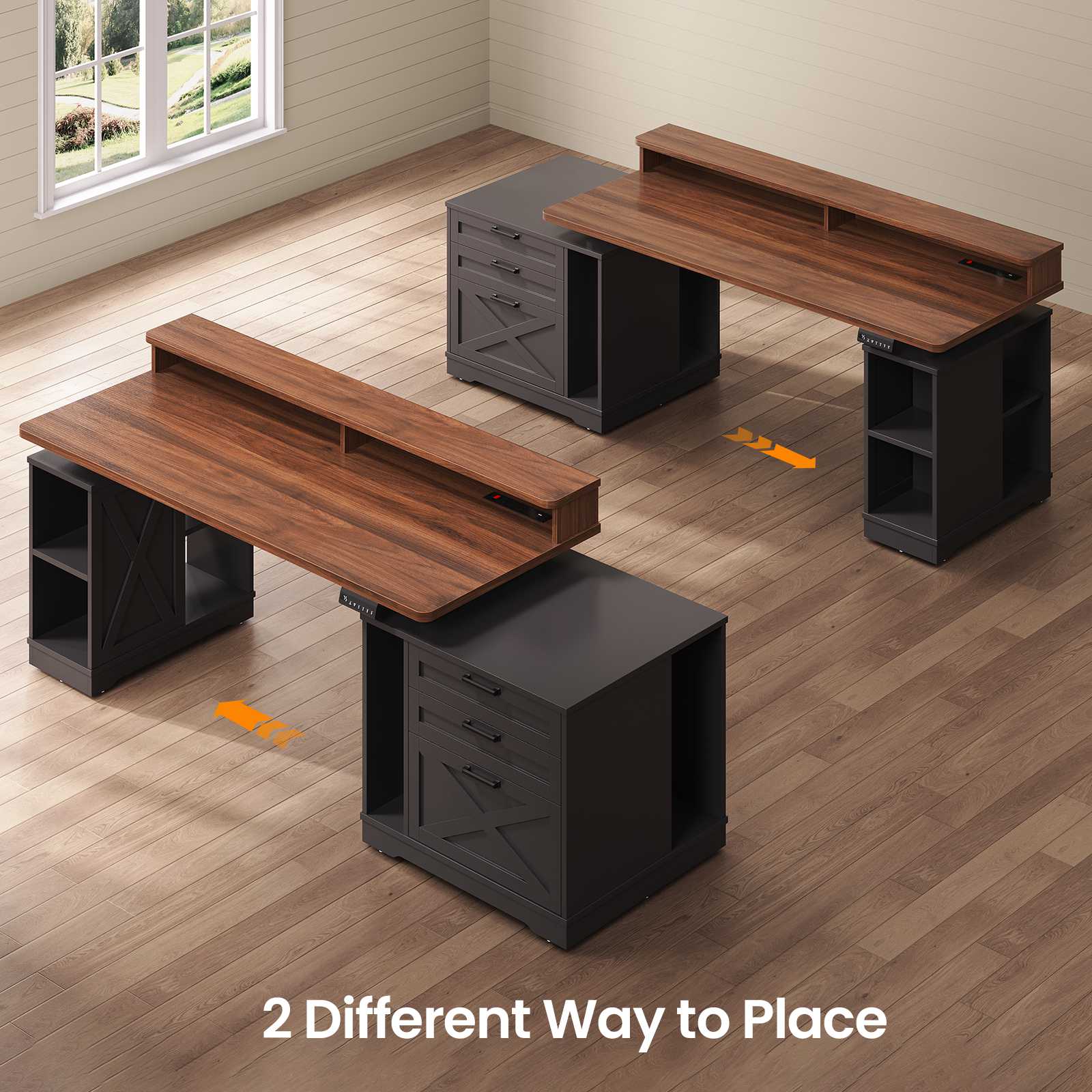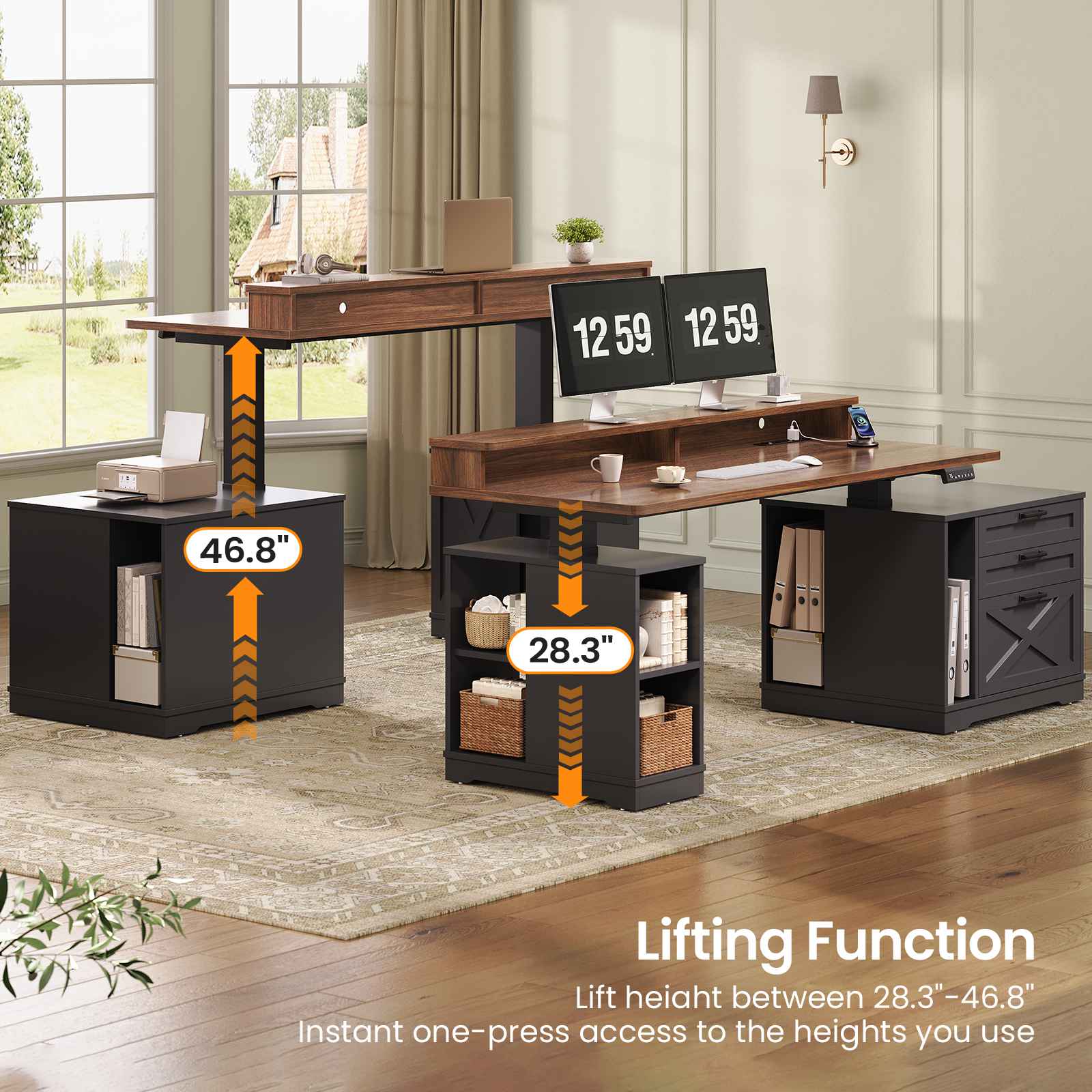 【Introducing the SEDETA Standing Desk with Drawers: Your Ergonomic Health Guardian】 Meet your new solution to back pain and sedentary fatigue—the standing desk adjustable height! This electric standing desk glides silently (under 30dB) from 28.3" to 46.8", featuring an LED display with 3 memory presets. Whether you're writing a novel in your home study or pulling an all-nighter on a project, easily switch between sitting and standing to boost circulation, focus, and long-term wellness without disturbing others. It’s the healthy core of your productive farmhouse home office. 【Ample Storage Powerhouse: A Standing Desk with Storage to Declutter Your Life】 Tame the paper monster and office clutter! This versatile standing desk with storage provides serious organization: three wooden drawers, including an oversized file drawer for Letter/A4/Legal folders, plus open shelves. The dedicated file cabinet on the side neatly houses your printer or scanner, freeing up your entire desktop. Perfect for crafters, remote workers, or busy parents managing household paperwork, it solves the chaos problem by giving every supply, document, and device a designated home. 【Spacious & Sturdy Farmhouse Desktop: Your Expansive Command Center】 Spread out and breathe easy! This robust adjustable standing desk features a generous 55" x 23.6" solid wood desktop, paired with an ergonomic monitor stand. It provides ample room for dual monitors, a laptop, and your favorite desk accessories while promoting a healthy viewing posture. From graphic designers needing screen real estate to students with multiple textbooks, this standing desk corner workstation supports your most demanding tasks without feeling cramped. 【Fully Loaded Adjustable Desktop: Power & Ambiance Built-In】 Stay charged and inspired! This intelligent standing desk with drawers integrates a 4-outlet + 2-USB power strip with a master switch to eliminate cord clutter and keep devices ready. The warm LED light strip adds a cozy, inviting glow to your farmhouse office desk, perfect for late-night work sessions or creating a calming ambiance. It solves the twin annoyances of tangled wires and a sterile workspace, turning your corner into a functional and inviting haven. 【Your Flexible Farmhouse Solution: A Standing Desk Corner for Any Space】 Adapt your workspace to life’s changes! This clever adjustable desktop standing desk offers two reversible setups—simply configure the shelving and file cabinet unit on the left or right to fit your room layout. Ideal for a cozy bedroom nook, a shared living room office, or a rustic studio, it provides the ultimate flexibility. No more “fixed furniture frustration”—this desk grows and changes with your needs, making it the last standing desk you’ll ever need to buy. 【Built to Last with Exceptional Stability】The industrial-grade steel frame and T-shaped design of the stand up desk support up to 200 lbs. Desktop made of P2 particle board, sturdy durable and anti-scratched. And powered by a robust yet quiet motor (operating at less than 30 DB). If your item arrives damaged, scratched or missing part, please feel free to contact us, we will send you free replacement or offer a partial refund.