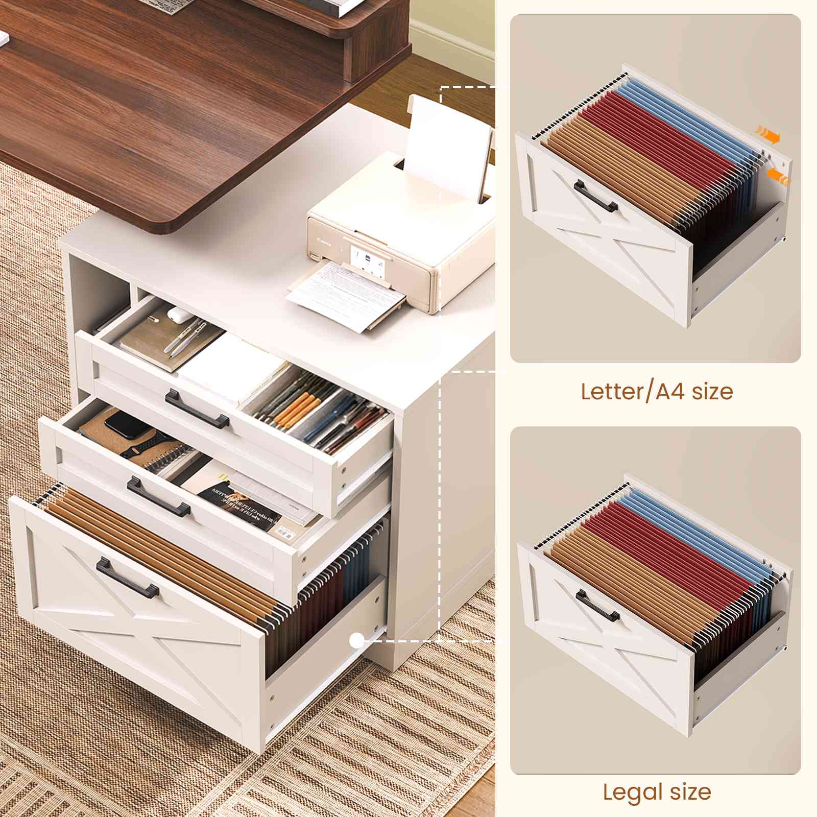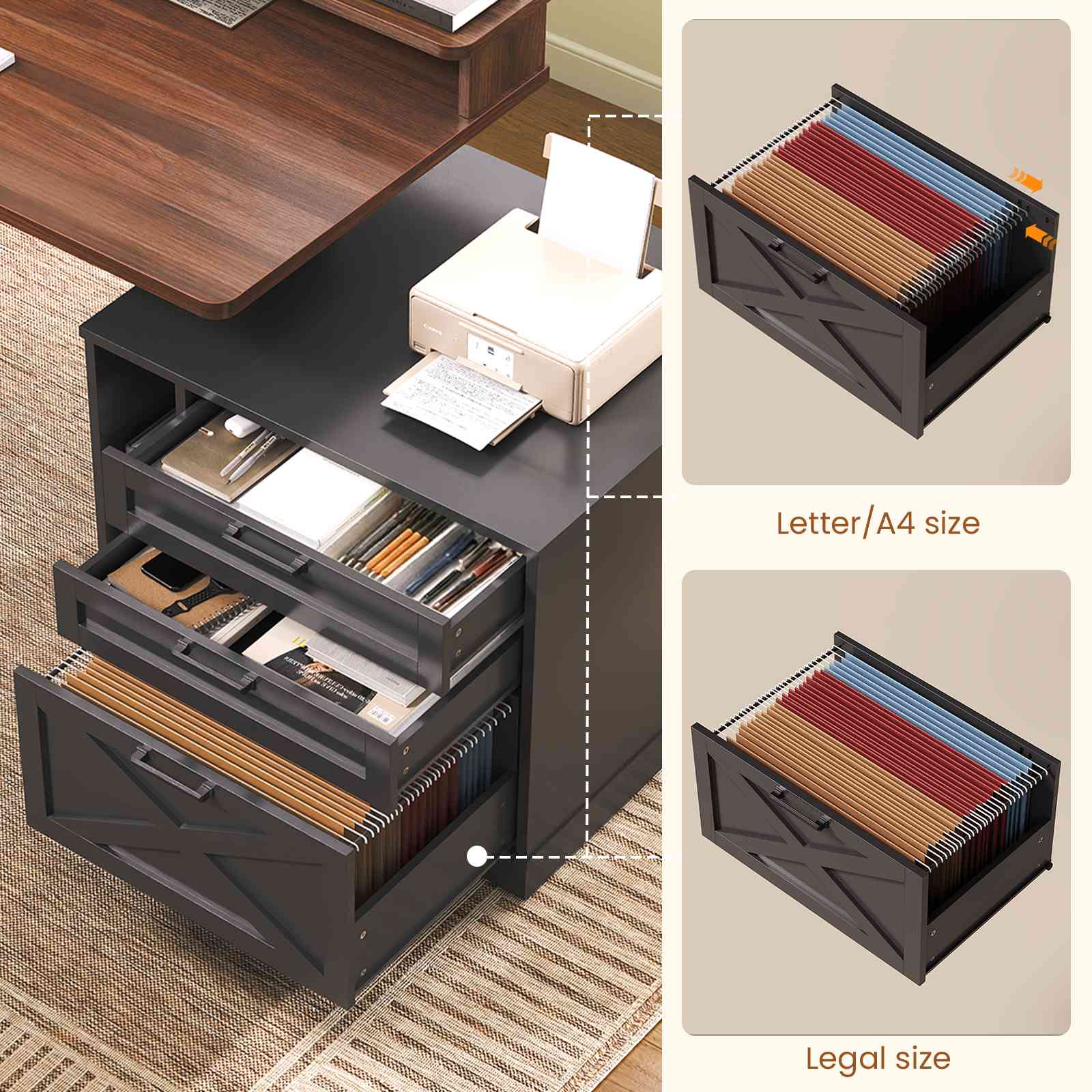 •【Ample Storage Powerhouse: A Standing Desk with Storage to Declutter Your Life】 Tame the paper monster and office clutter! This versatile standing desk with storage provides serious organization: three wooden drawers, including an oversized file drawer for Letter/A4/Legal folders, plus open shelves. The dedicated file cabinet on the side neatly houses your printer or scanner, freeing up your entire desktop. Perfect for crafters, remote workers, or busy parents managing household paperwork, it solves the chaos problem by giving every supply, document, and device a designated home.