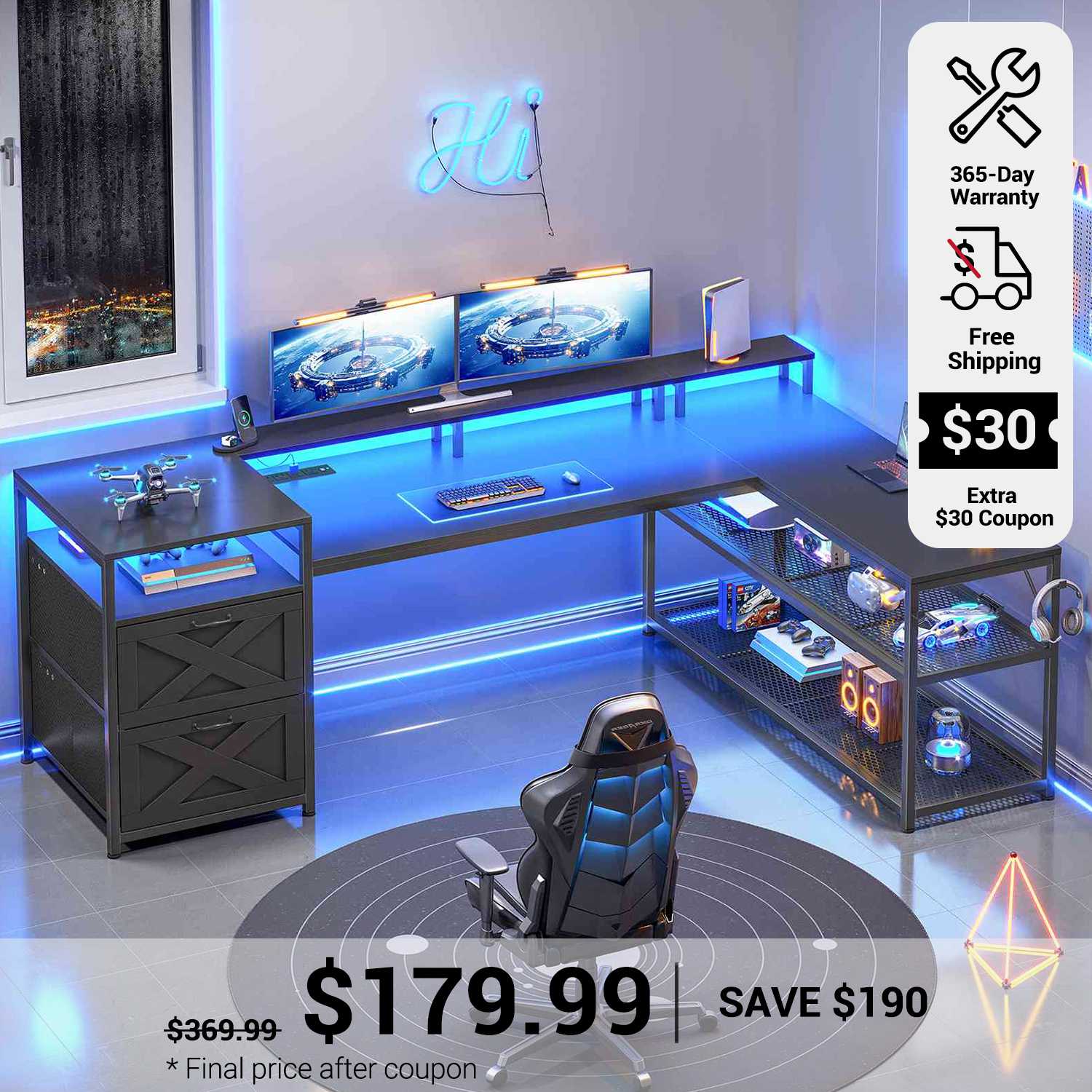 • Complete Setup: Includes 2 file drawers, power outlet, bookshelves, LED lights, and monitor shelf.