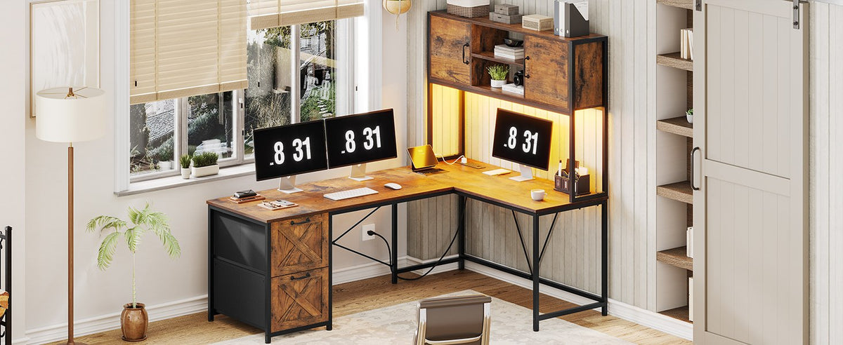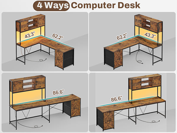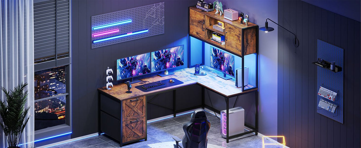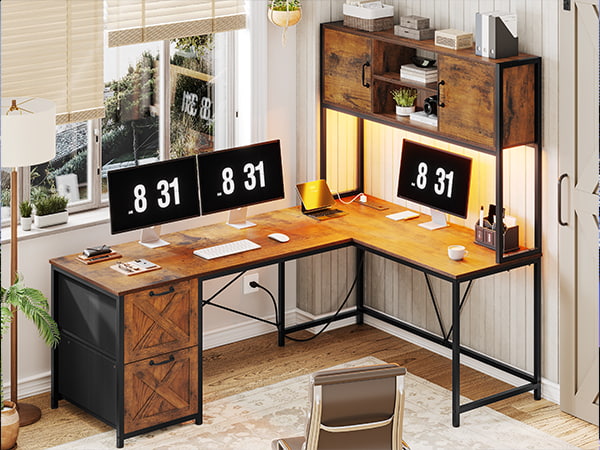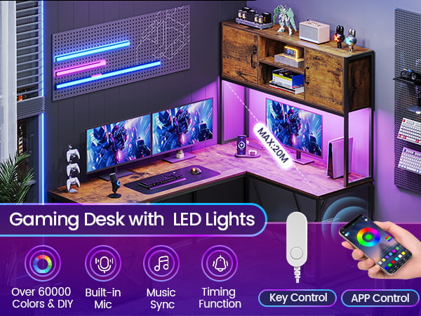 L Shaped Desk with Hutch, Storage Shelves, LED lights