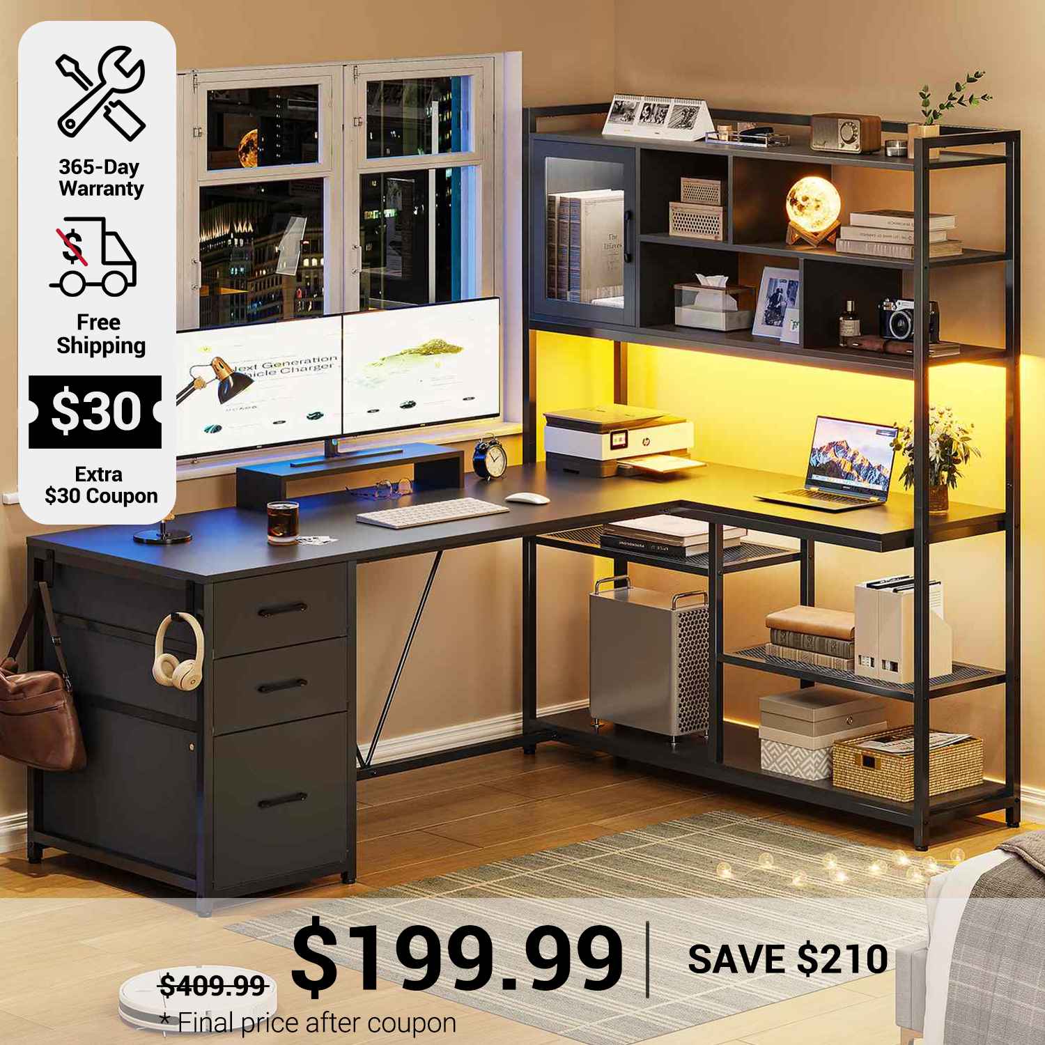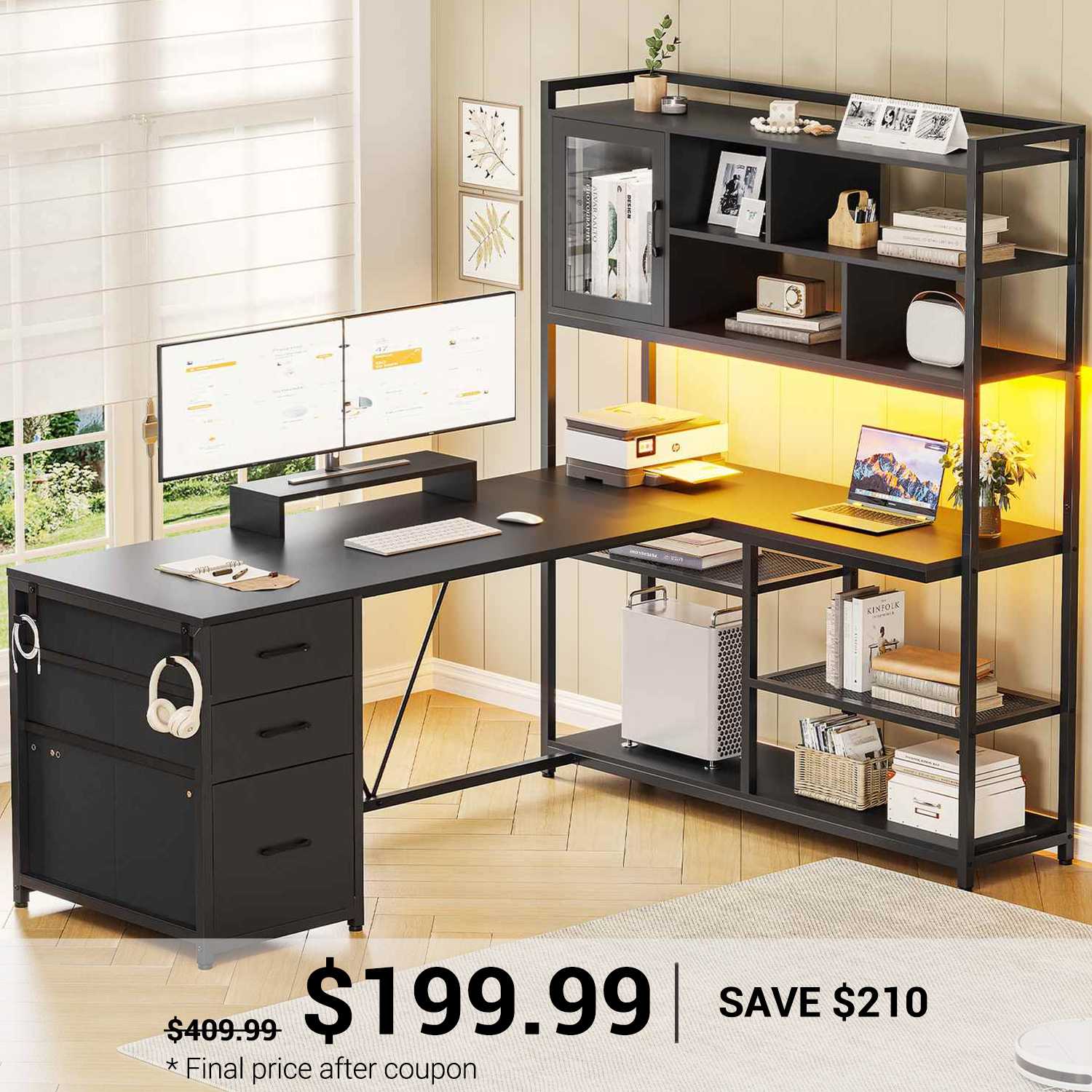 SEDETA 58 Inch L Shaped Computer Desk with Storage Shelves and LED Light for Home Office