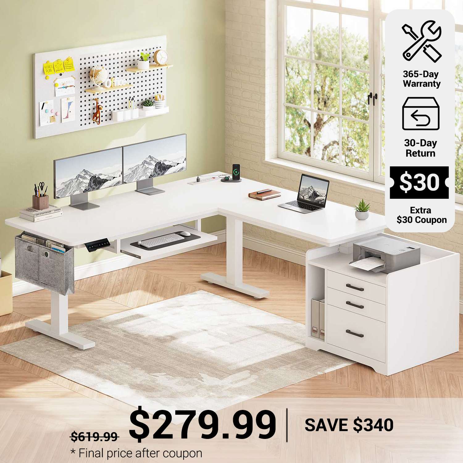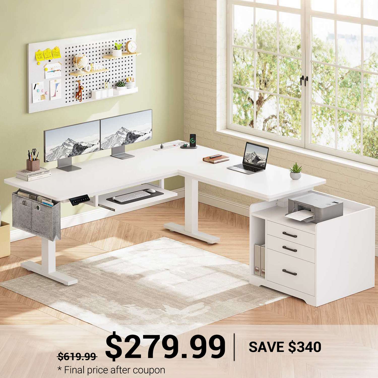 •【Multifunctional Workstation】Create a multifunctional workstation with this l shaped standing desk, equipped with filing cabinets, 3 storage drawer, power outlets, storage bag, keyboard tray and a lifting motor to meet all your needs. The L-shaped design maximizes corner space and expands storage capacity.