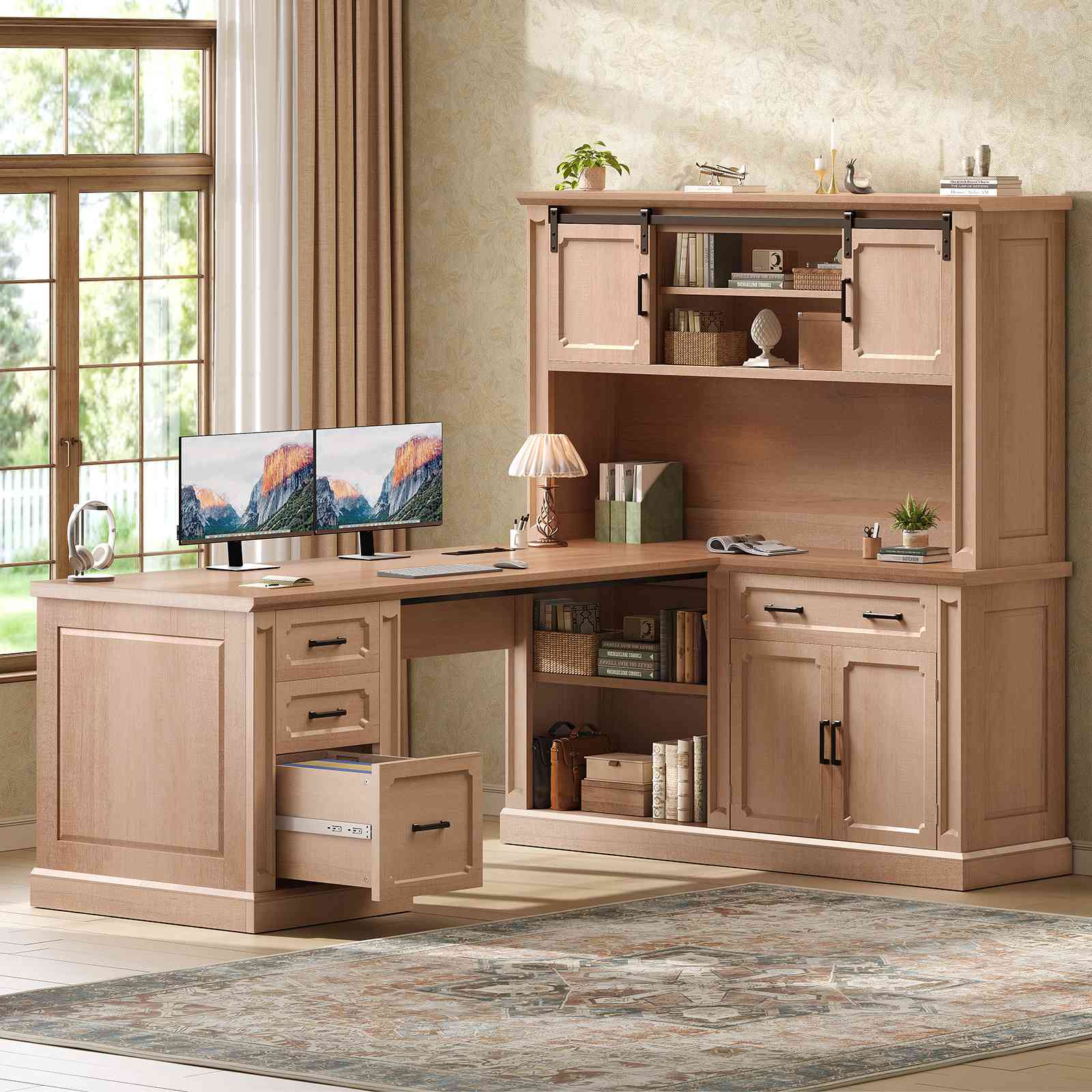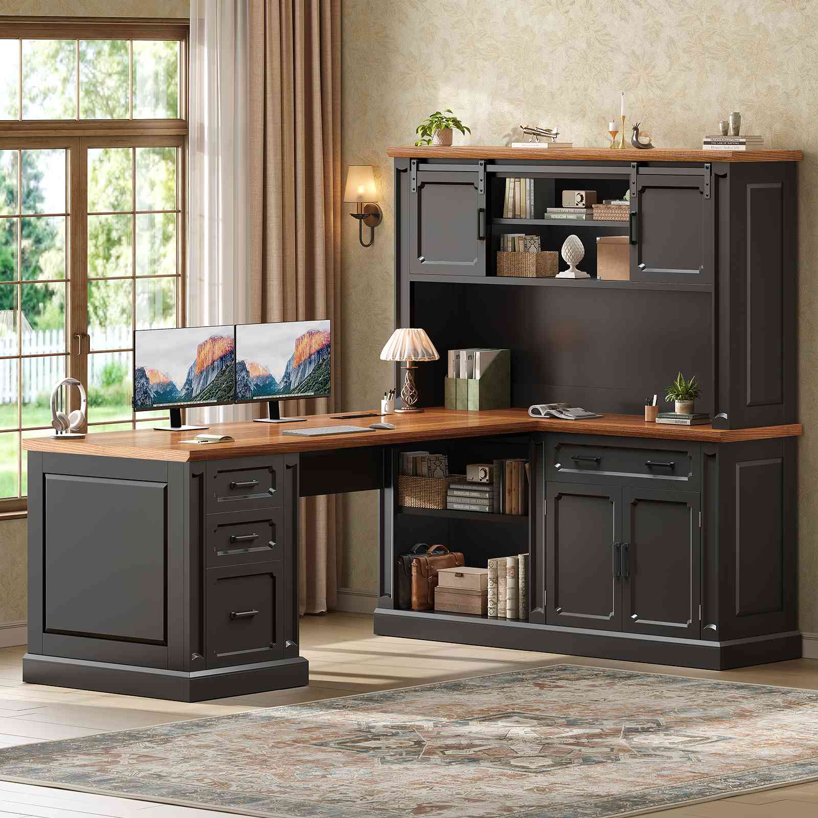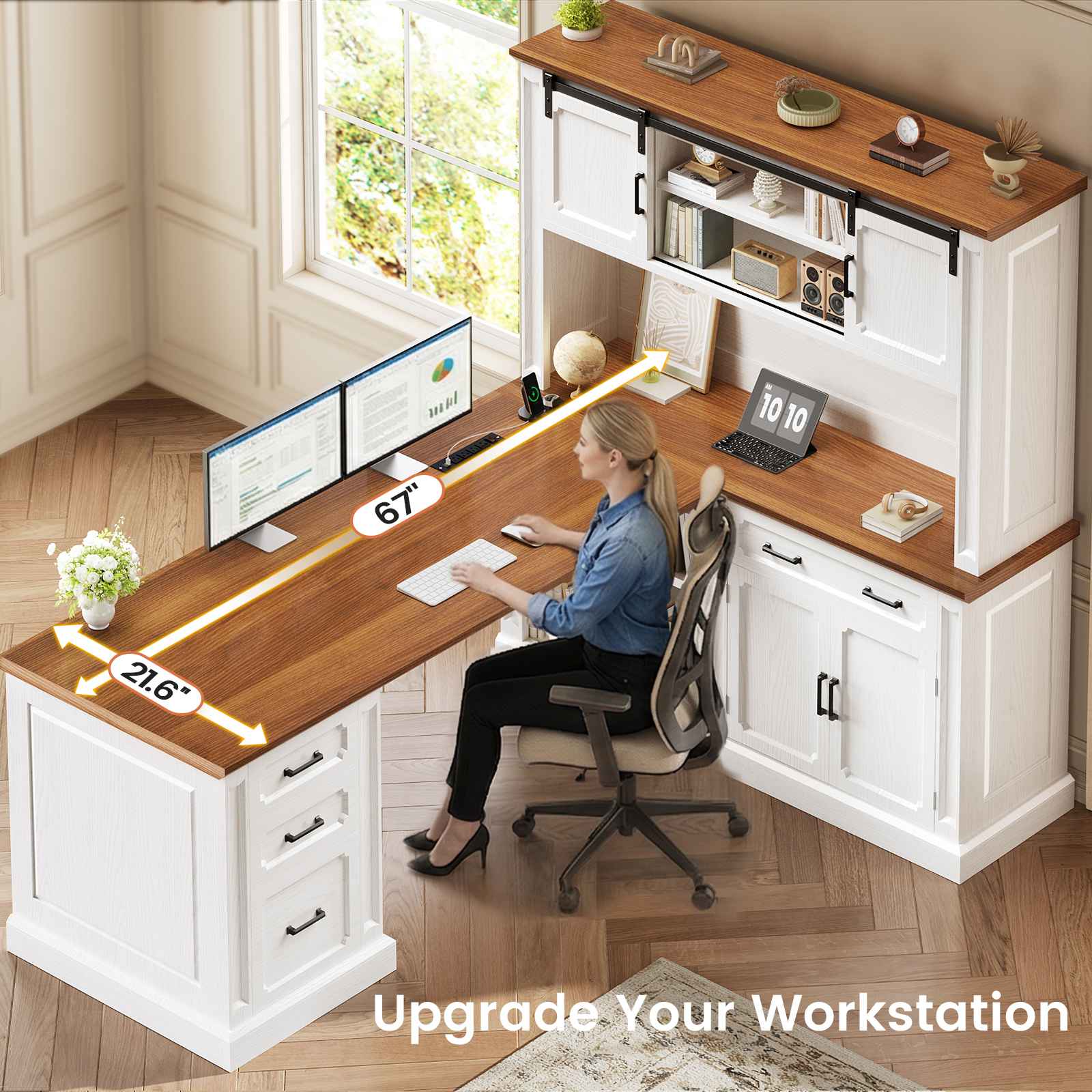 •【Ample storage space】This L-shaped desk with hutch features four storage drawers, including a file drawer that can hold three different file sizes. It also includes four open shelves, a storage cabinet, and two sliding doors, providing convenient and ample storage space. The spacious desktop (67 inches long and 47.2 inches deep) can accommodate two desktop computers and a laptop, making it ideal for keeping your living room, bedroom, or office tidy and organized.