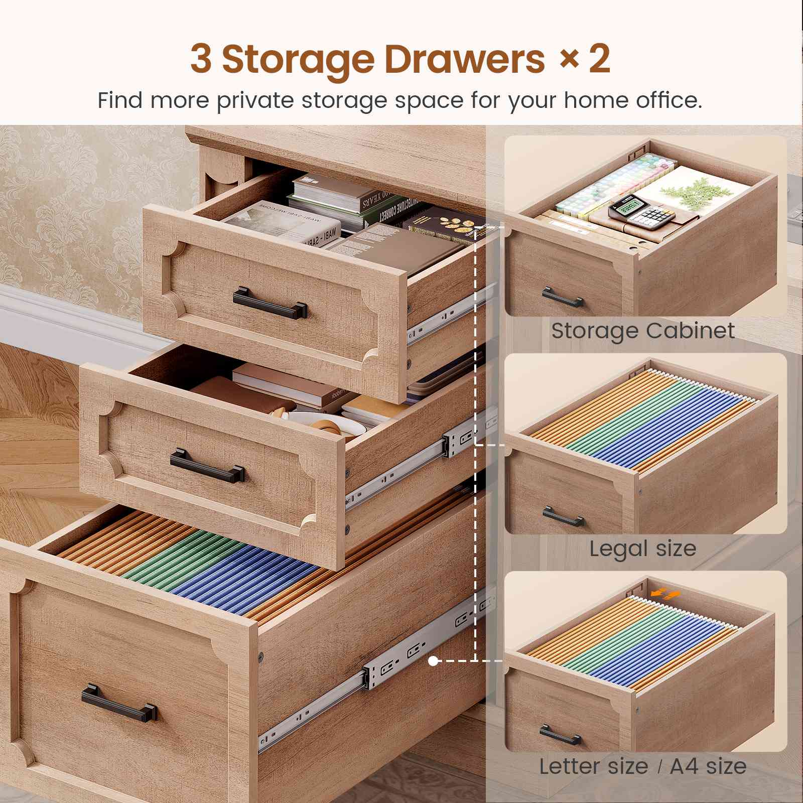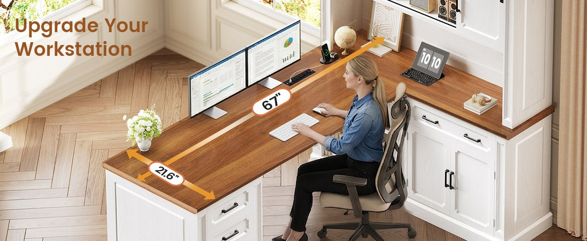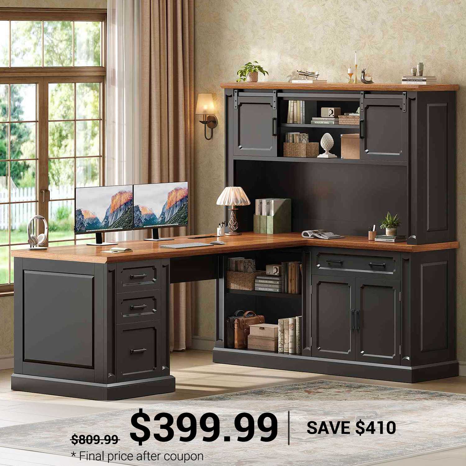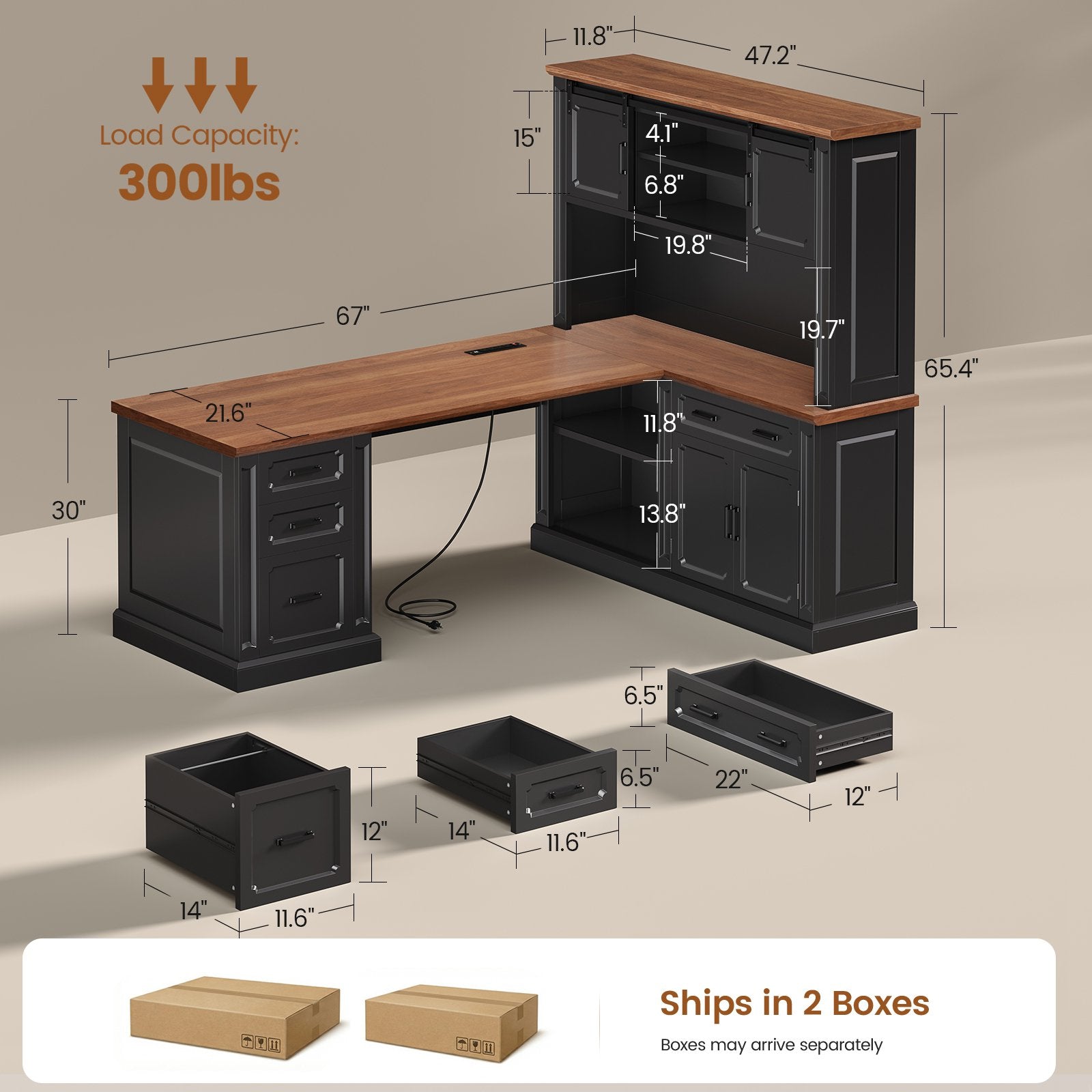 •【Ample storage space】This L-shaped desk with hutch features four storage drawers, including a file drawer that can hold three different file sizes. It also includes four open shelves, a storage cabinet, and two sliding doors, providing convenient and ample storage space. The spacious desktop (67 inches long and 47.2 inches deep) can accommodate two desktop computers and a laptop, making it ideal for keeping your living room, bedroom, or office tidy and organized.
