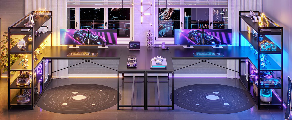 •【L Shaped Gaming Desk】 L shaped gaming desk comes with a power outlet, LED lights, storage shelves, CPU Stand, a computer desk that can hold 2 monitors, storage shelves. The gaming desk could hold 2 desktop computers and 1 notebook computer. An ideal corner computer desk for small rooms to create excellent home office space.