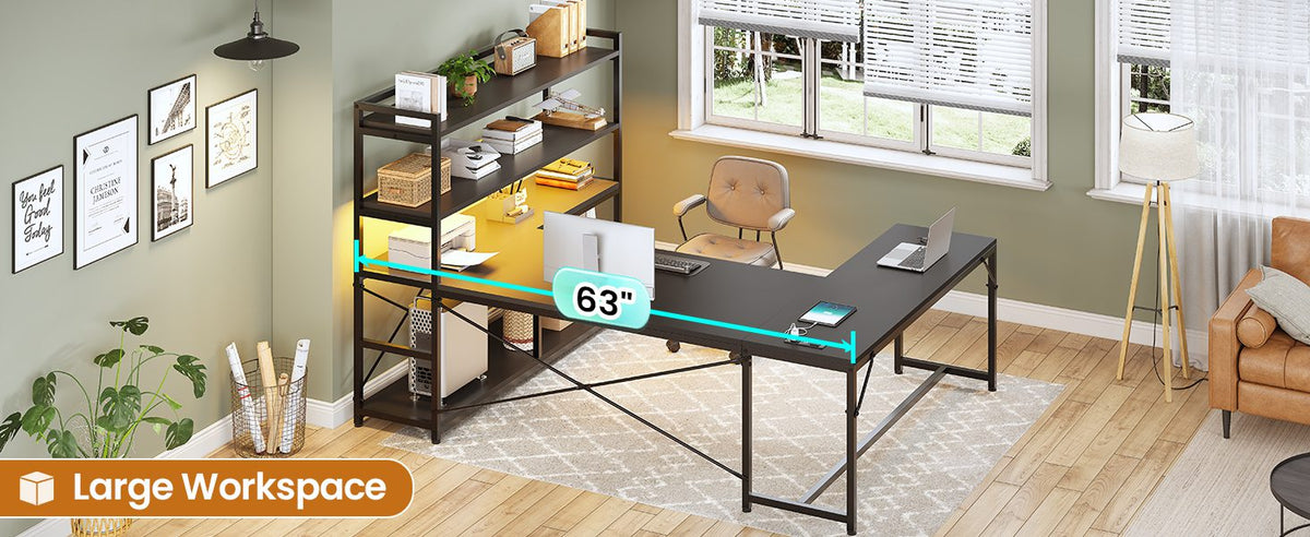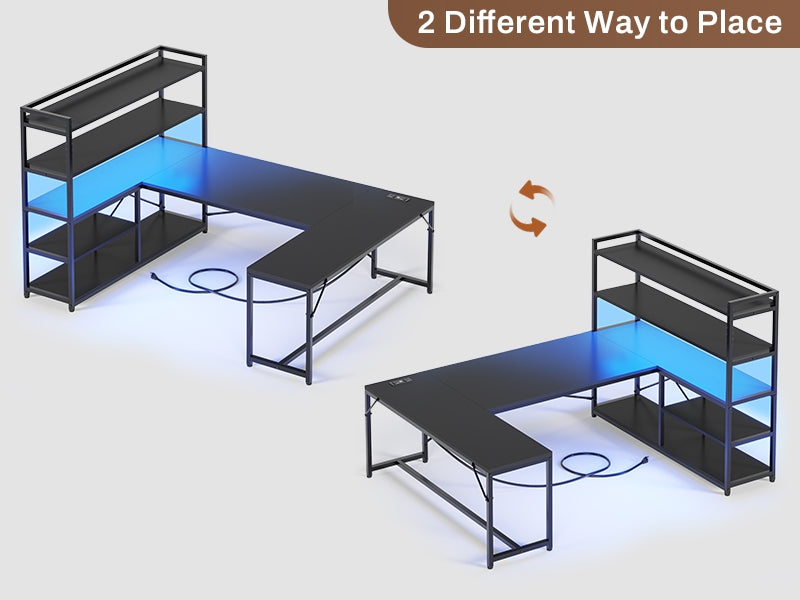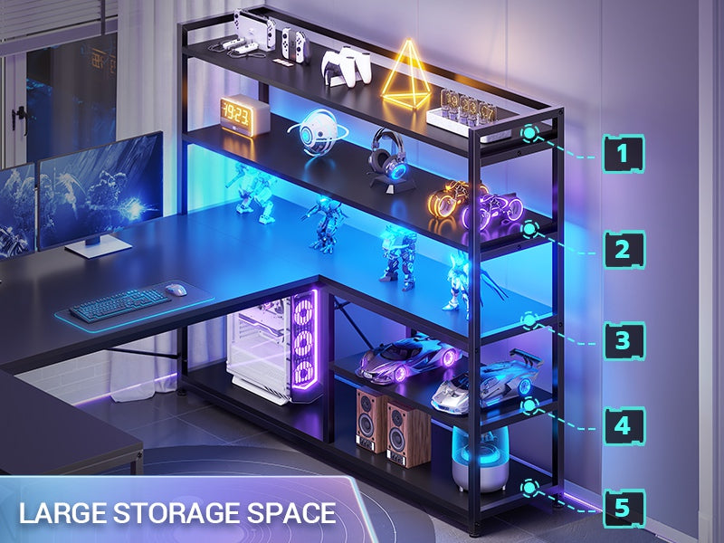 【L Shaped Gaming Desk】 L shaped gaming desk comes with a power outlet, LED lights, storage shelves, CPU Stand, a computer desk that can hold 2 monitors, storage shelves. The gaming desk could hold 2 desktop computers and 1 notebook computer. An ideal corner computer desk for small rooms to create excellent home office space. 【Ample Storage Space】Coming with 5-tier storage shelves with powerful storage space. The 5-tier bookshelf can place files, books, leaving spacious space for writing, paperwork and other home office activities. This l shaped computer desk provides enough room to study, work or other office activities. 【Reversible Design】5-tier bookshelf can be placed on either the left or right side, allowing you to customize the l shaped gaming desk to suit your needs. An ideal corner gaming desk for small rooms or limited spaces to create excellent home office space. 【 Charging Port】Our charging station includes 2-Outlet & 2 USB Ports to provide power for up to 4 devices simultaneously. Power outlet allows you to charge cell phones, tablets, notebooks, etc. This 63 inch l shaped gaming desk offers ample workspace for home offices or gaming accessories. 【Cool & Smart Led Light】The corner gaming desk comes with RGB LED light, remote control via APP, Over 60000 colors, and 29 flashing modes for you to choose from. Led lights with music sync function, built-in sensitivity adjustable mic, led light color will change with the rhythm of the sound and music. This l-shaped gaming desk can help you play games in your home offices.
