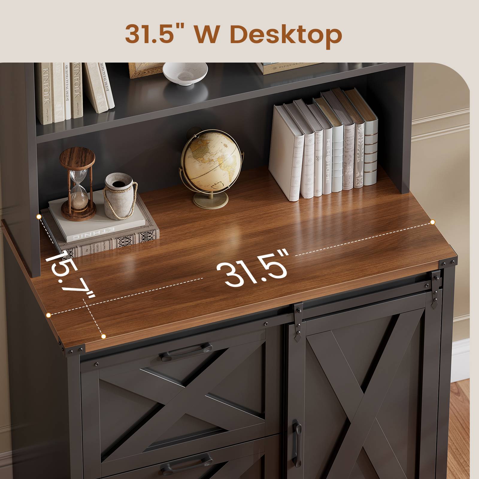 • Farmhouse Style Design: Stylish rustic look with drawers and cabinet storage.