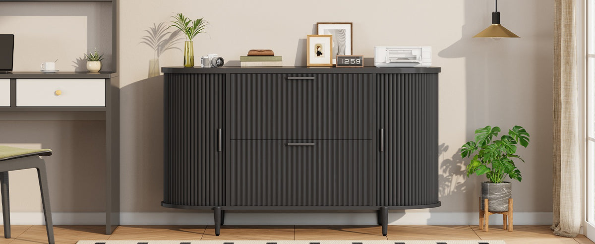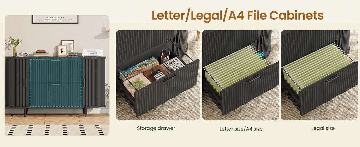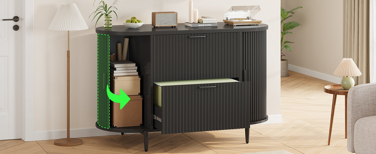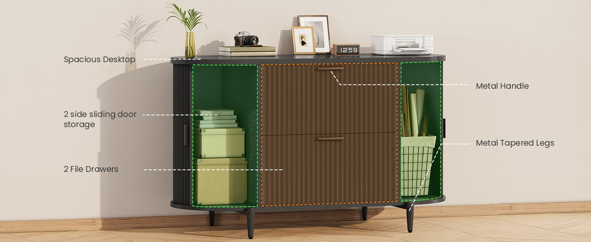 •【Ample Storage Space】The storage cabinets on both sides of this file cabinet feature elegant curved sliding doors for easy storage and access of daily items. The design of the curved storage cabinets on both sides provides additional storage space for stationery, decorations or office supplies while maintaining a neat appearance.