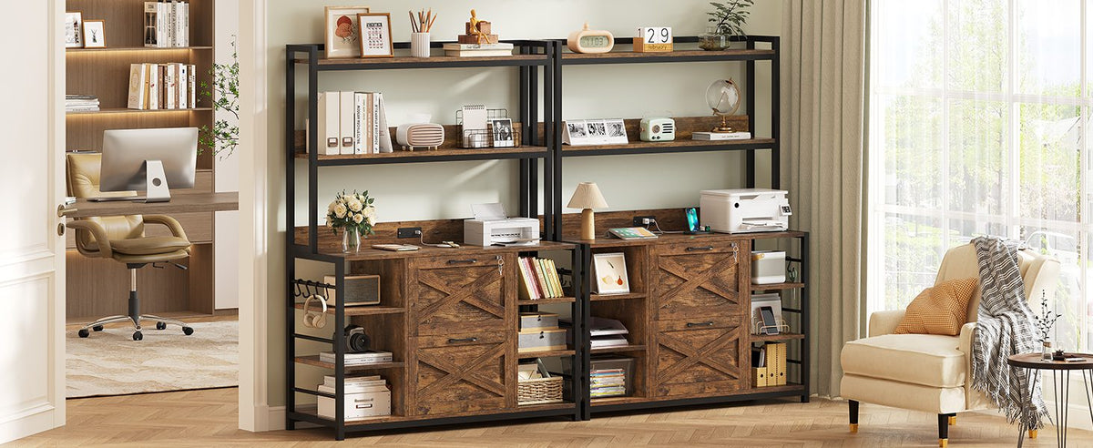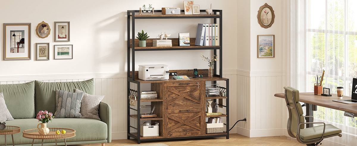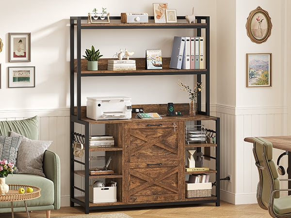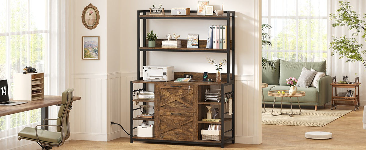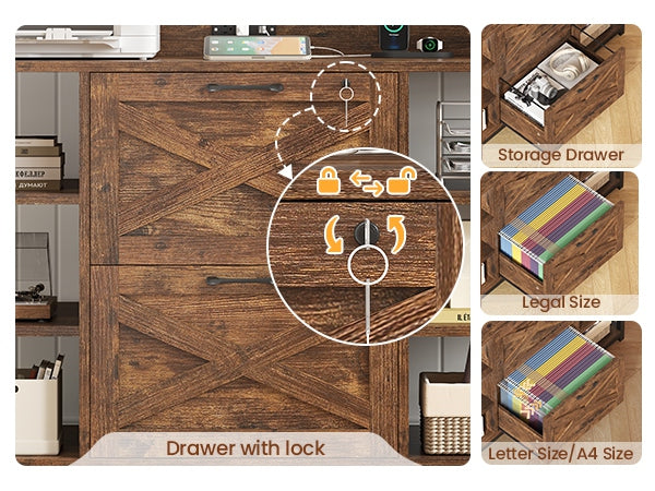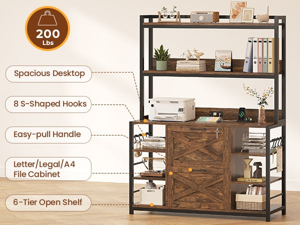 【File Cabinet with Power Strips】The home office file cabinet is equipped with 2 sockets and 2 USB ports to power up to 4 devices at the same time. The desktop size is 37.8 inches, which is large enough to use 2 machines at the same time, such as printers, scanners, copiers, laptops or other office electronic devices. 【Large Drawers】The lateral file cabinet is equipped with a file drawer with natural rattan for hanging files, keeping your files organized. There are three adjustable drawer spaces, and you can choose the file hanging rod position to accommodate legal size, letter size or A4 size. In addition, it is equipped with a lock and key for you to ensure that your files are safe and private. 【Ample Storage Space】The file cabinet is equipped with 6-layer open storage shelves, providing ample storage space for office supplies, allowing you to arrange files and decorations in a stylish way. Equipped with 8 hooks on the side, you can hang briefcases, mugs, headphones, umbrellas, etc. 【High-quality Materials】The home office file cabinet is made of high-quality particleboard and a sturdy steel frame, which can bear up to 200 pounds. The walnut color surface and natural rattan make up this unique file cabinet that is suitable for any home. 【Sturdy Construction】This file cabinet comes with an anti-tip device to fix the cabinet to the wall to help prevent tipping. With such a sturdy filing cabinet, you don't have to worry about safety issues at all.