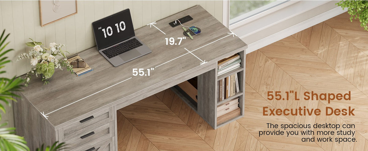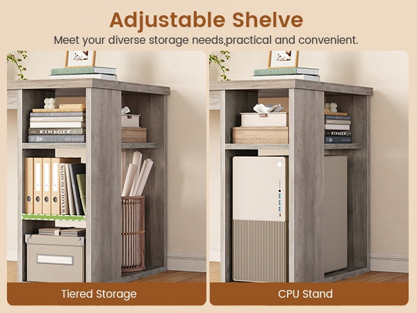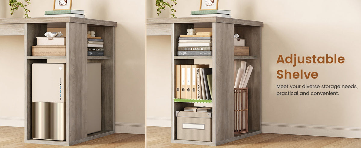•【Ample storage space】The desktop is 55.1 inches long and 19.7 inches deep. The spacious desktop provides more space for office activities. The open storage rack on the side can be used to store miscellaneous office supplies. The lower layer board can be freely adjusted in height, allowing you to flexibly adjust according to different storage needs for convenient storage. Multiple storage designs for better storage of items.