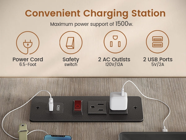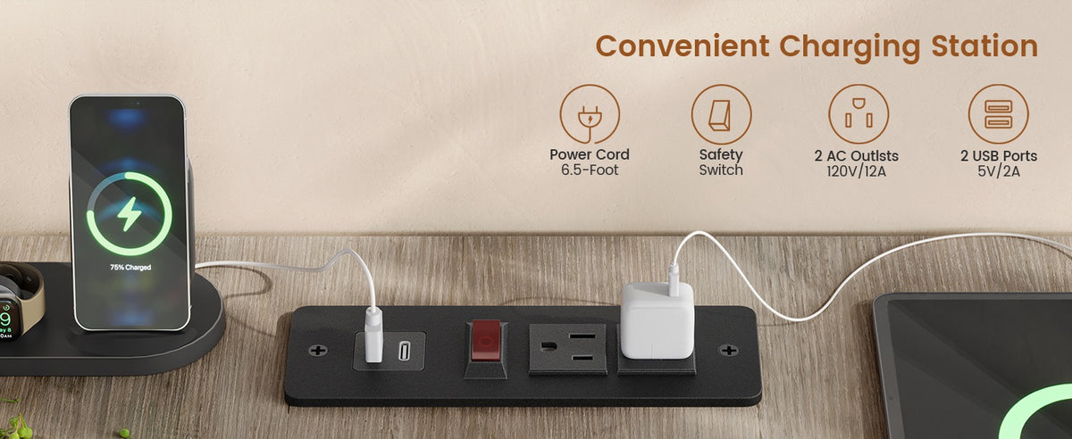 •【Charging Port】Our charging station is equipped with 2 sockets and 2 USB ports, which can power up to 4 devices simultaneously. In addition, it is equipped with a power switch that can cut off power with one click, ensuring electrical safety and enhancing safety. The power socket can charge devices such as mobile phones, tablets, and laptops simultaneously.