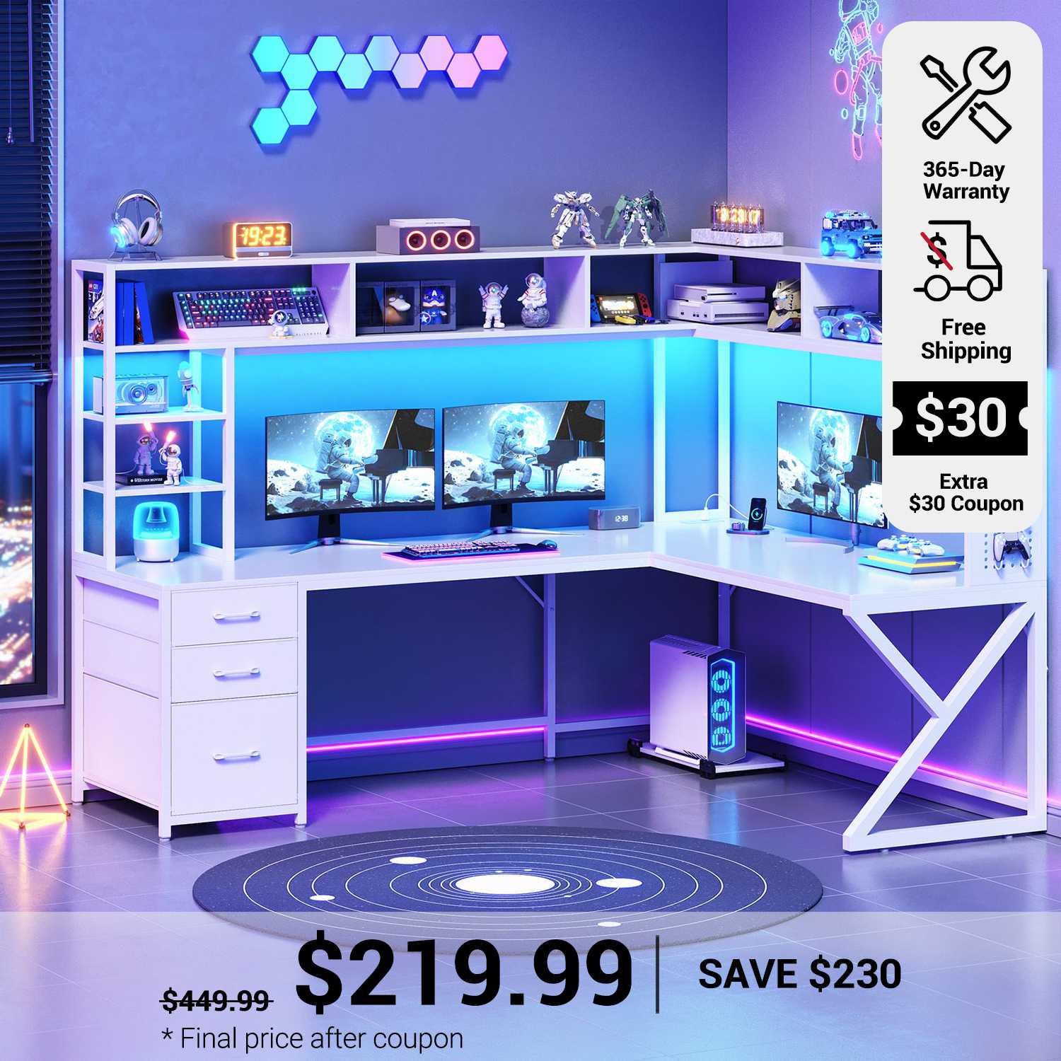 •【Power Outlet and Led Light】The L shaped computer desk includes a built-in power strip with 2 outlets and 2 USB Ports provides convenience for charging y. The l shaped gaming desk comes with RGB LED light strip, remote control via APP, Over 60000 colors and 29 flashing modes for your to choose.