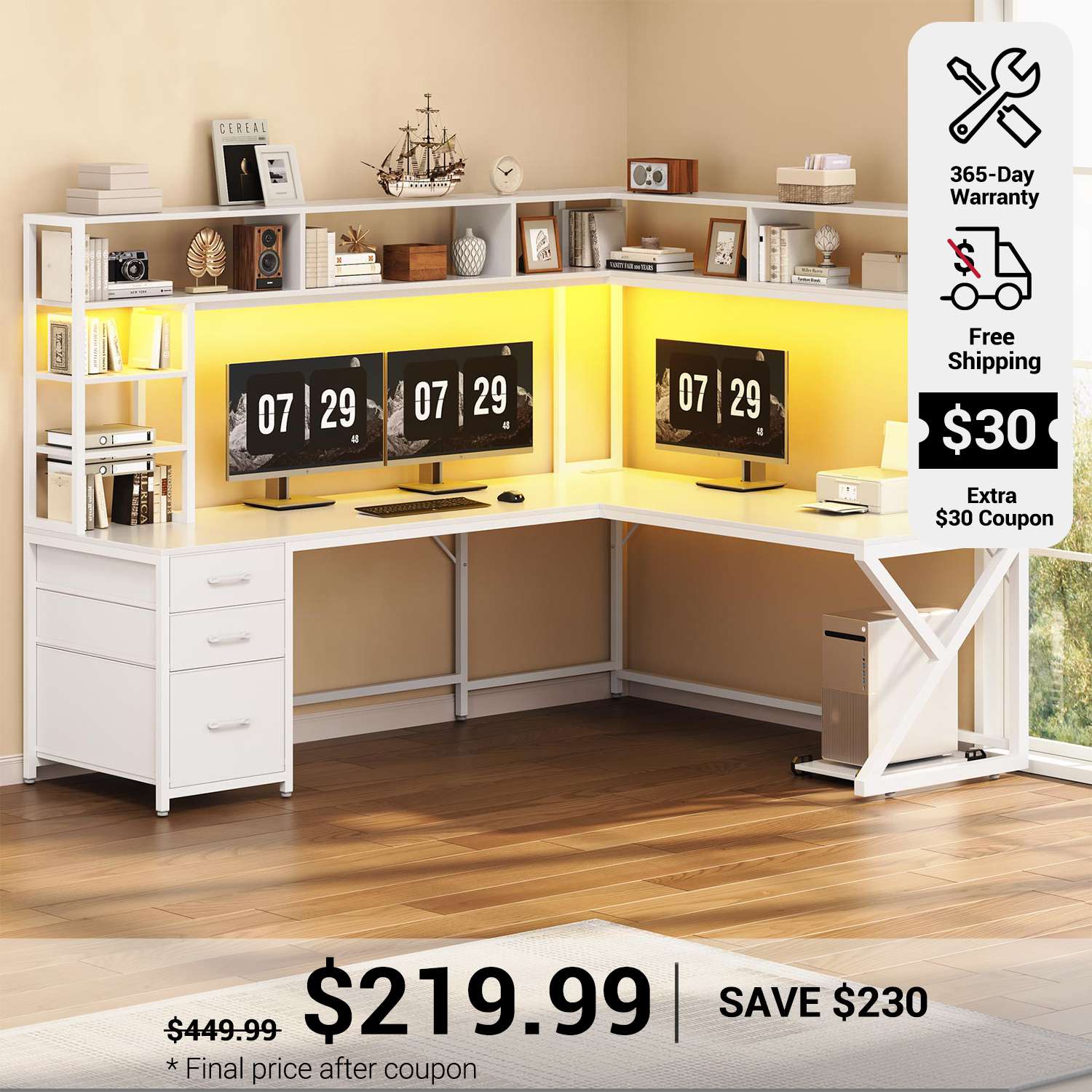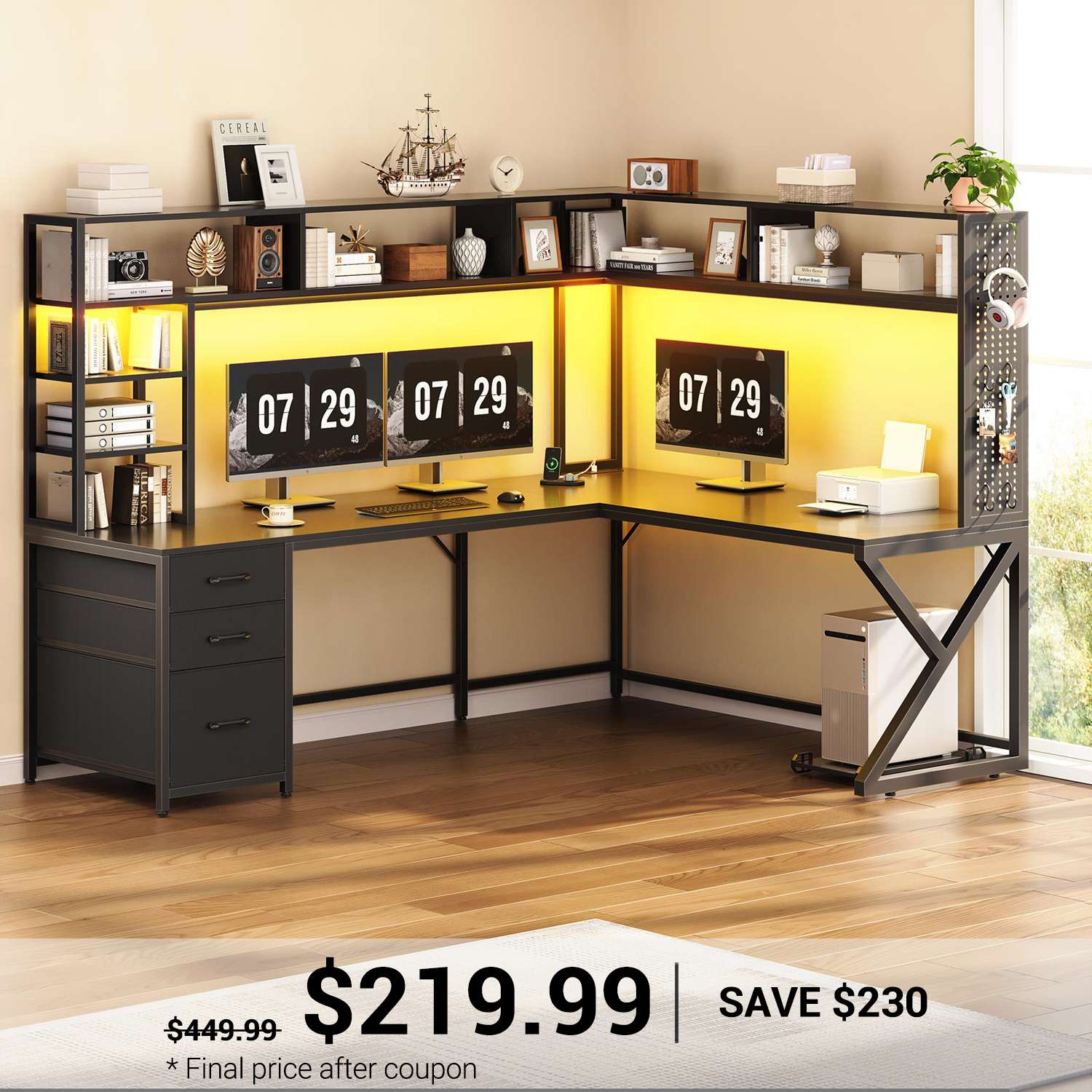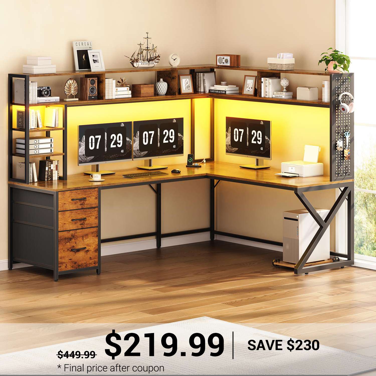 •【Large Storage Space】L shaped computer desk with 7 open shelves, 3 fabric drawers, 1 pegboard and 1 CPU stand. This 66.1" l shaped desk has 7 open shelves , which offer enough space to store your daily items, books, files, printer stand or game figure, collect trophies, and souvenirs.