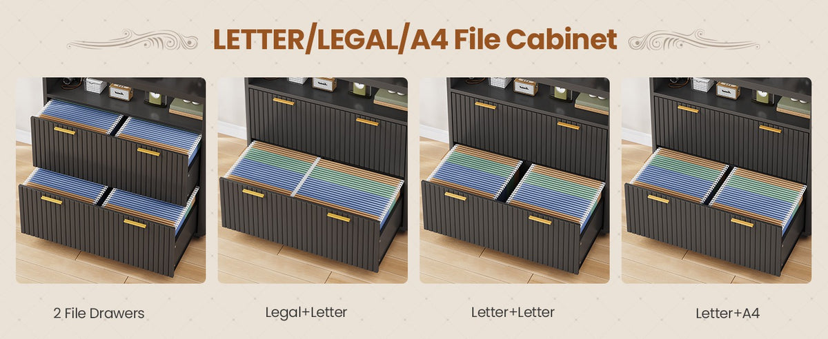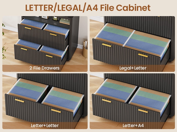 •【File Compatibility】Designed to accommodate various file sizes. Flexible hanging rods accommodates multiple sizes file: Legal + Letter Size/ Letter+ A4 Size/ Letter + Letter Size. No more hassle of finding the file cabinet for different file types. The 3-tier file cabinet with 2 drawers provides enough room to hold books, printer, photocopier, file for your home office.