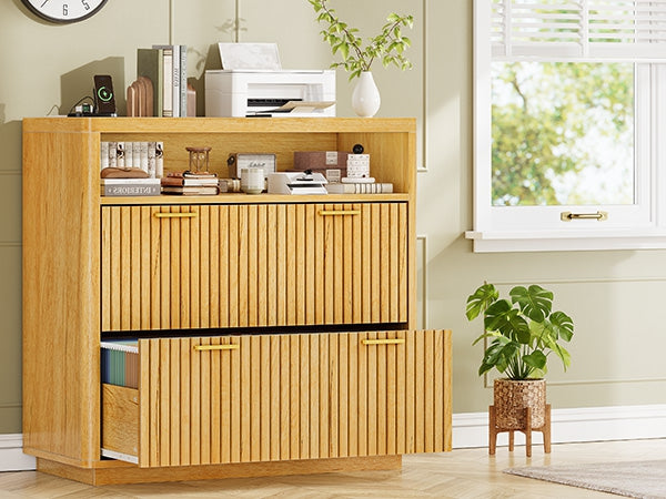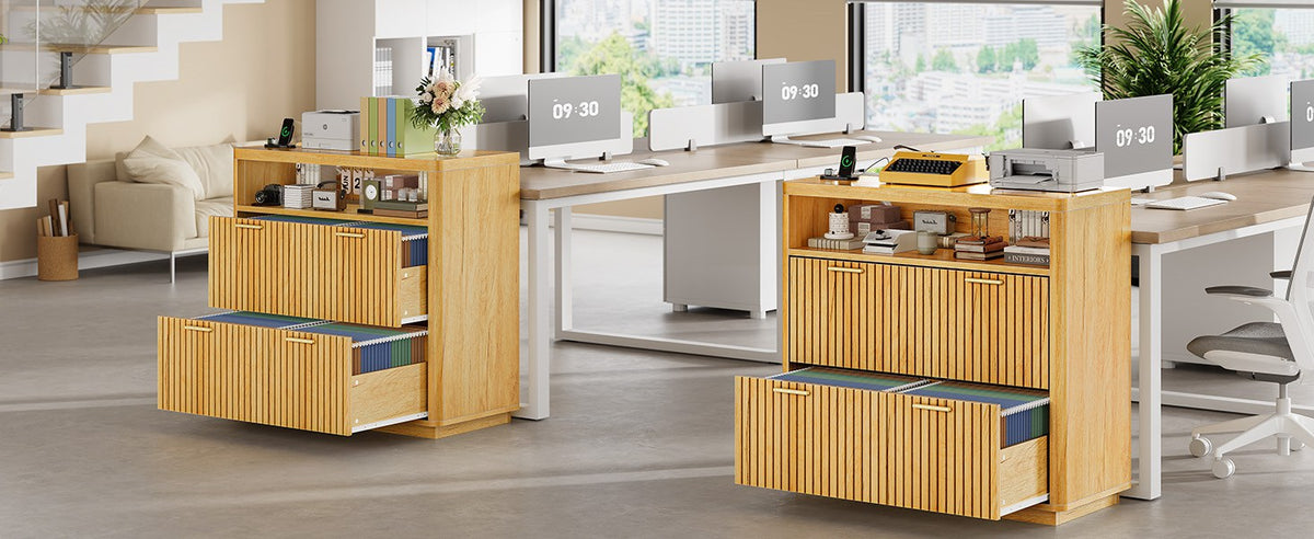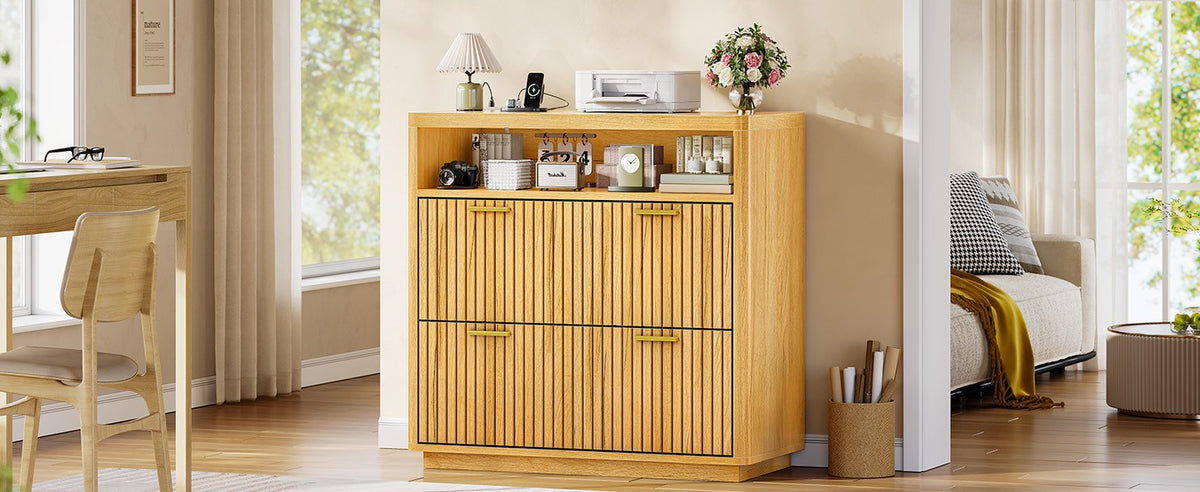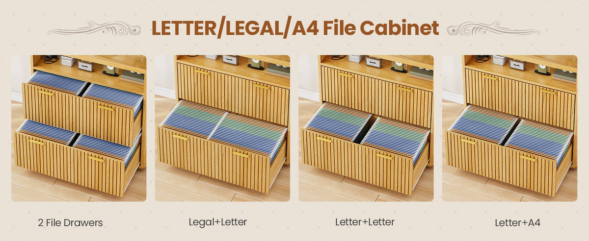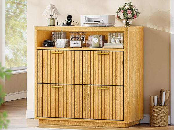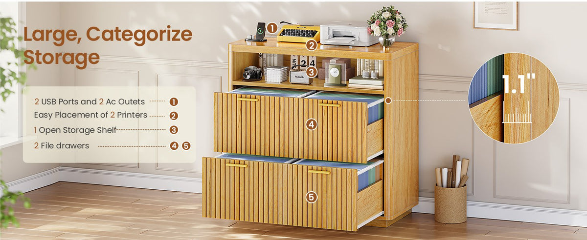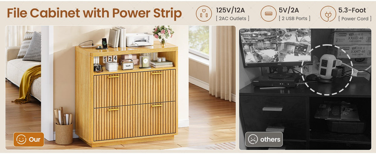 •【What Can You Get?】 The file cabinet has 2 fluted file drawers for Legal, Letter, A4 sizes standard file, power strip for charging 4 devices at the same time, spacious desktop(31.5"L) large enough for printers and scanners and open storage shelf. Filing cabinet that can be combined with any computer desk to form an L-shaped office area.