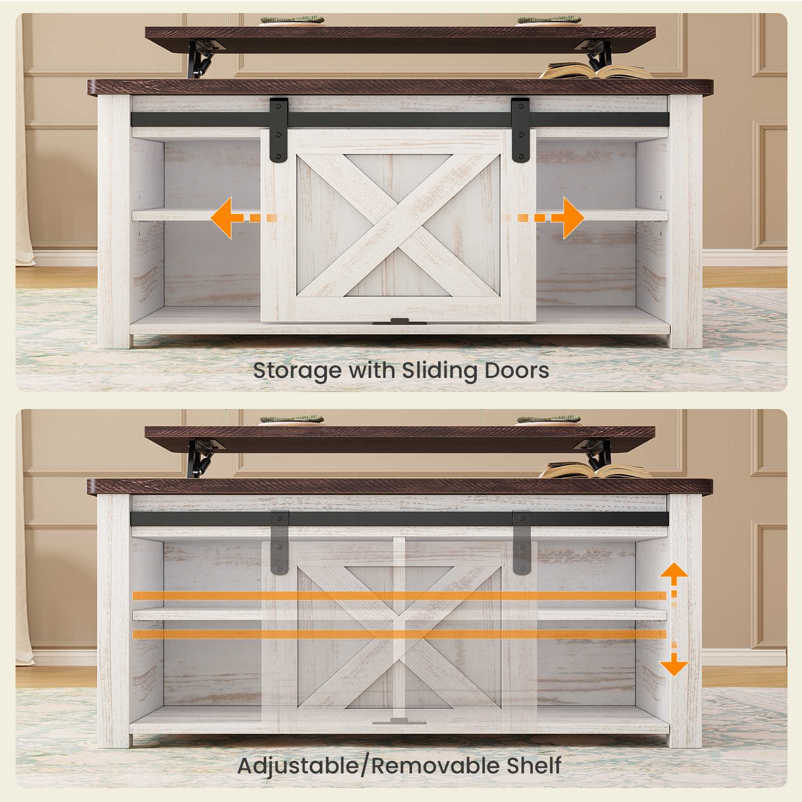•【Spacious Storage】This coffee table features a hidden storage compartment under the lift top, keeping all your living room essentials close at hand while keeping clutter at bay. The coffee table's 4 open compartments each feature removable, adjustable shelves (3 height adjustable), allowing you to customize your storage space