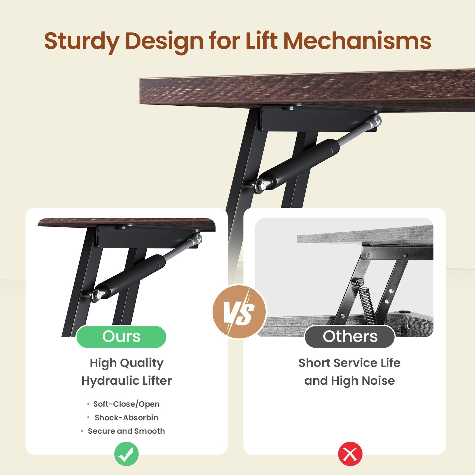 The coffee table experiences smooth and safe lifting with a high-quality lifting mechanism featuring gas struts. Raise the top of this coffee table from 19.7 inches to 25.4 inches and make it easy to work from home, enjoy a meal, do crafts, or play games while sitting comfortably on your couch